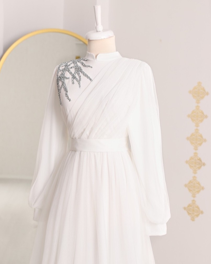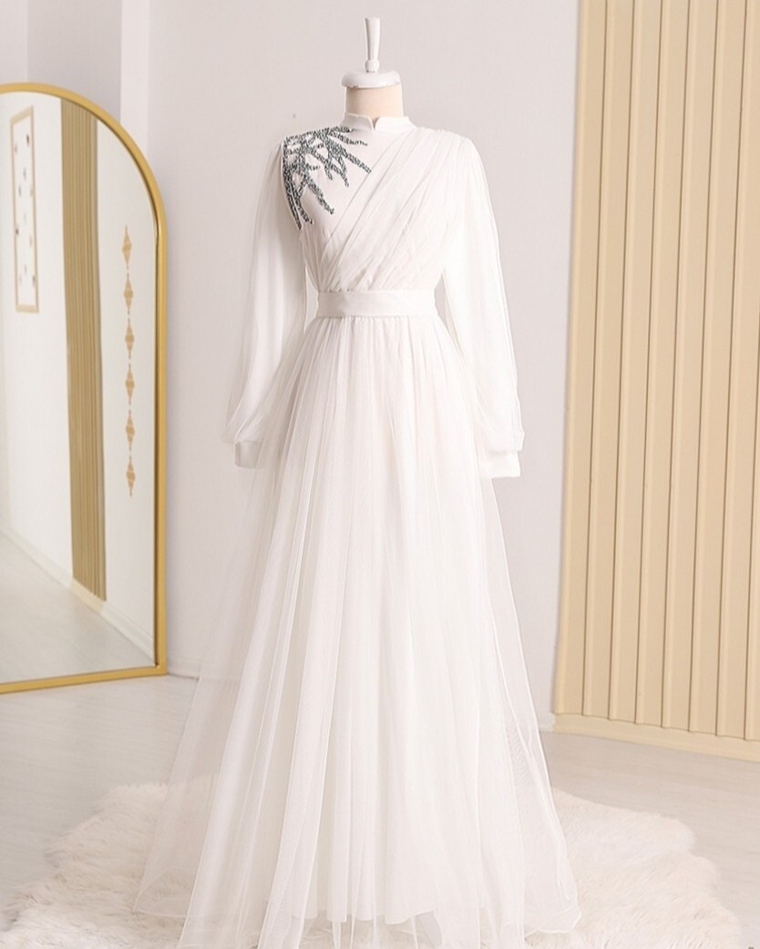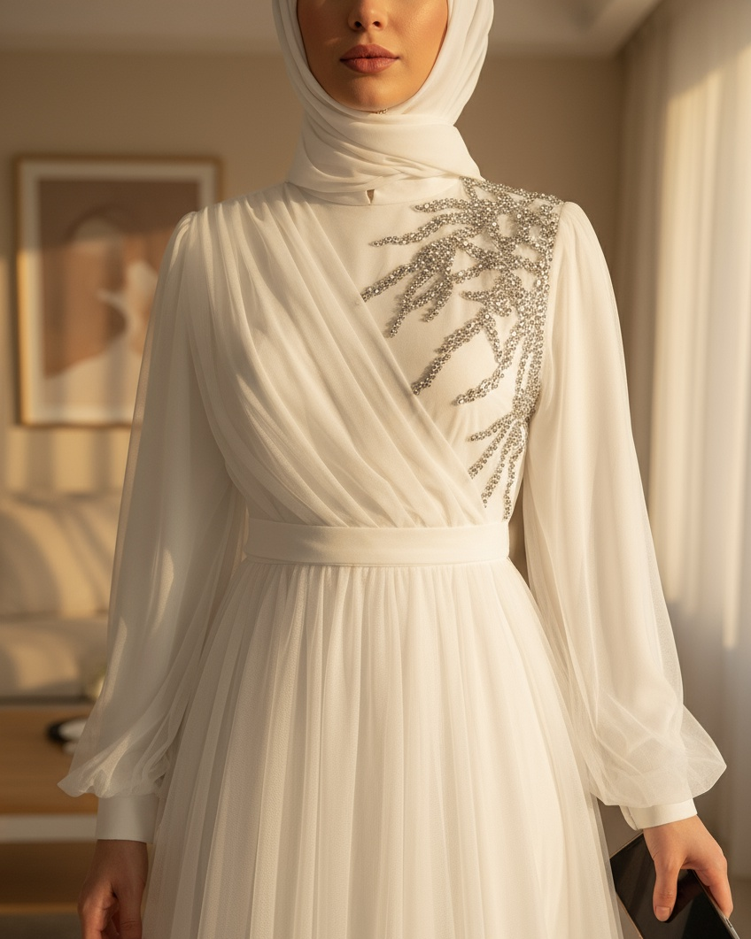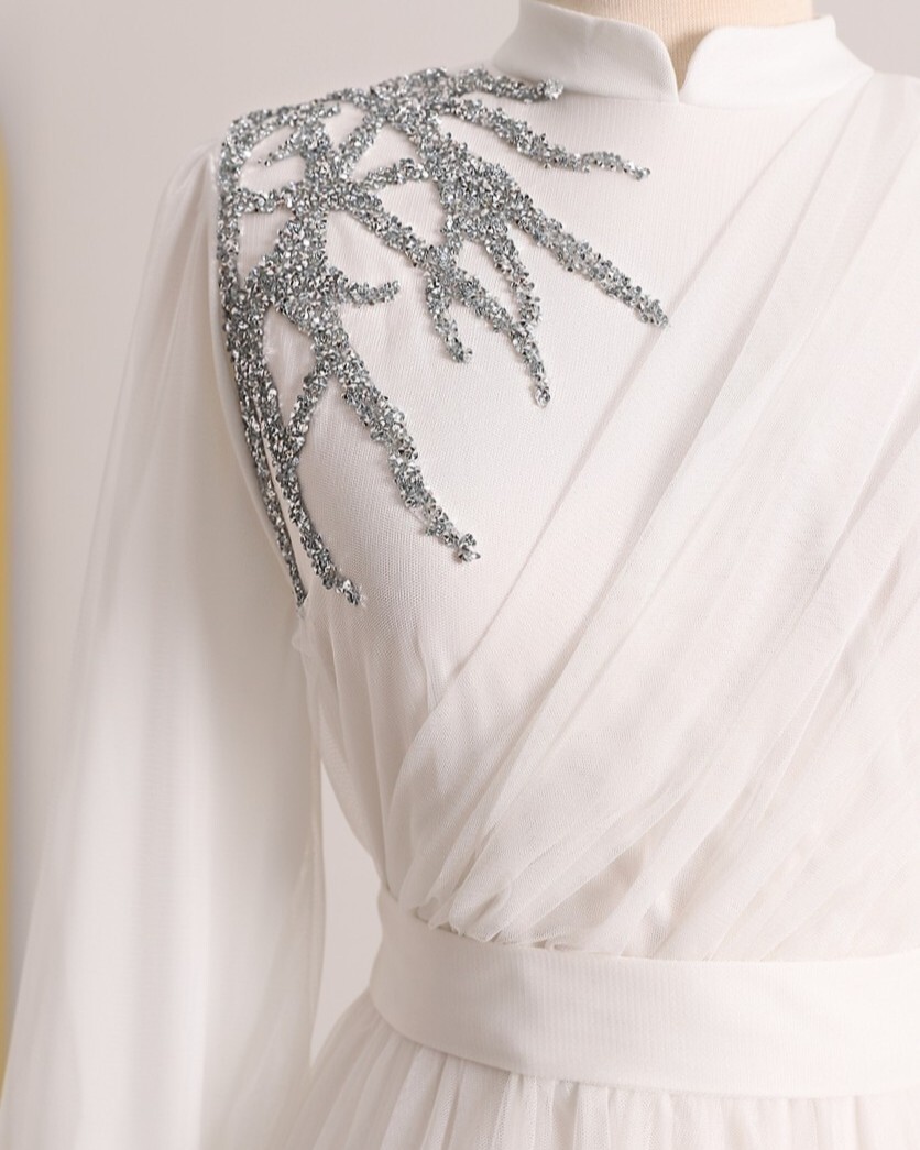 فستان سهرة من التول بحزام رايات بتفاصيل من الأحجار -أبيض