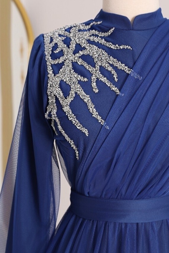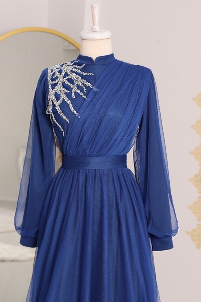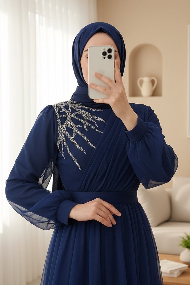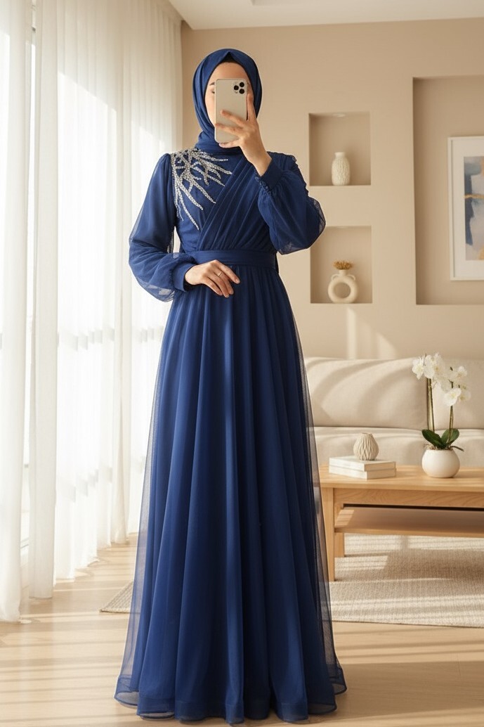 فستان سهرة من التول المُبطن بتفاصيل من الحجر من الأمام ، ومكسو بالرباط ، وياقة ، وحزام ، وسحاب على الظهر ، هو أحد أكثر القطع رواجًا في الموسم الجديد.