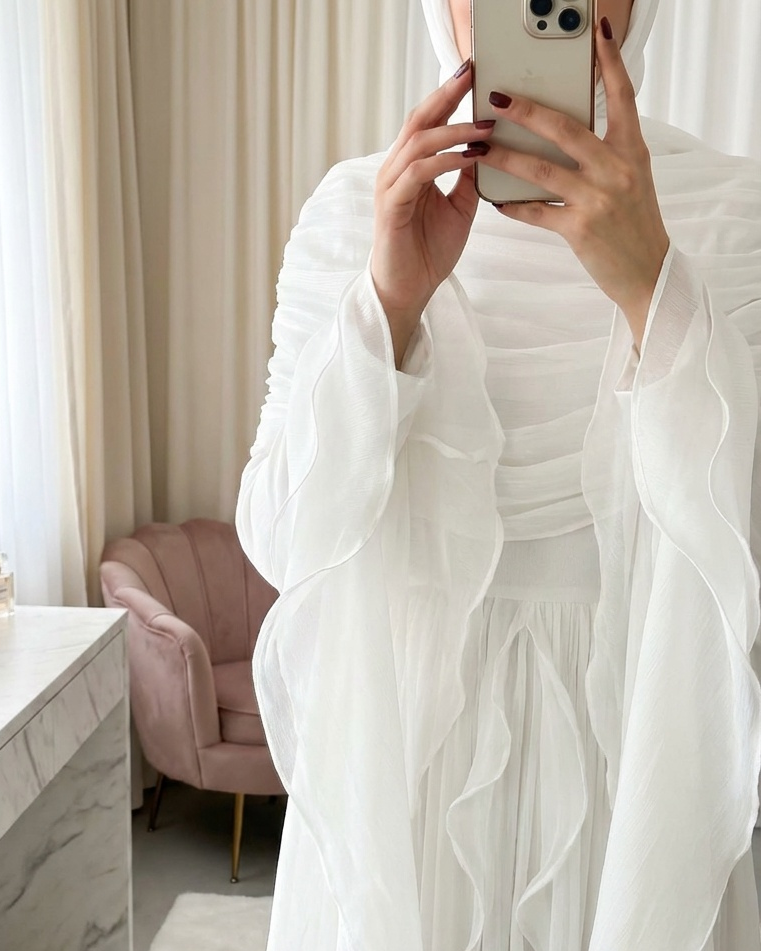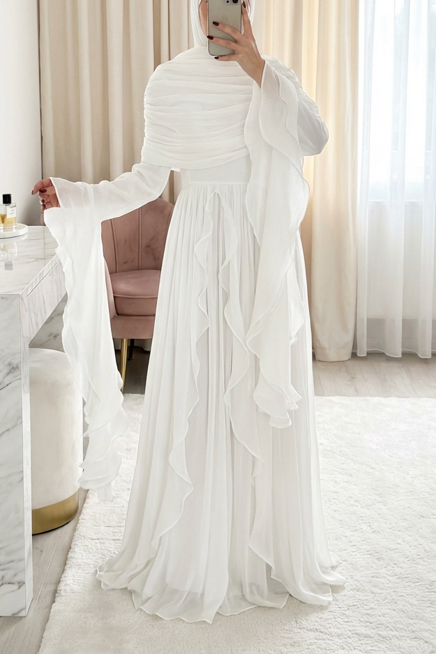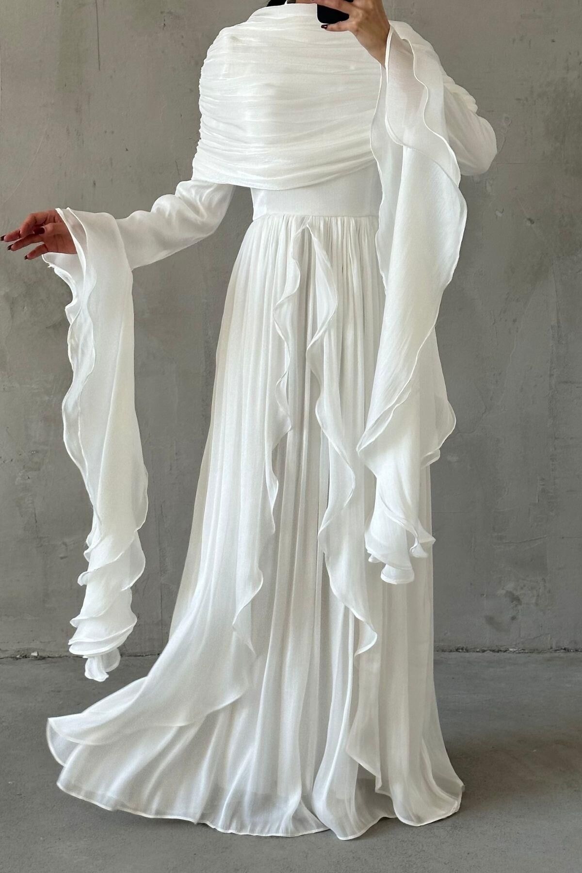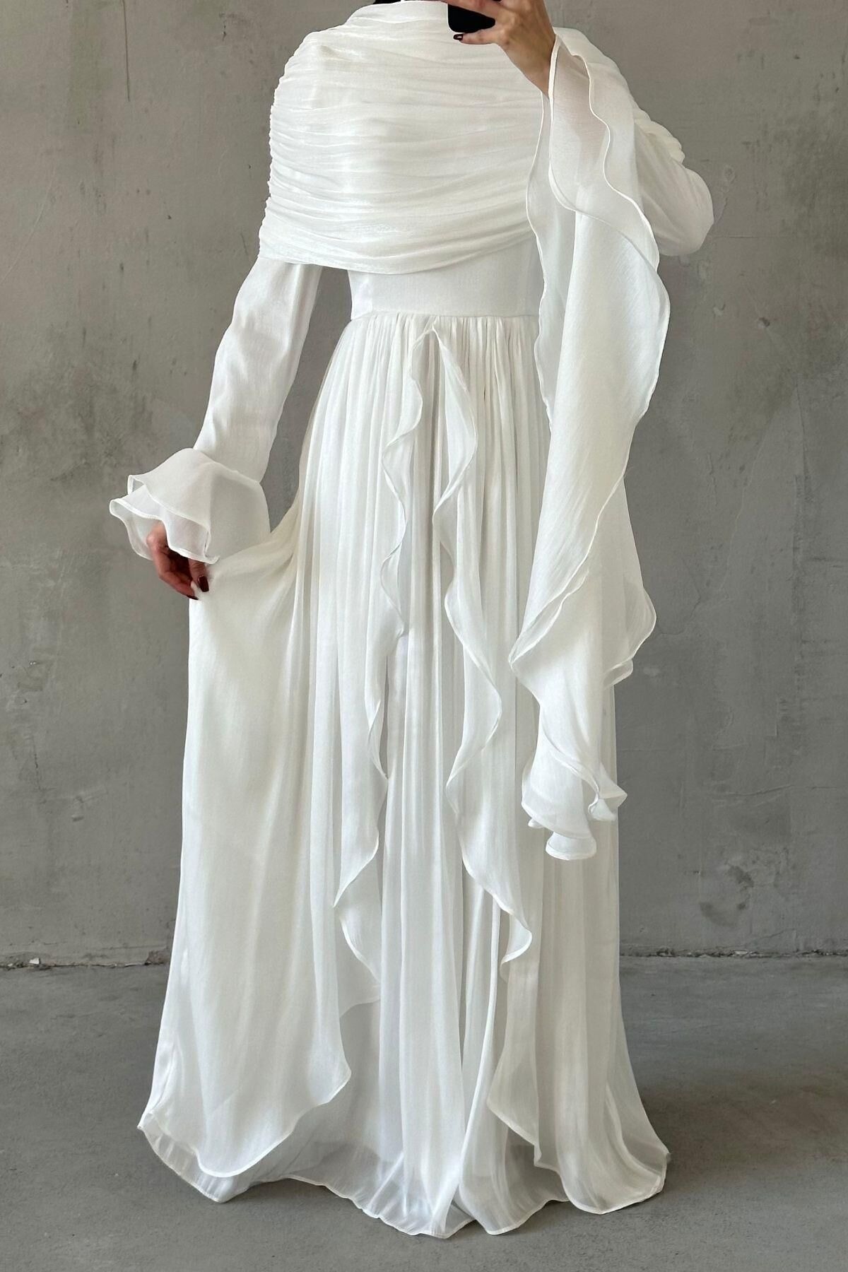 فستان سهرة حريري من الأورجانزا بدون حمالات ومُكشكش ومنسدل -أبيض سكري
