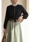 بلوزة قميص من قماش البوبلين بأكمام إسبانية وخصر بحزام -أسود