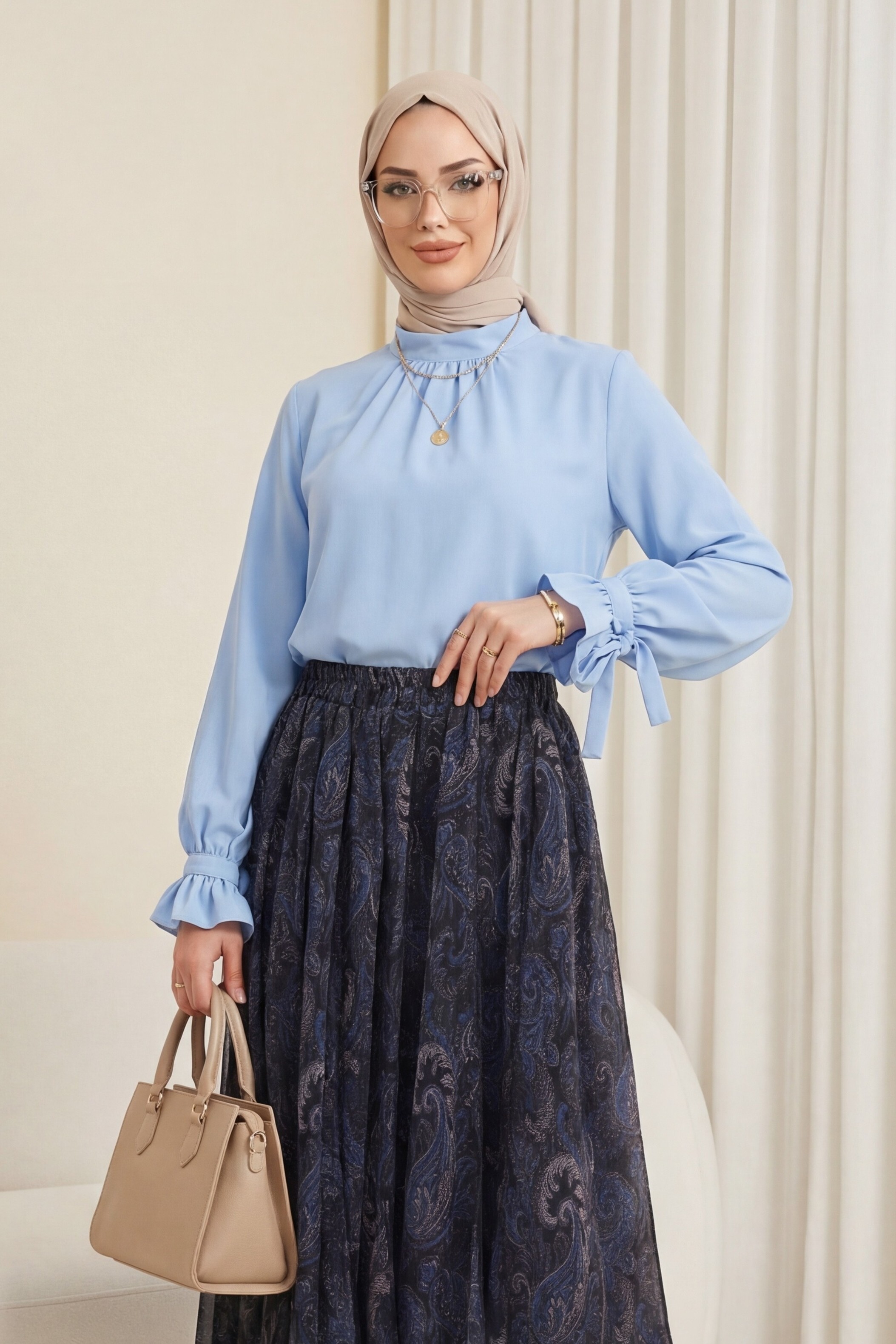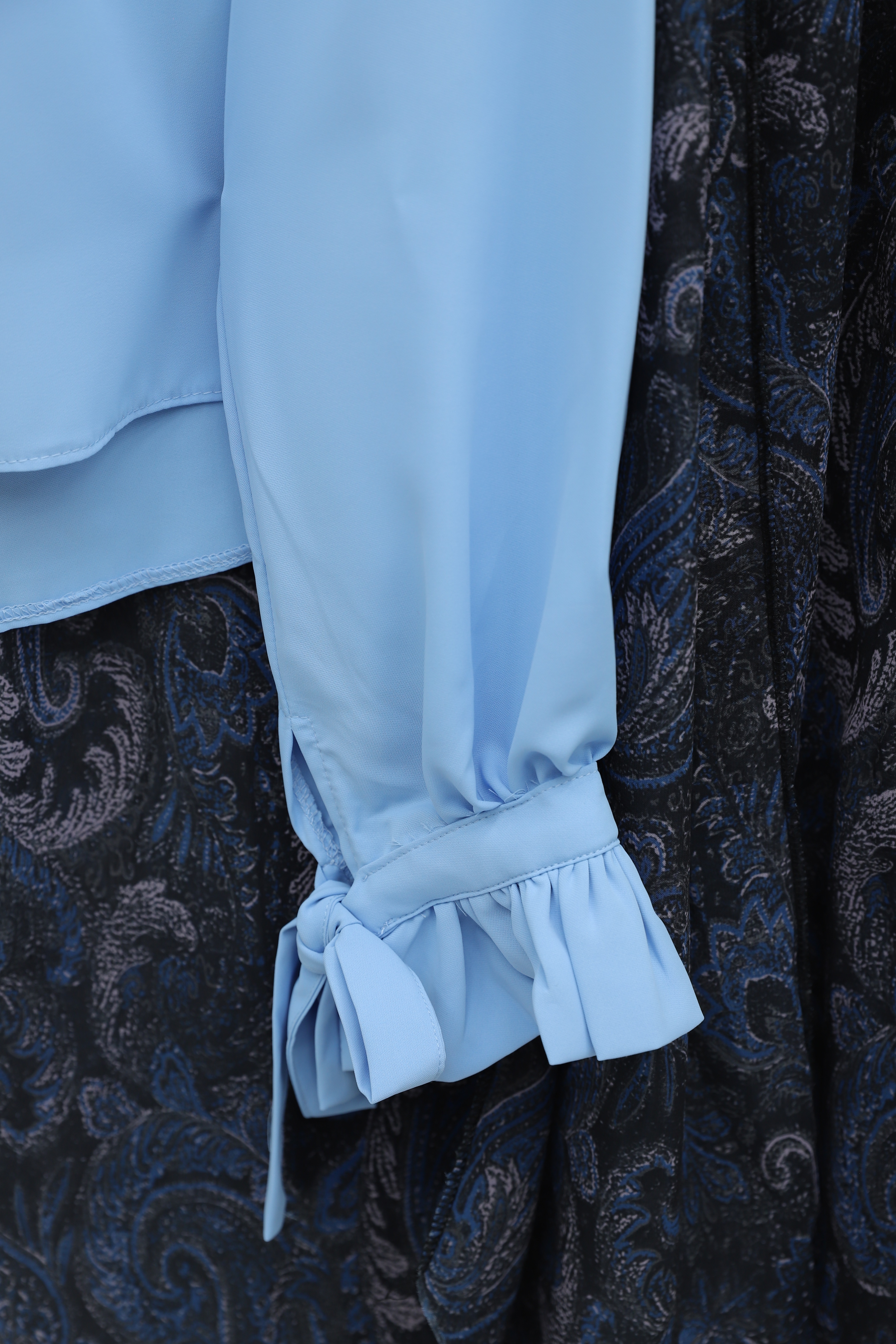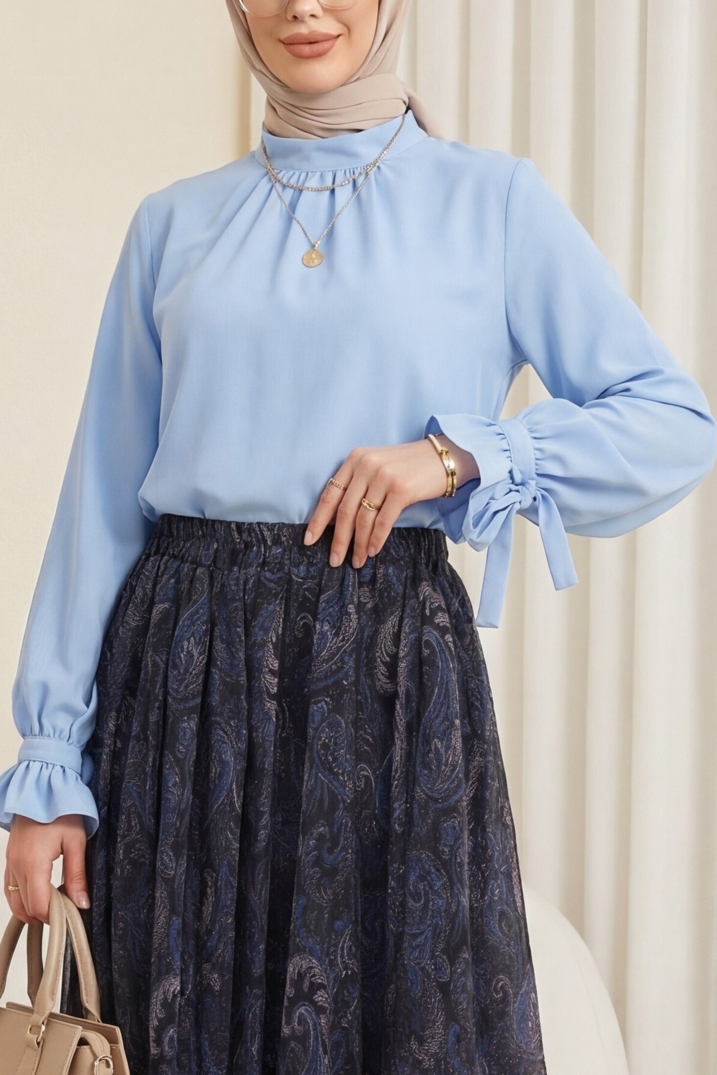 بلوزة من الكريب المستورد، ذات ياقة عالية وأكمام مكشكشة ورباط وسحاب خلفي. -ريشي