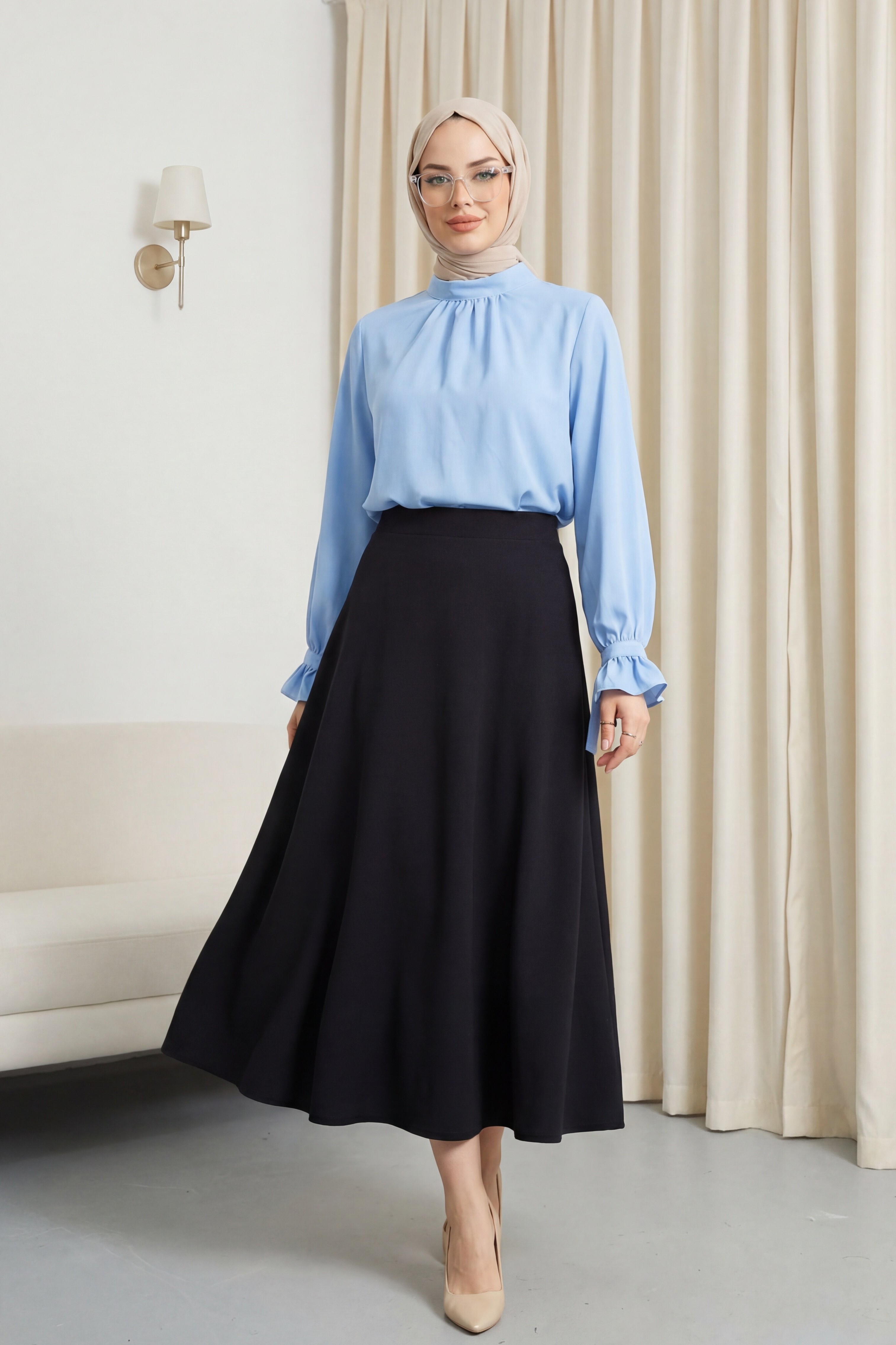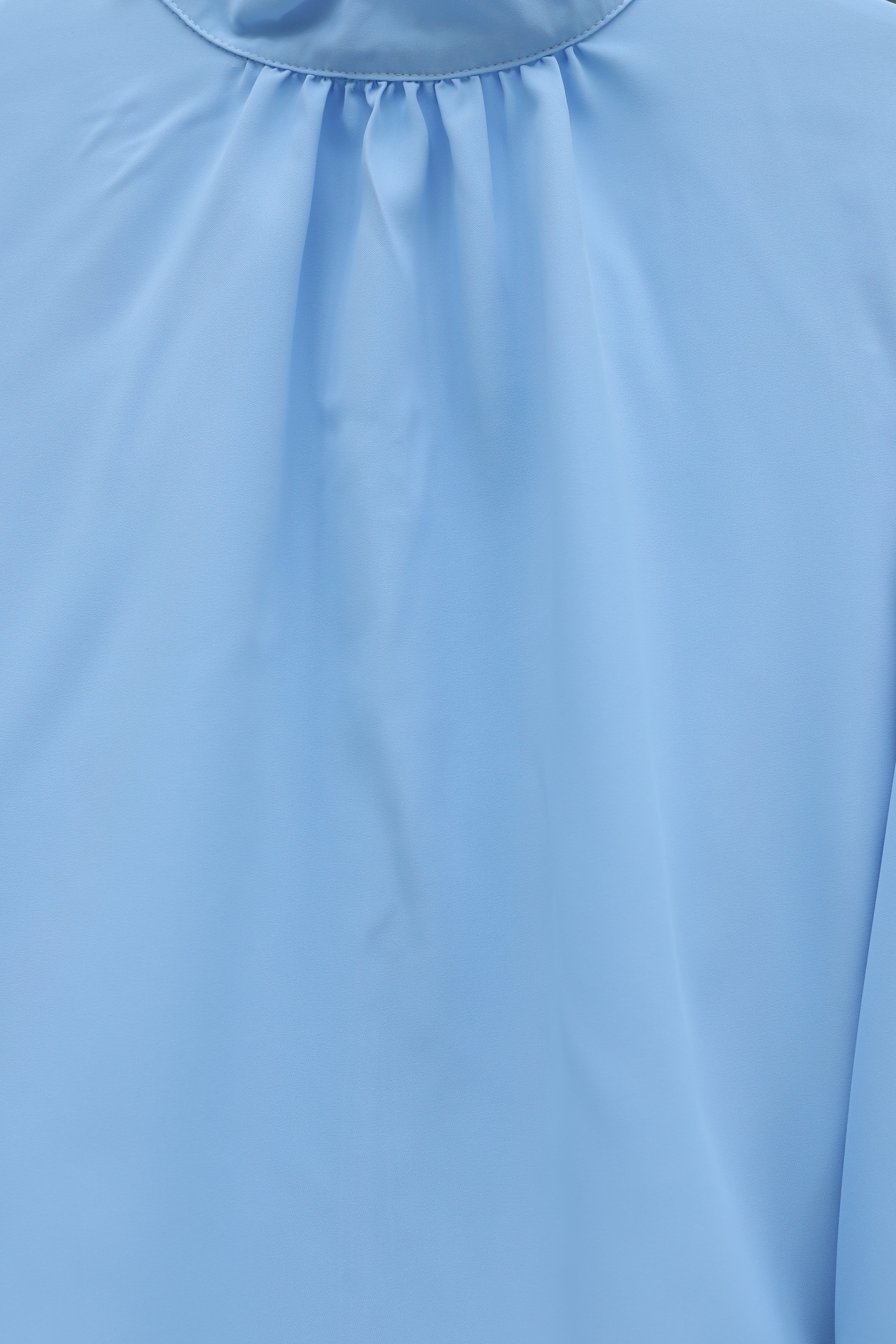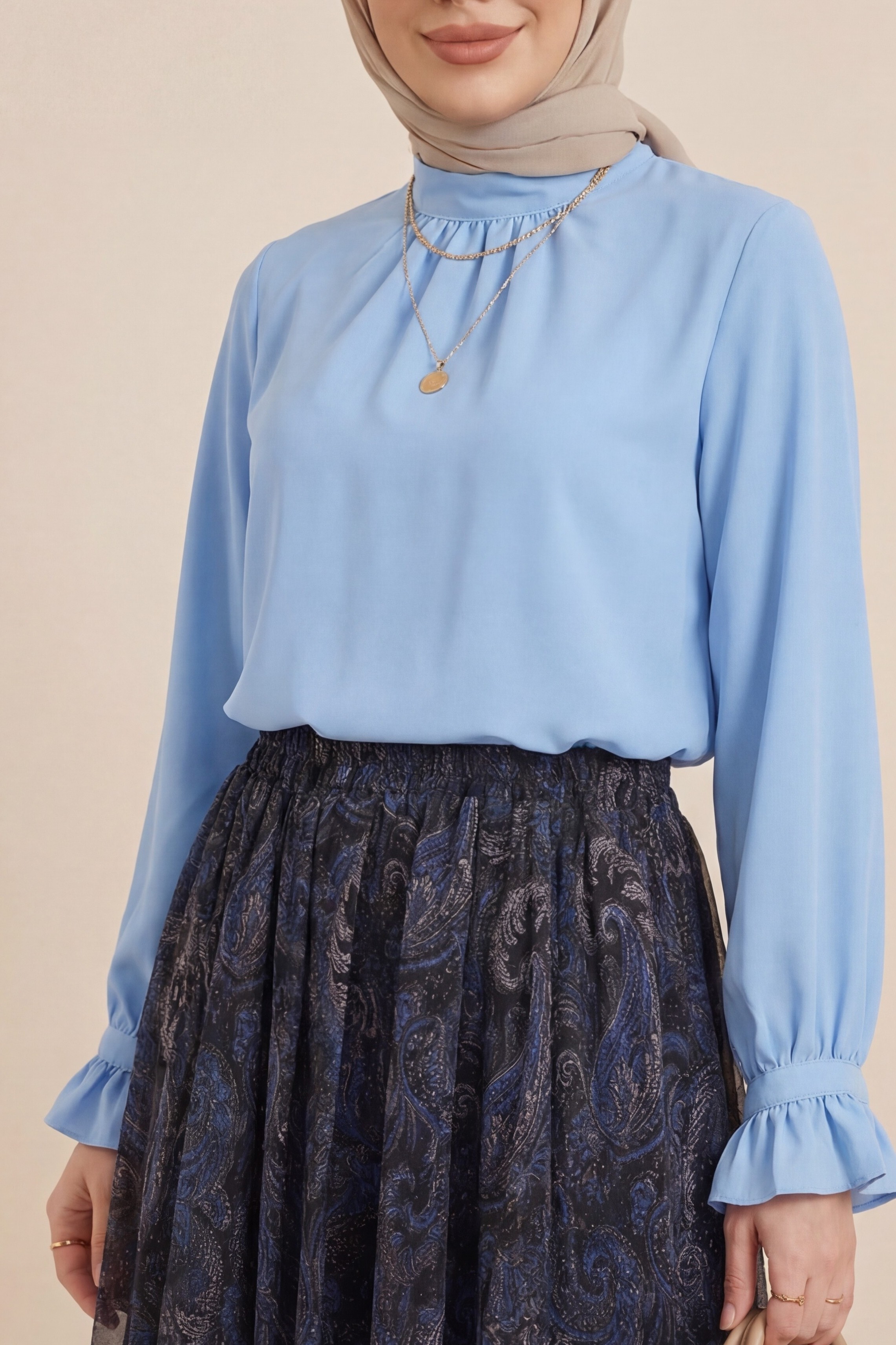 بلوزة من الكريب المستورد، ذات ياقة عالية وأكمام مكشكشة ورباط وسحاب خلفي. -ريشي