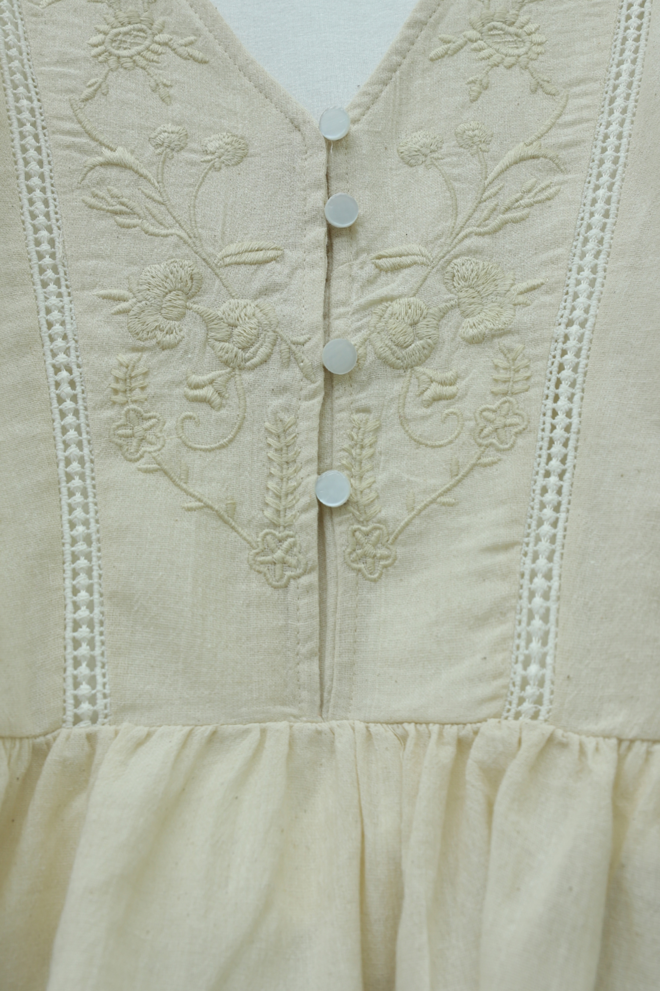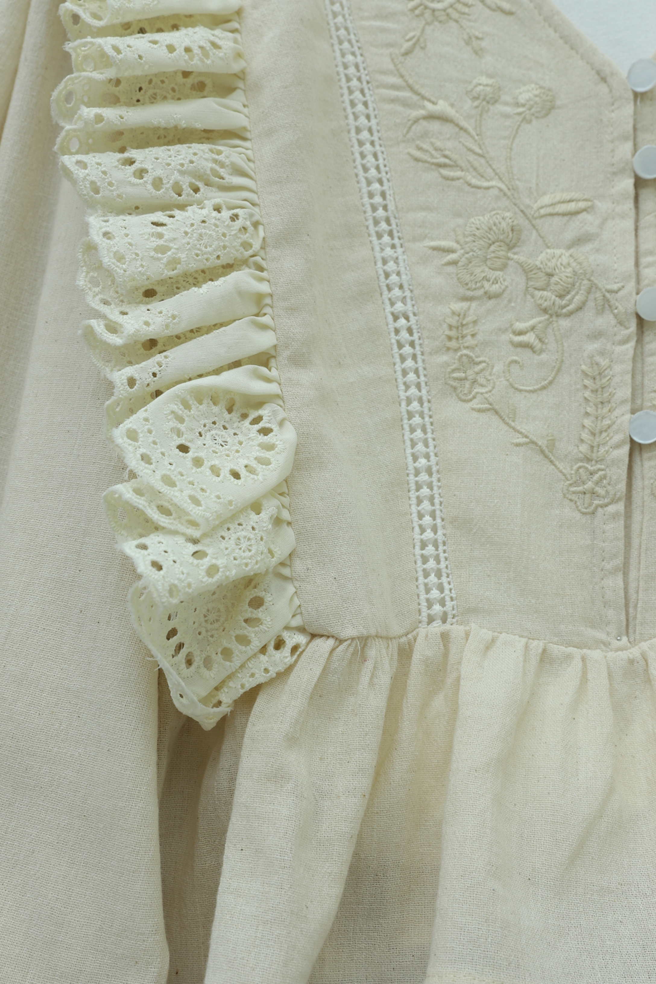 قميص كتان بأكمام بالون مطرزة بتفاصيل دانتيل وفتحة رقبة على شكل حرف V -اللون البيج