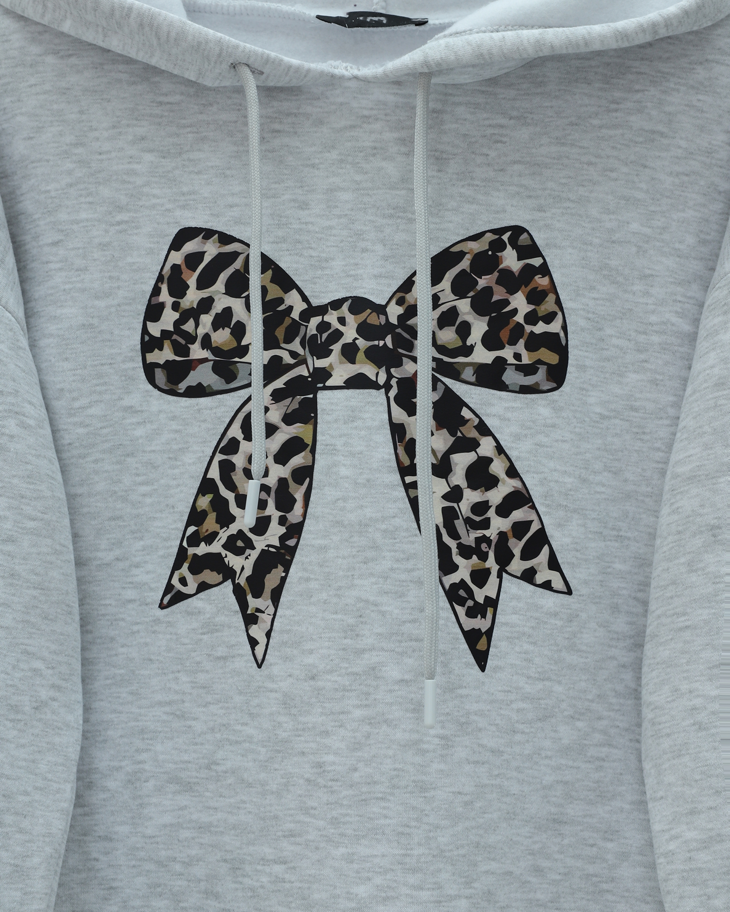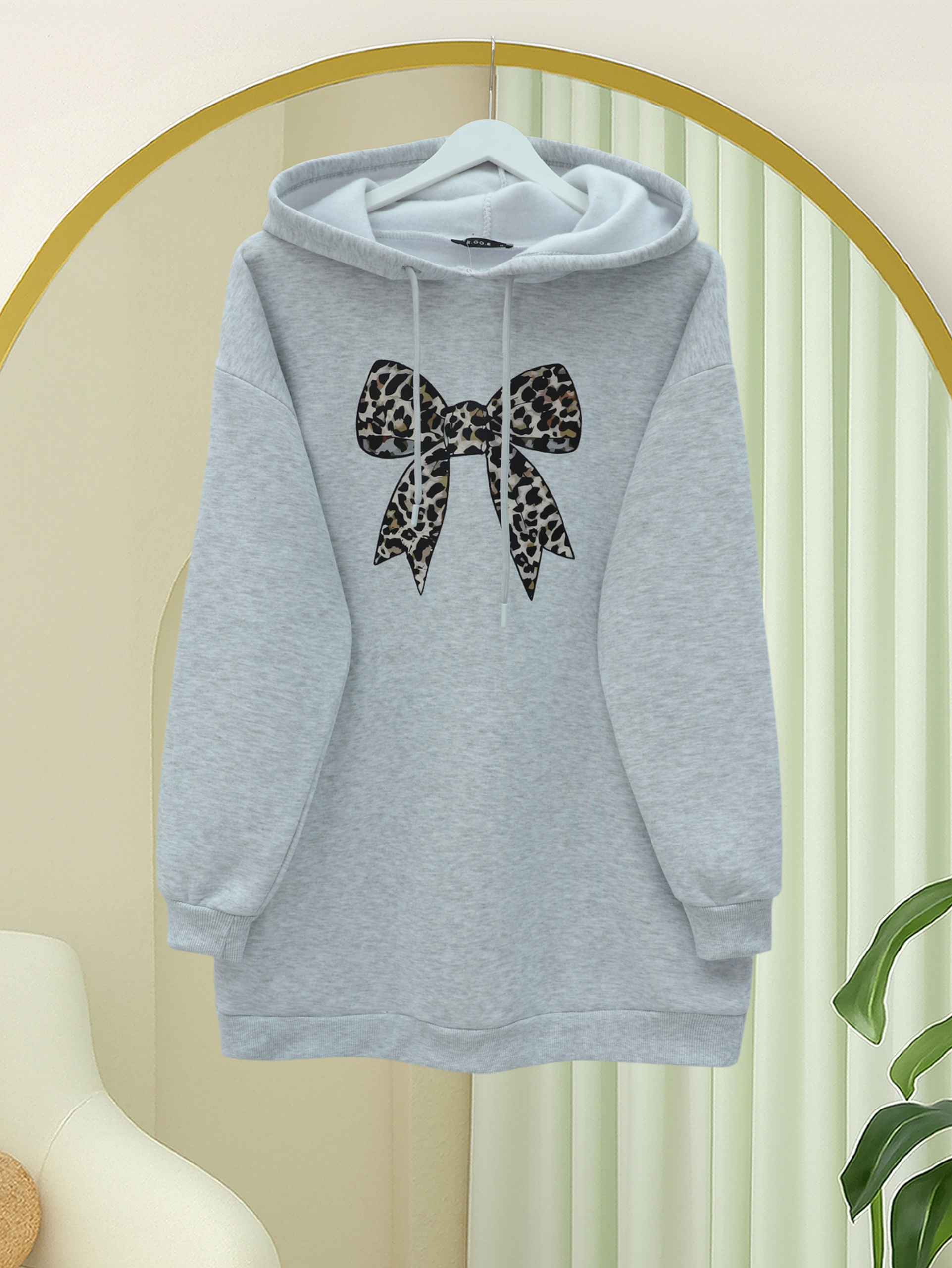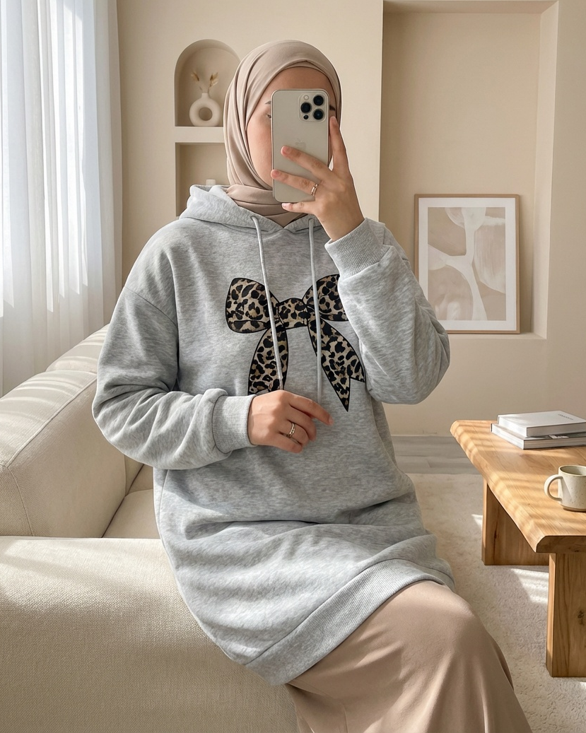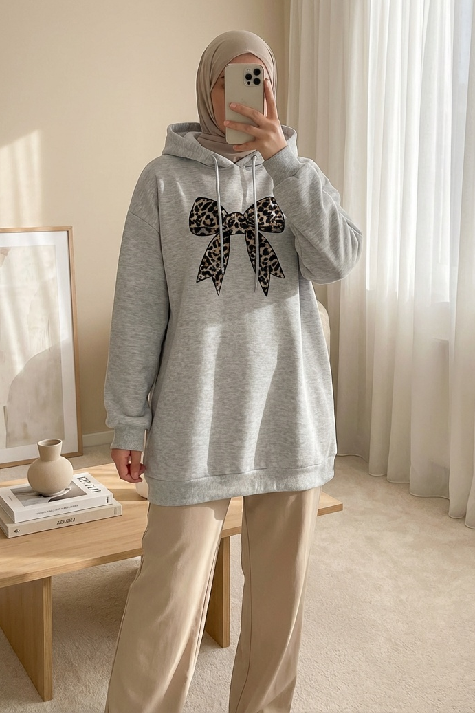 سترة قطنية بغطاء رأس وتفاصيل فيونكة -رمادي فاتح