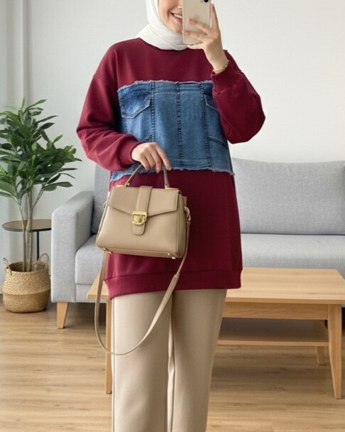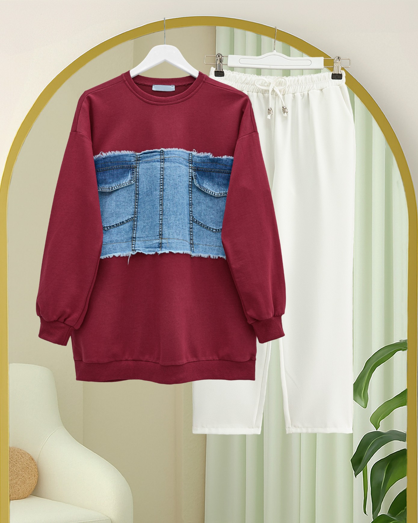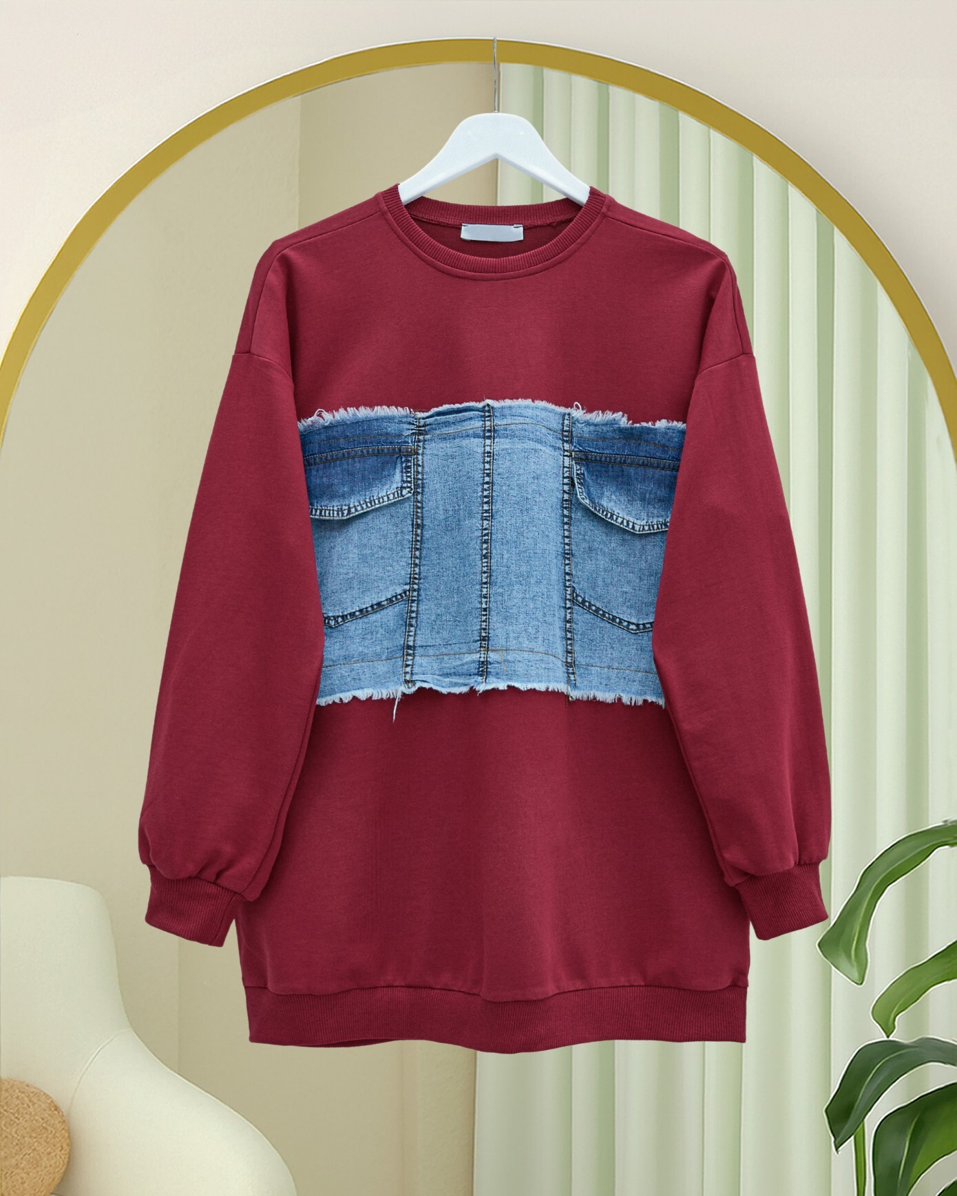 سويت شيرت جينز برقبة دائرية وجيب أمامي مفصل -بوردو