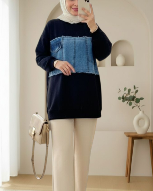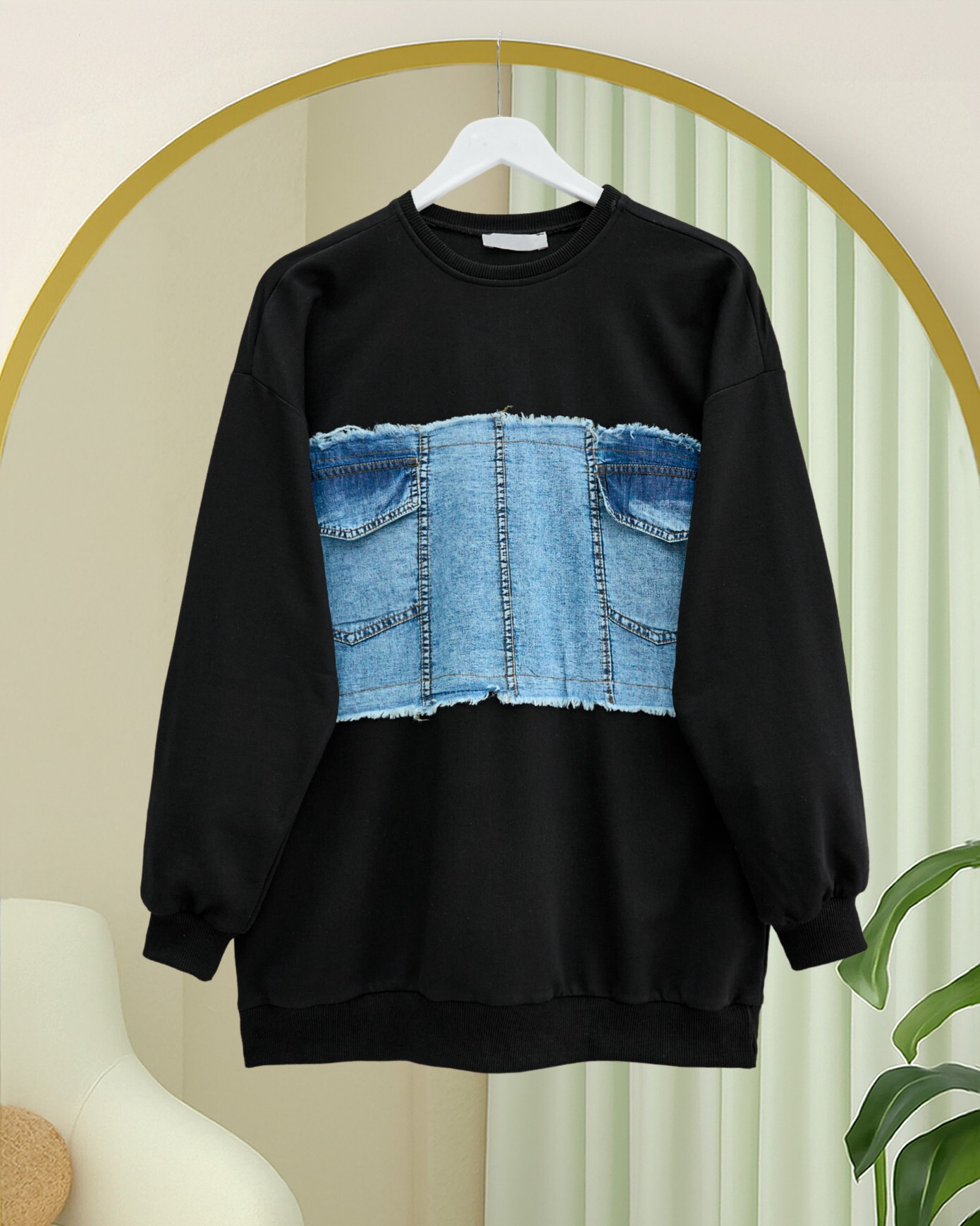 سويت شيرت جينز برقبة دائرية وجيب أمامي مفصل -أسود