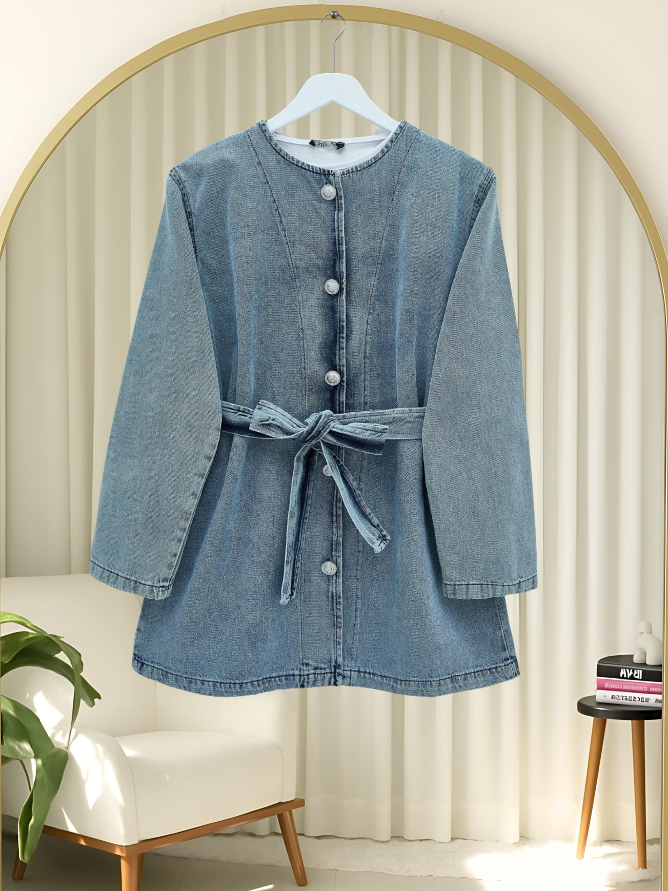 جاكيت جينز بحزام وأزرار وياقة دائرية -جليدي