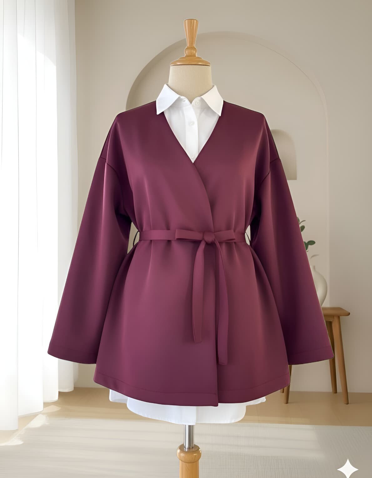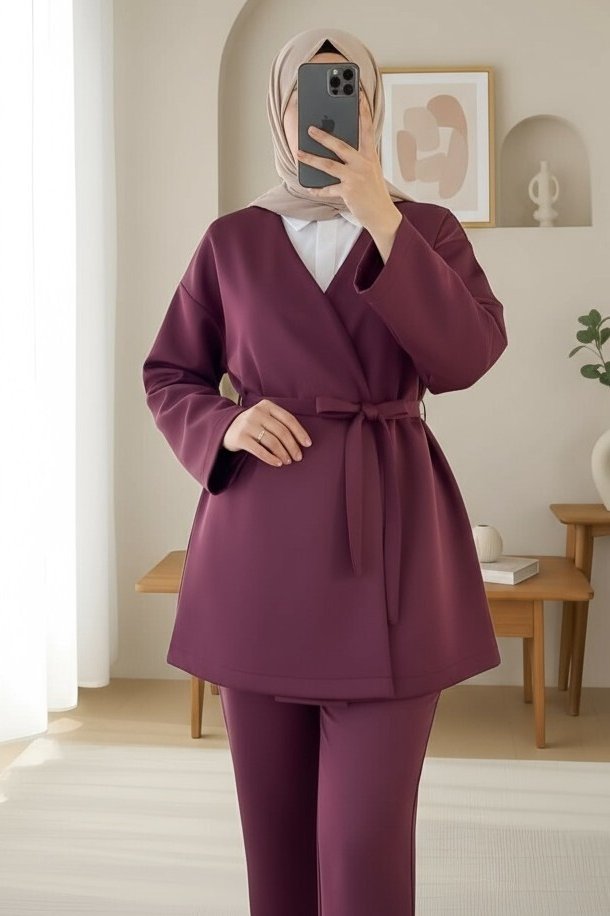 كيمونو سكوبا برقبة على شكل حرف V وحزام -بوردو