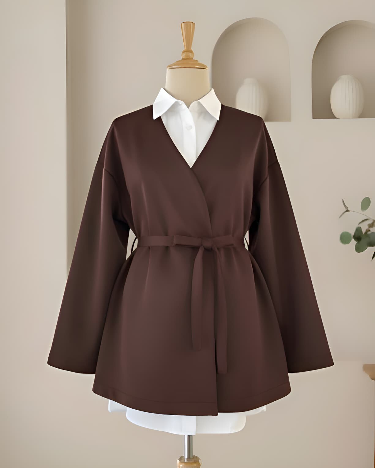 كيمونو سكوبا برقبة على شكل حرف V وحزام -بنى