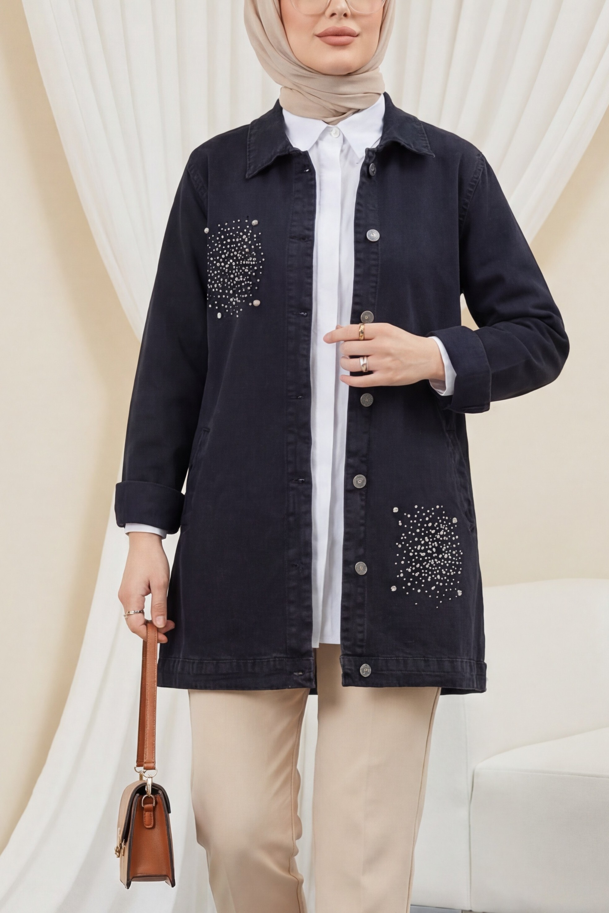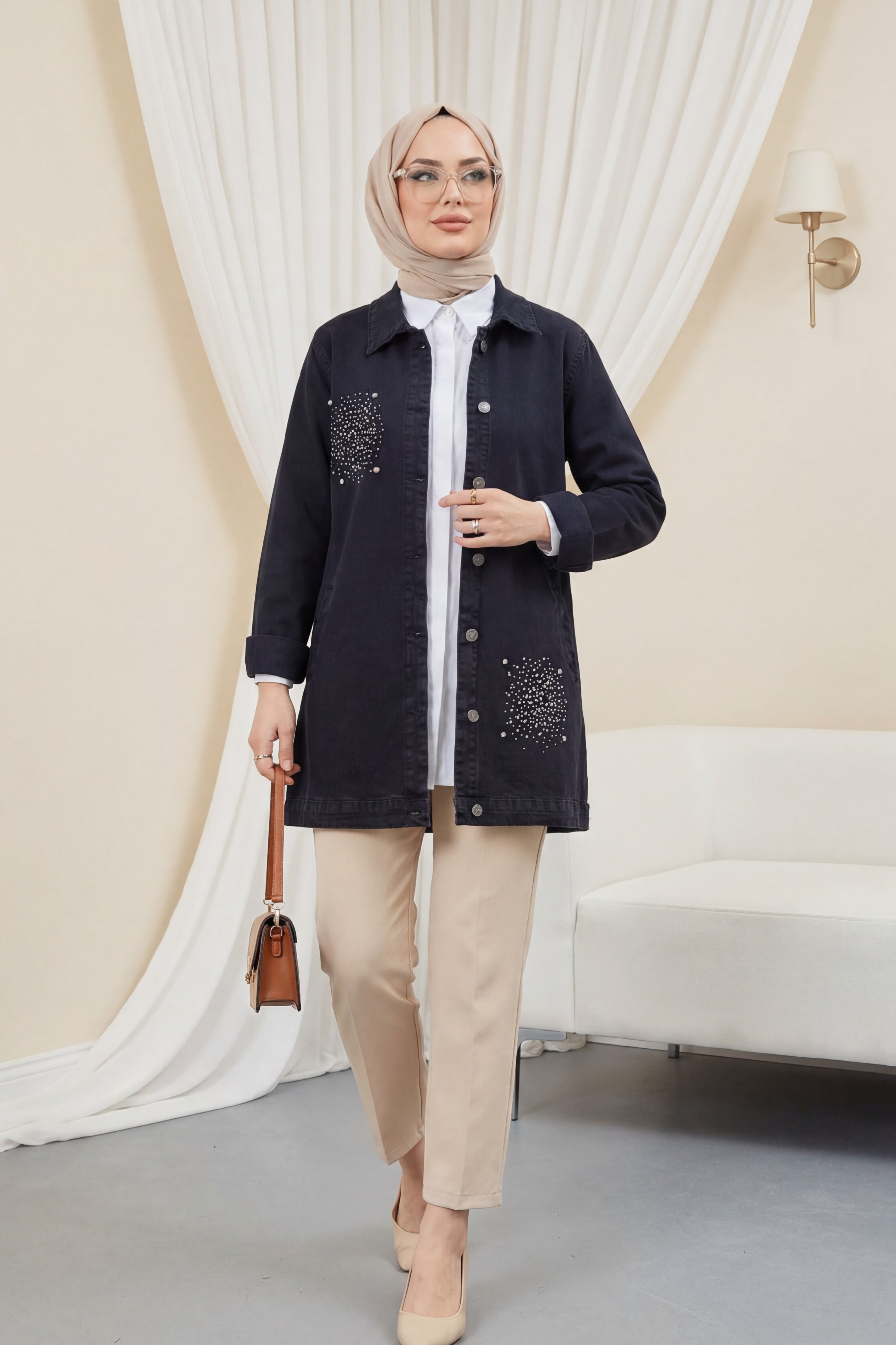 يعد نموذج سترة الدنيم المزودة بأزرار أمامية مع تفاصيل الحجر في الأمام ، وجيبان وأساور أكمام بأزرار من بين أشهر الموديلات في الموسم الجديد.