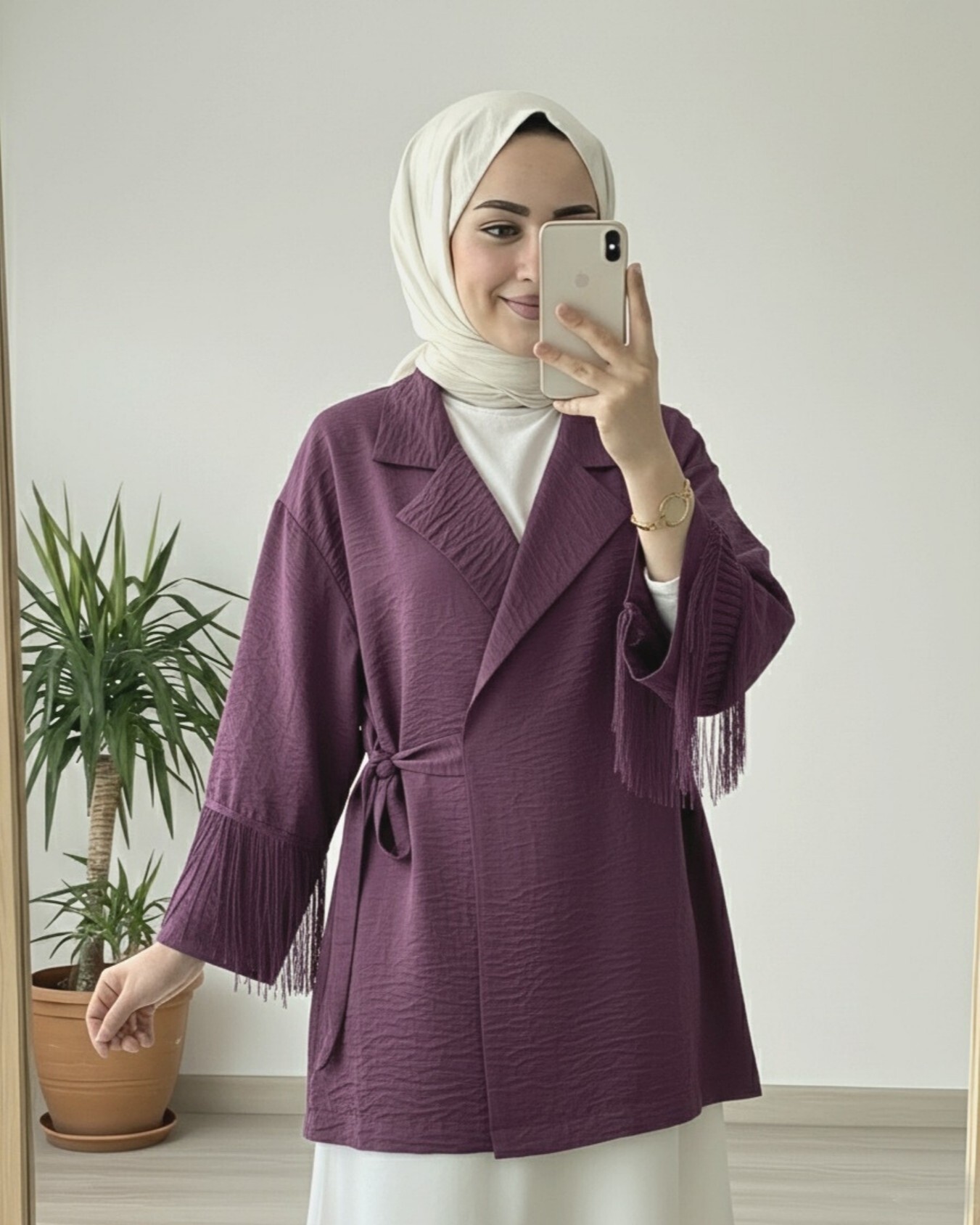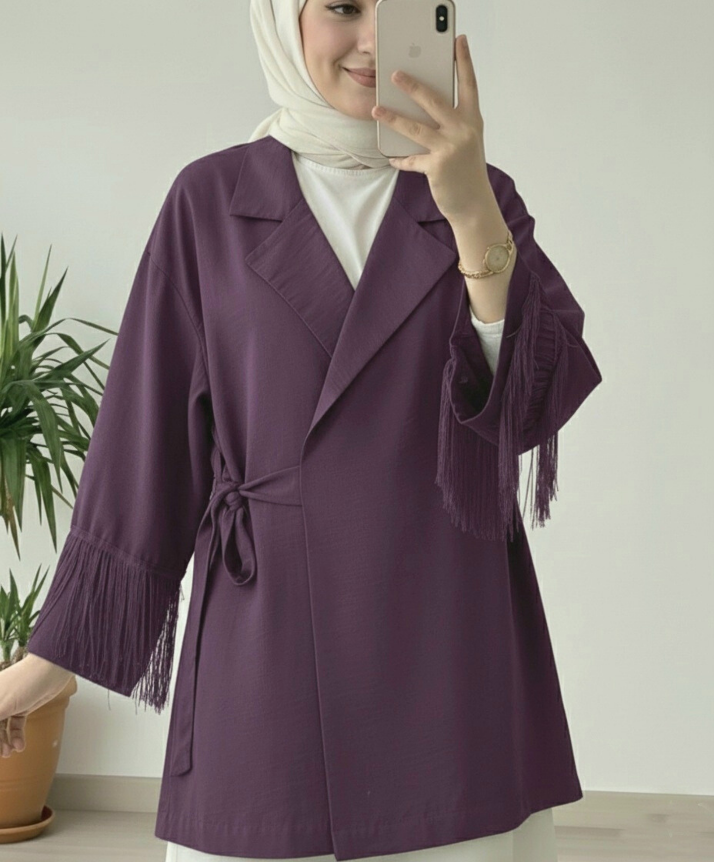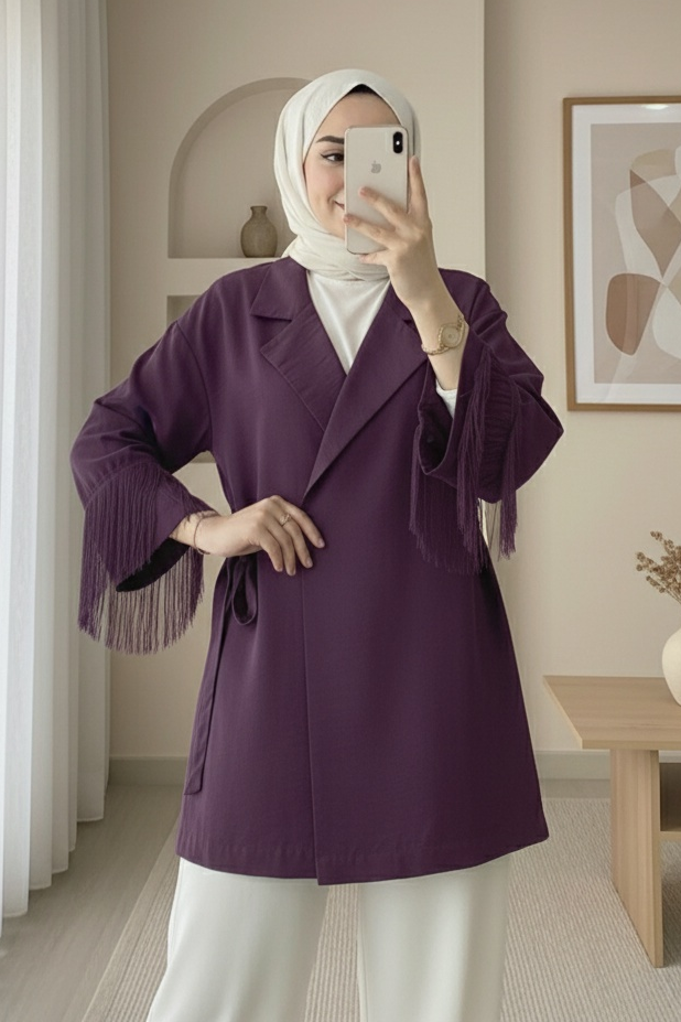 سترة كيمونو برباط أمامي مع تفاصيل شرابة على الأكمام -لون الخوخ