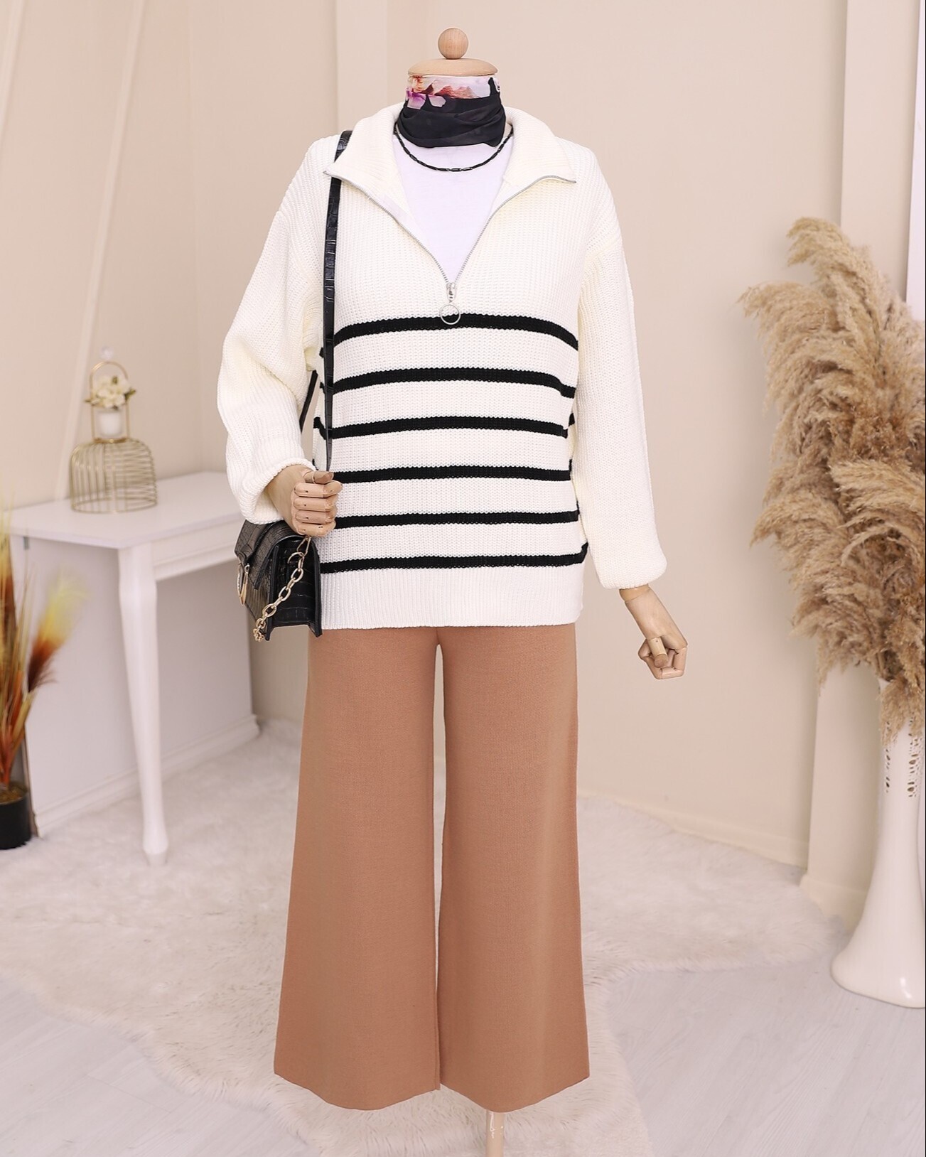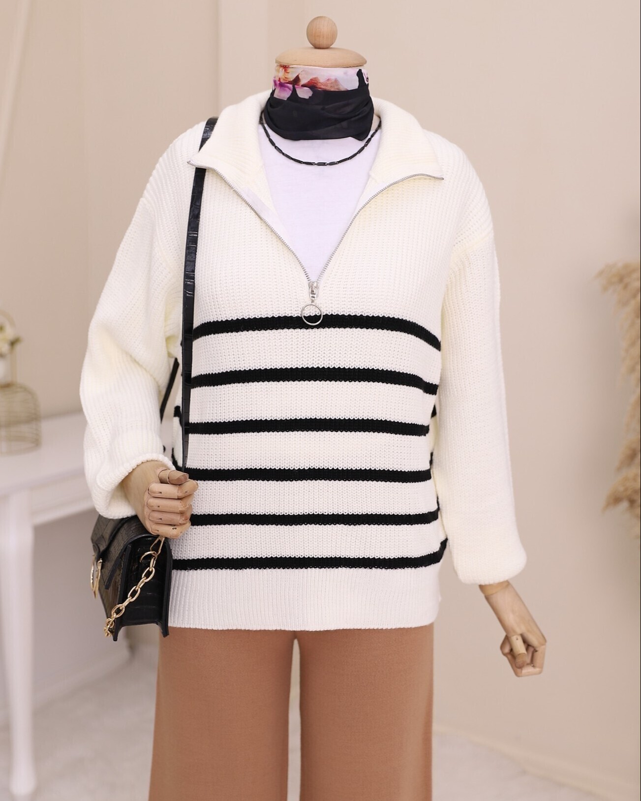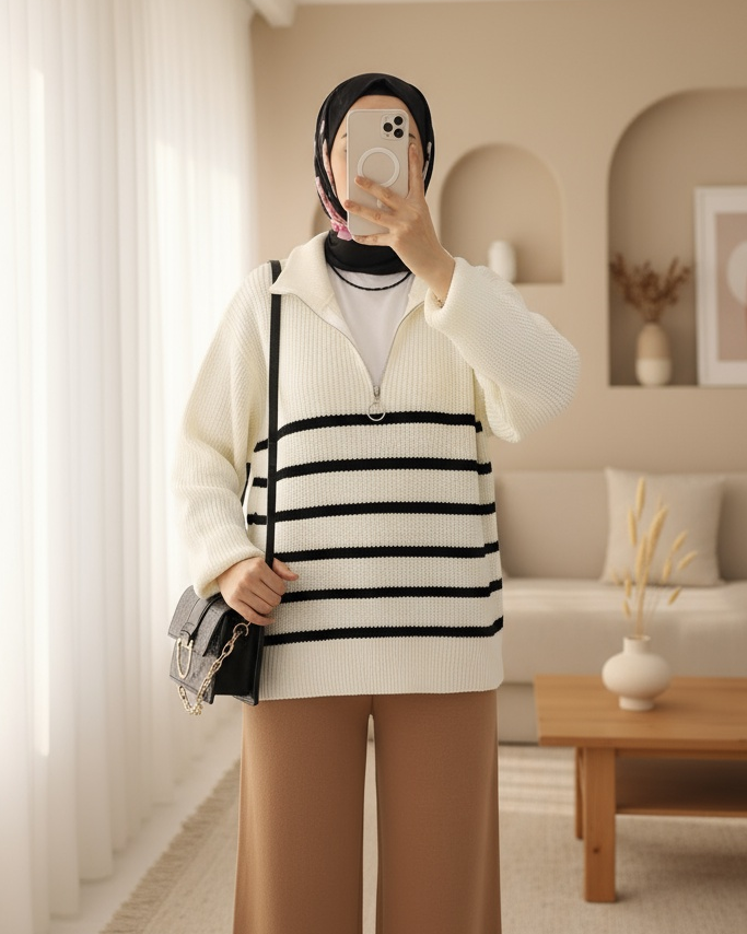 يُعد نموذج السترة المحبوكة المزينة بسحاب على الياقة من أشهر الموديلات في الموسم الجديد.