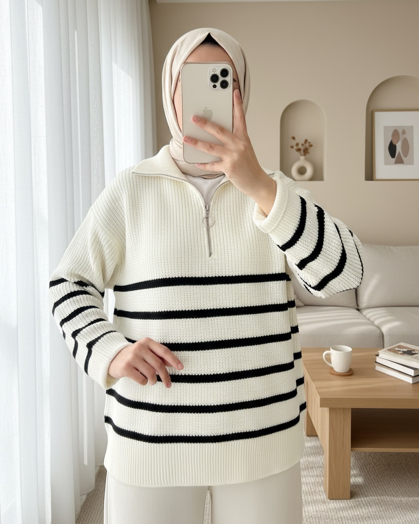 سترة تريكو مخططة من الجانب بسحاب نصف -أبيض سكري