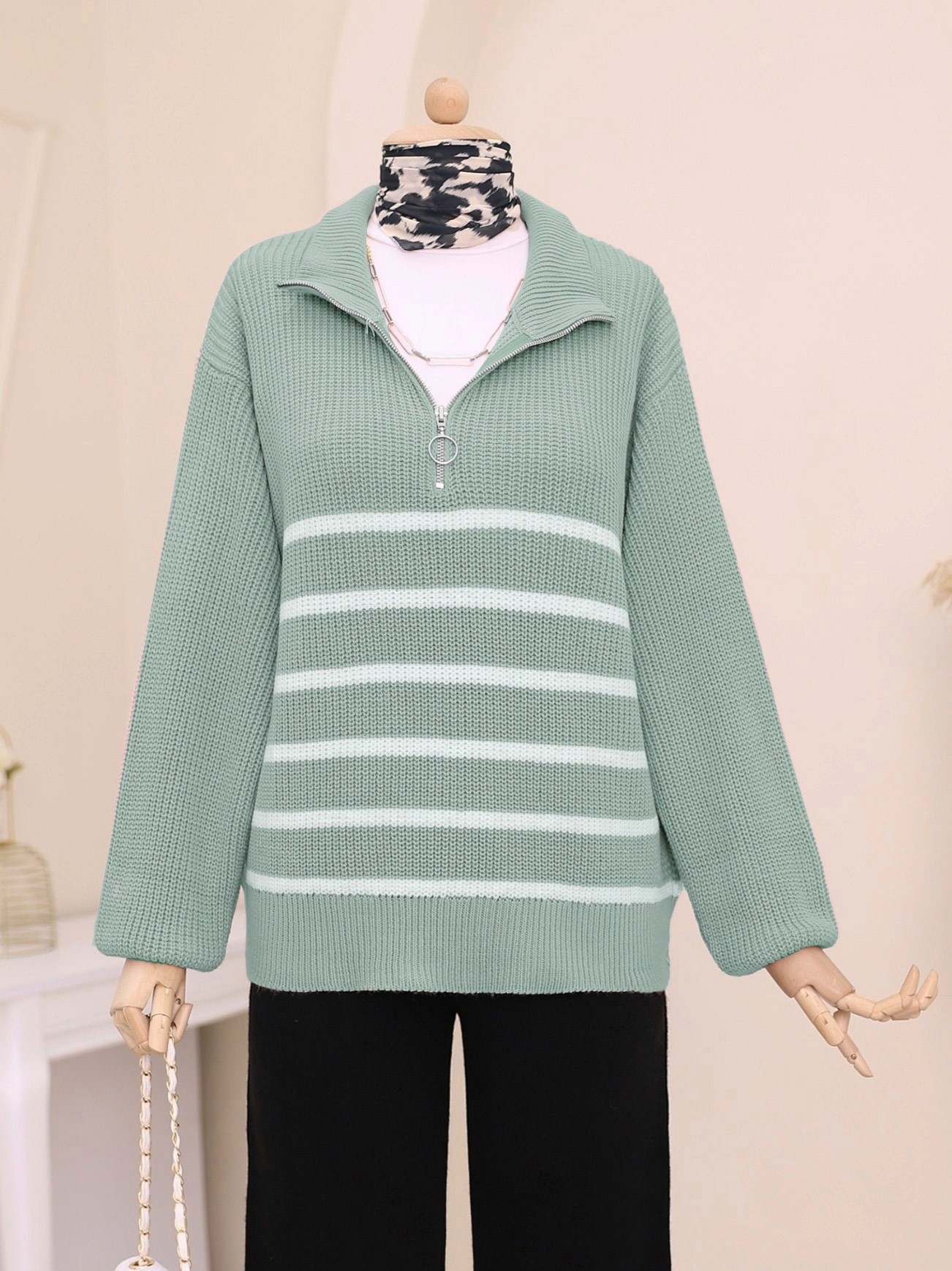 سترة تريكو مخططة من الجانب بسحاب نصف -بحري