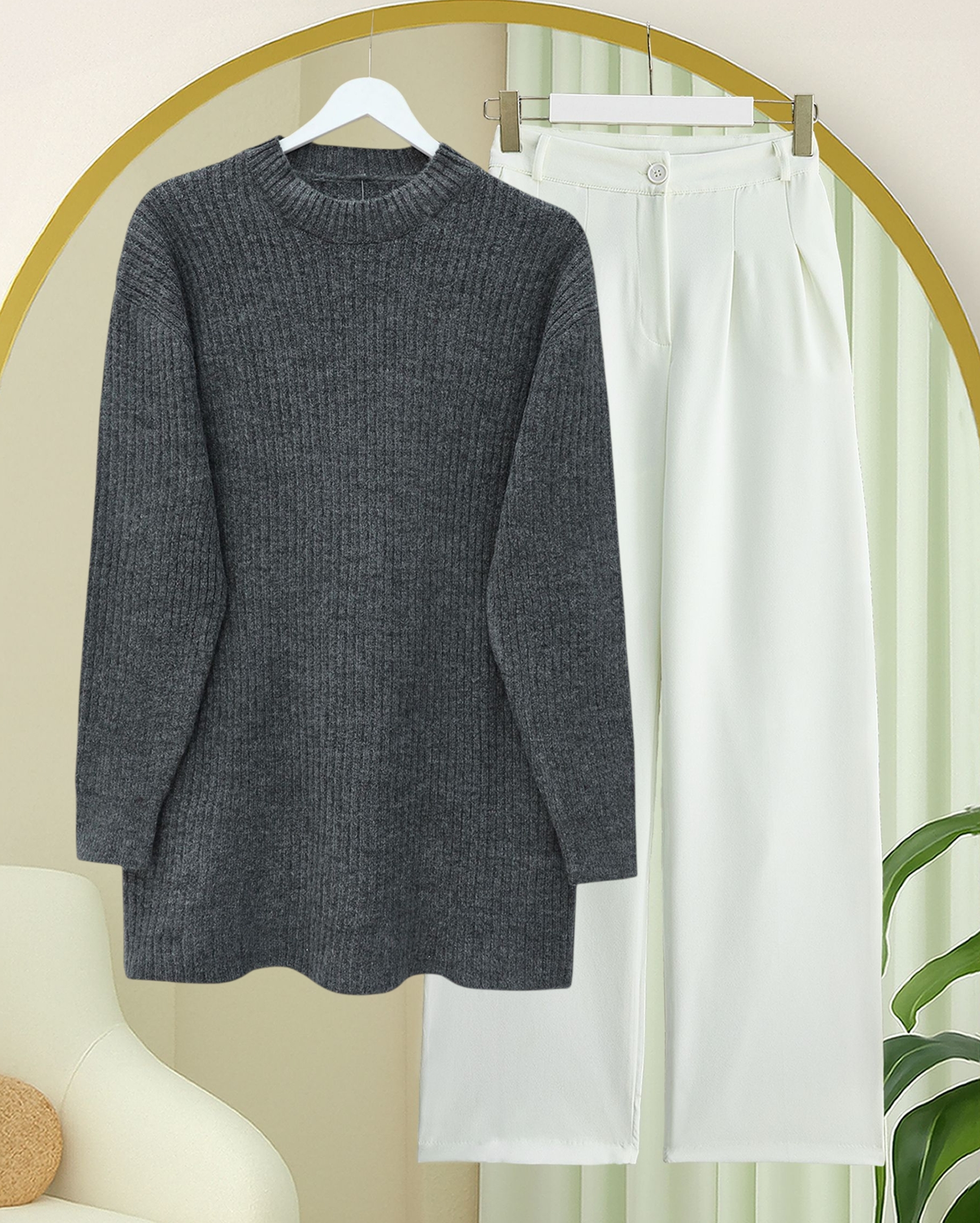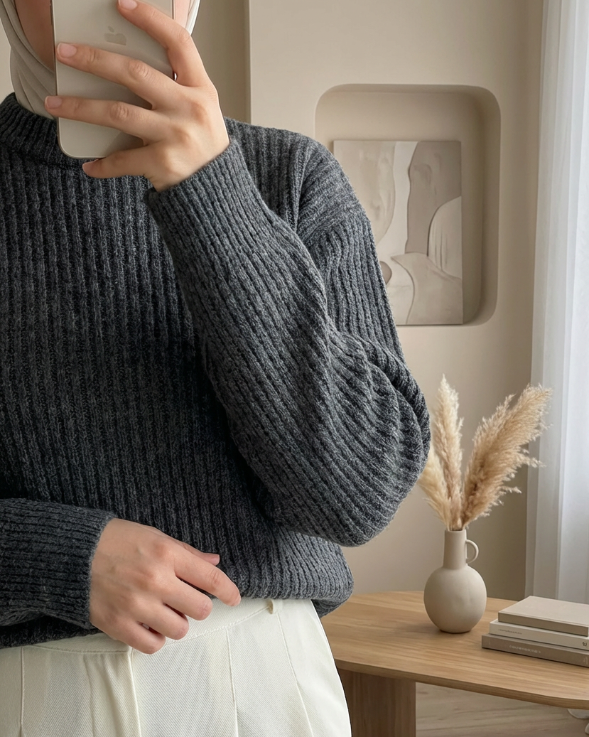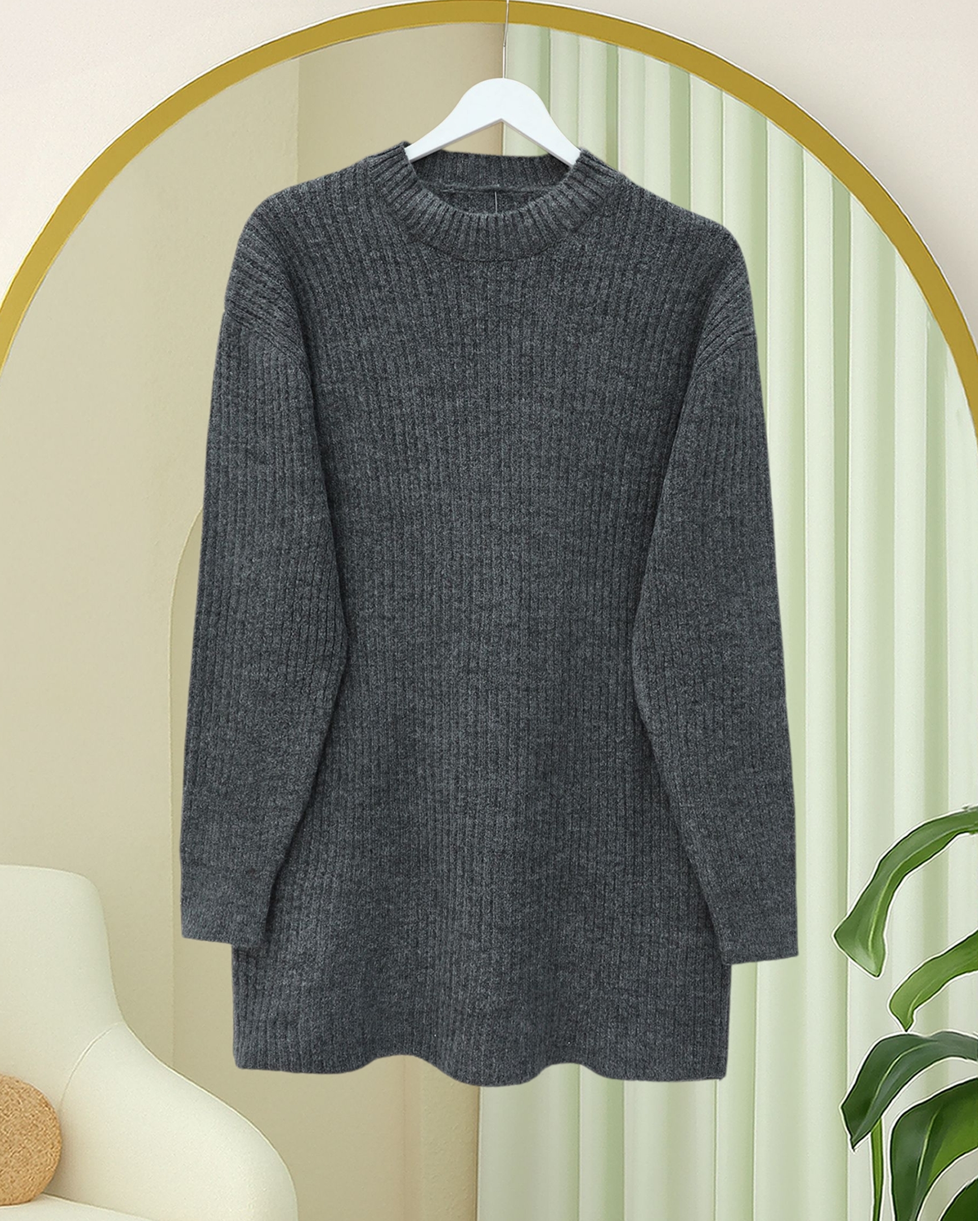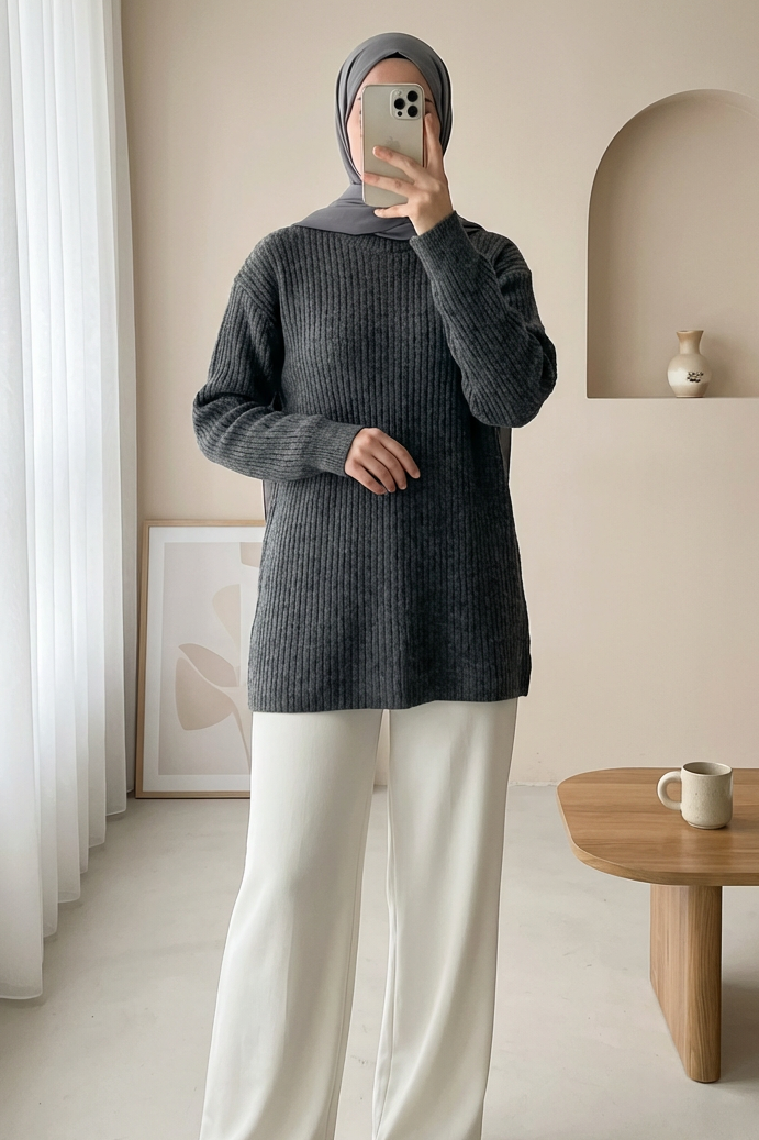 سترة محبوكة طويلة مضلعة -لون مدخن