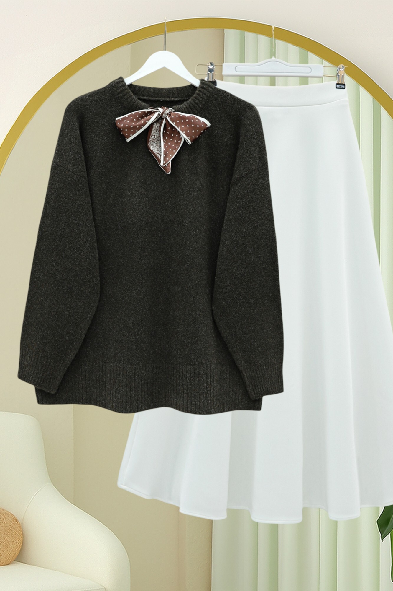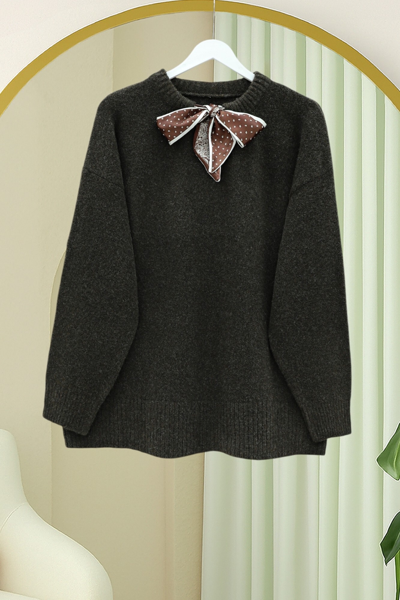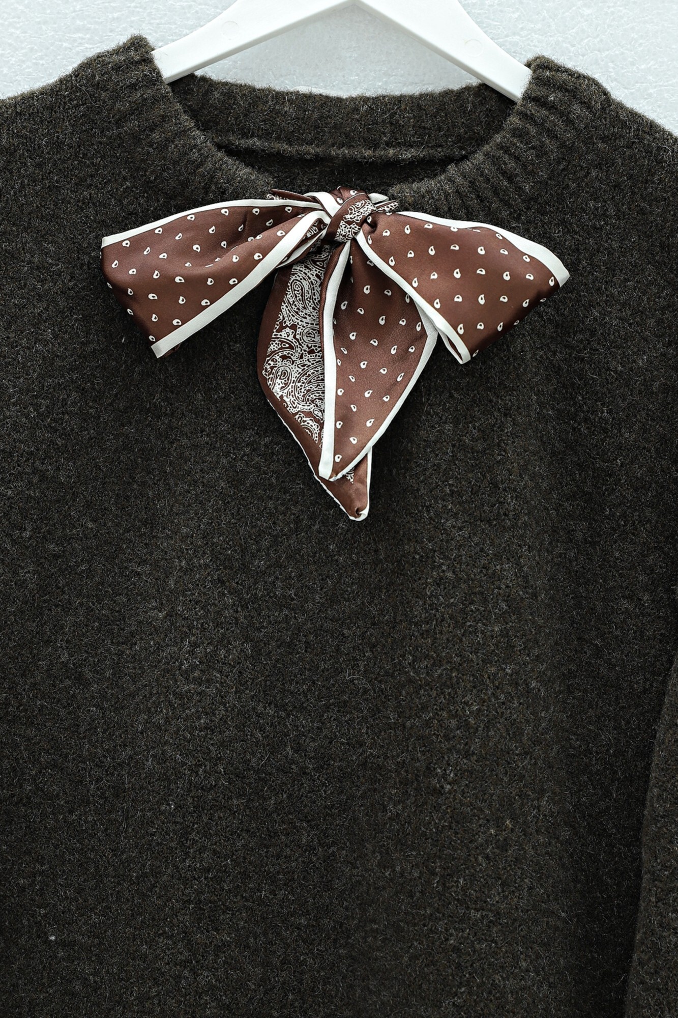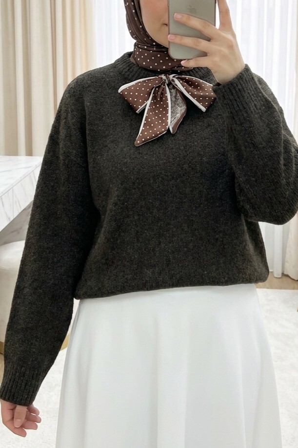 كنزة صوفية ناعمة محبوكة بتفاصيل ياقة وشاحية -بني محروق