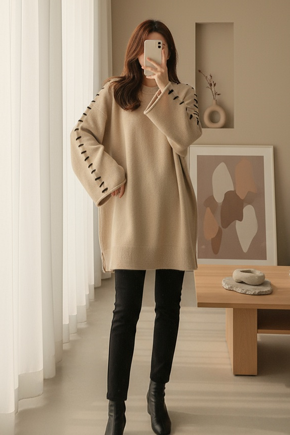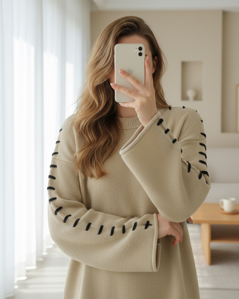 سترة ناعمة محبوكة بأكمام برباط وخطوط -تدرجات البيج
