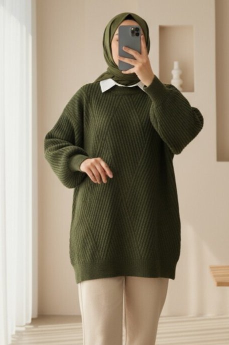 بلوزة تريكو نمط الماس رقبة دائرية -خاكي