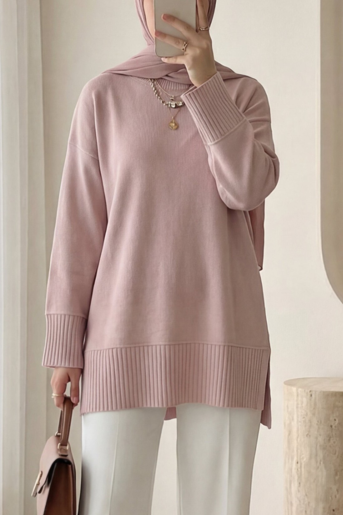 تونيك محبوك بفتحة جانبية وياقة دائرية وحافة وأساور مضلعة -بودرة