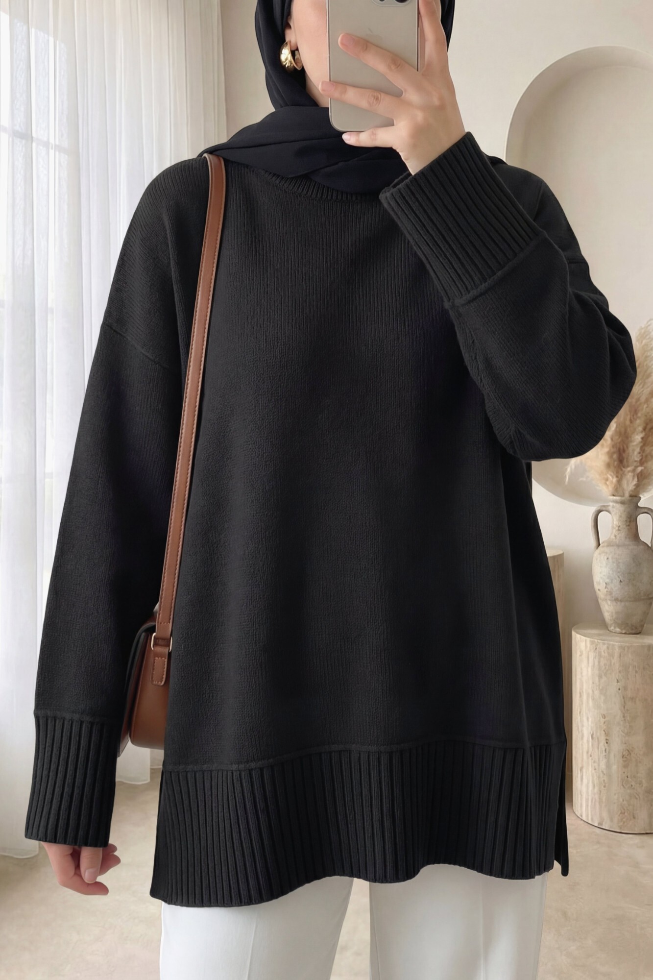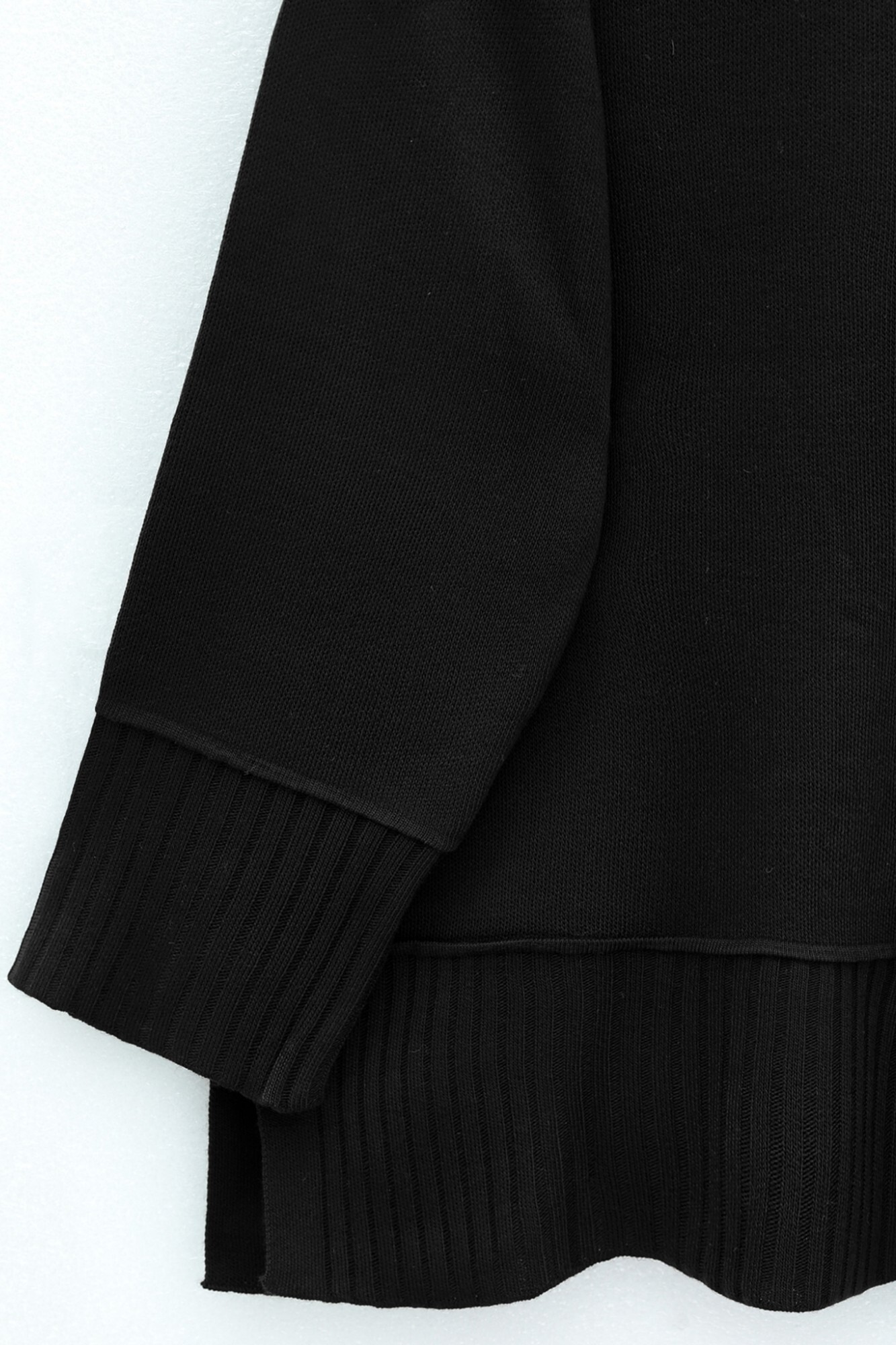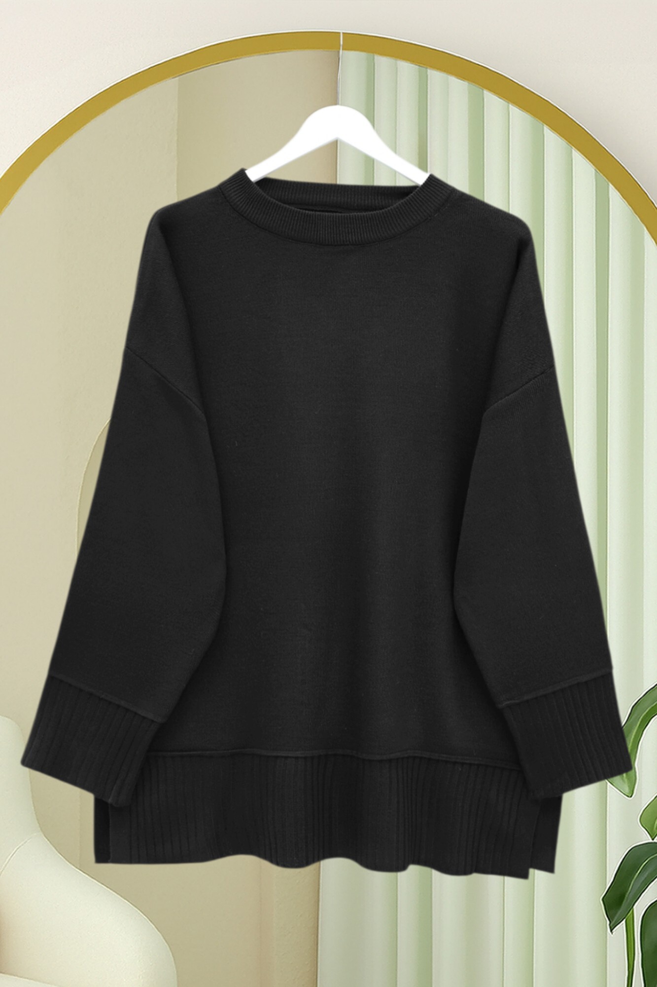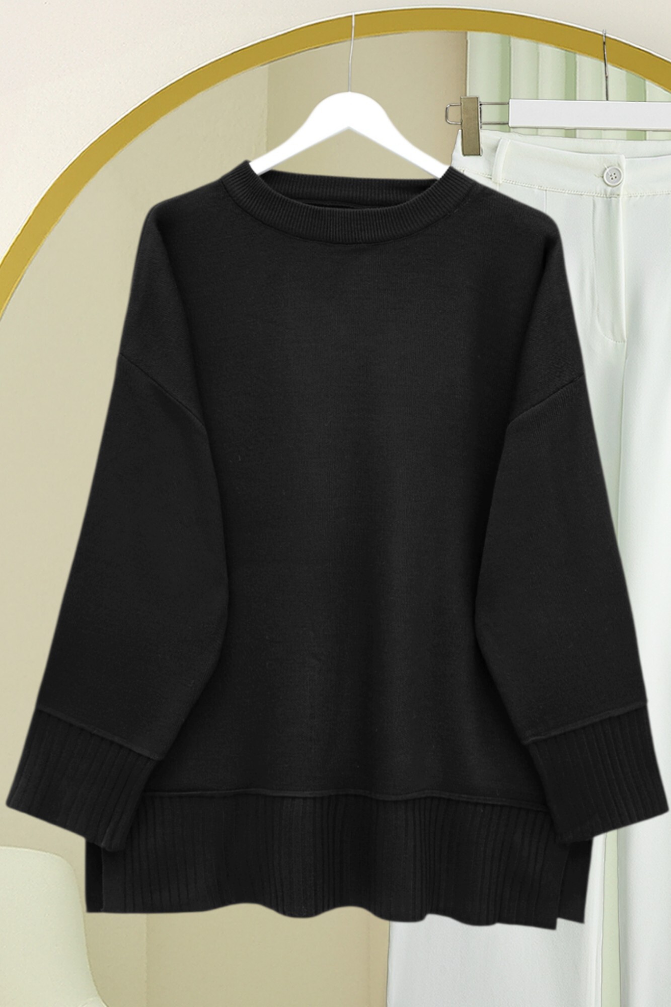 تونيك محبوك بفتحة جانبية وياقة دائرية وحافة وأساور مضلعة -أسود
