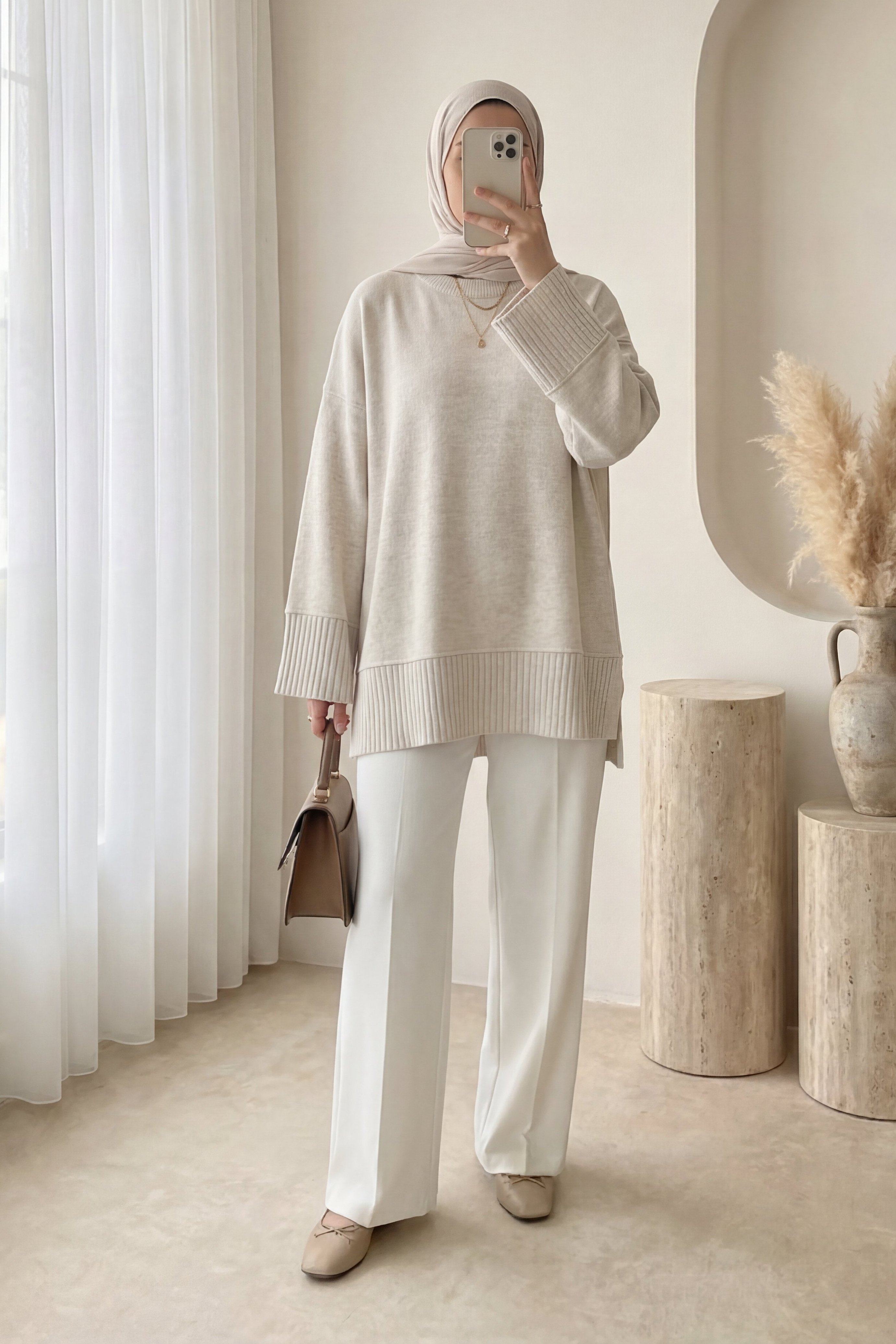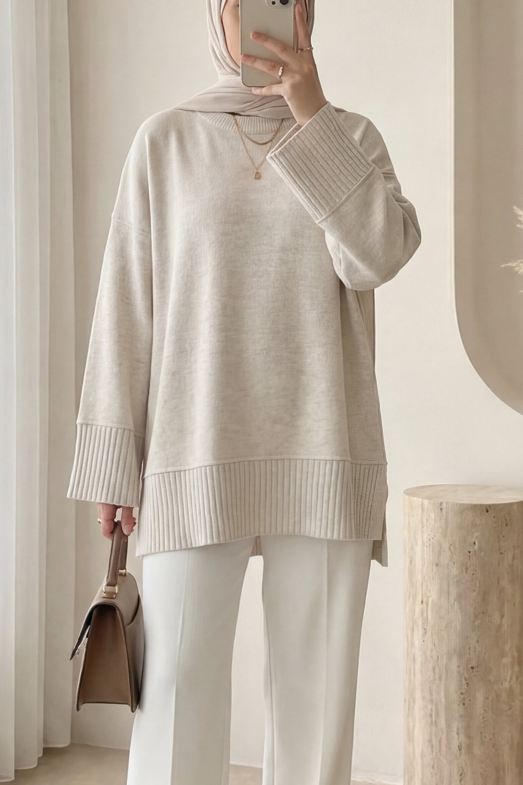 تونيك محبوك بفتحة جانبية وياقة دائرية وحافة وأساور مضلعة -حجر