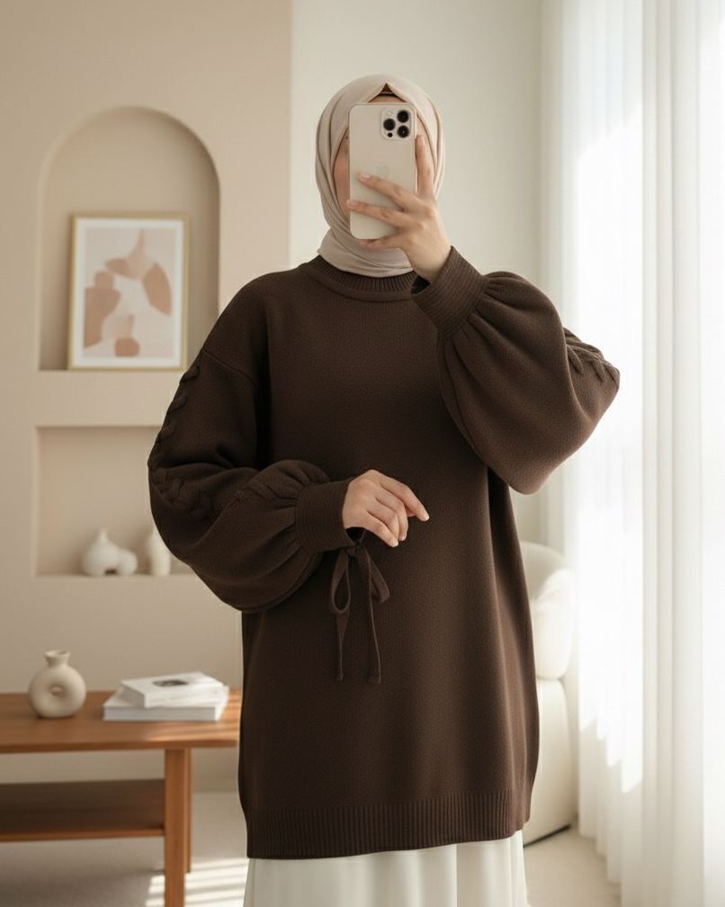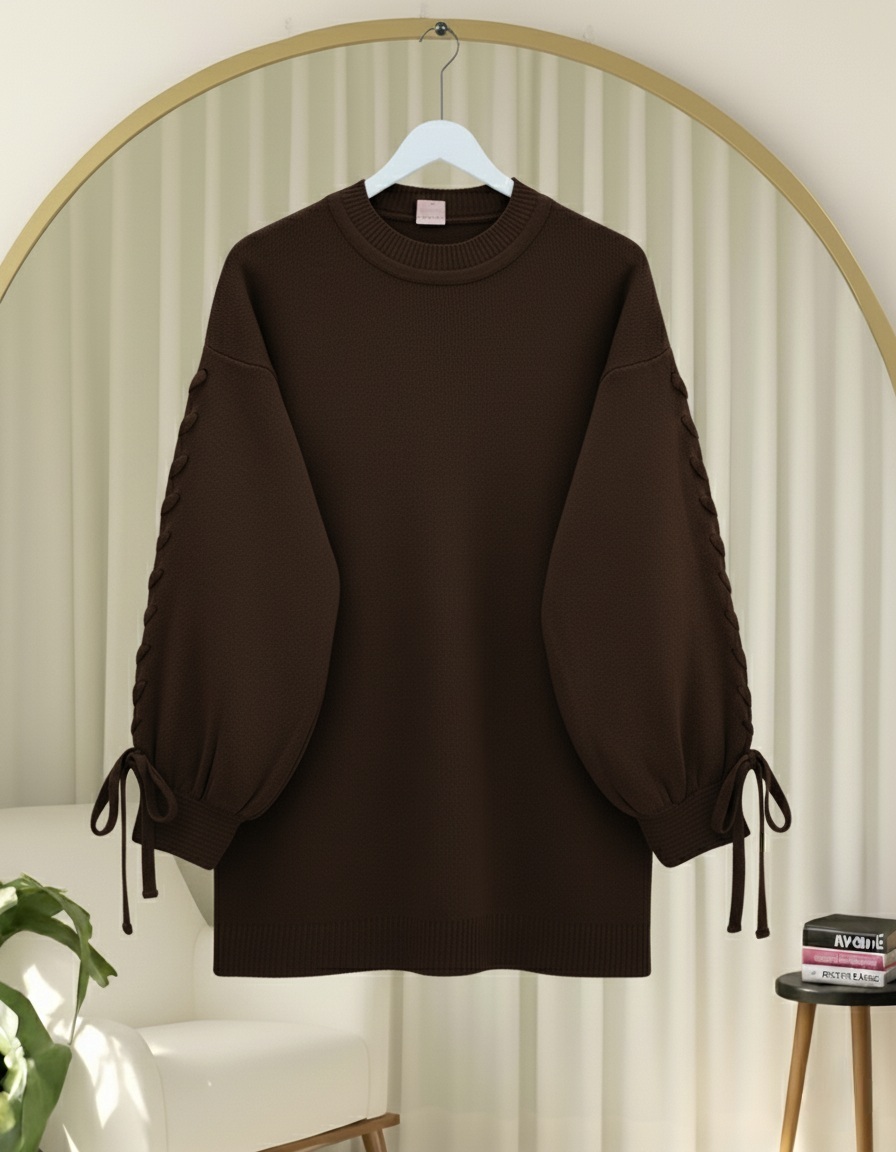 سترة محبوكة مفصلة برقبة مستديرة -بني محروق
