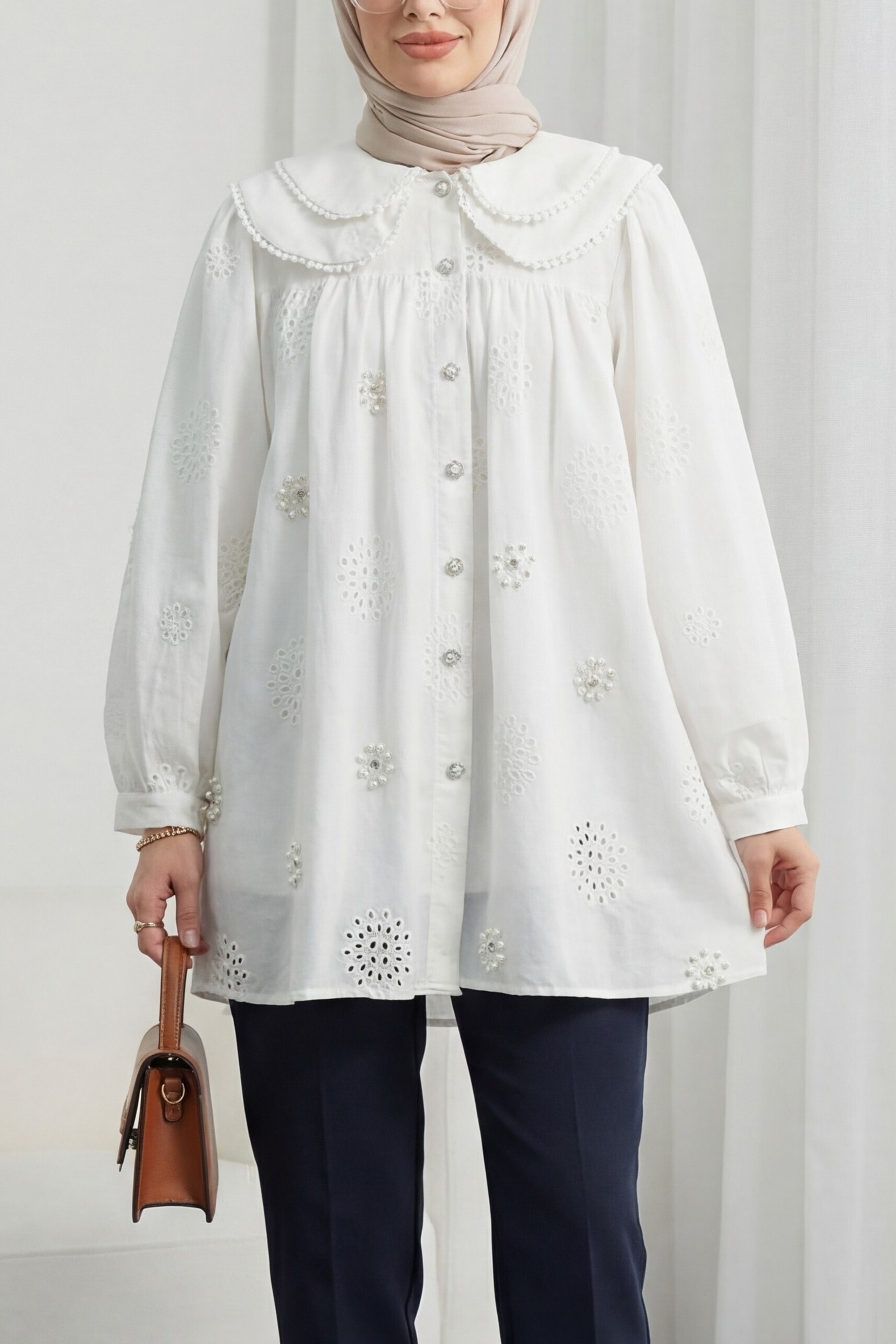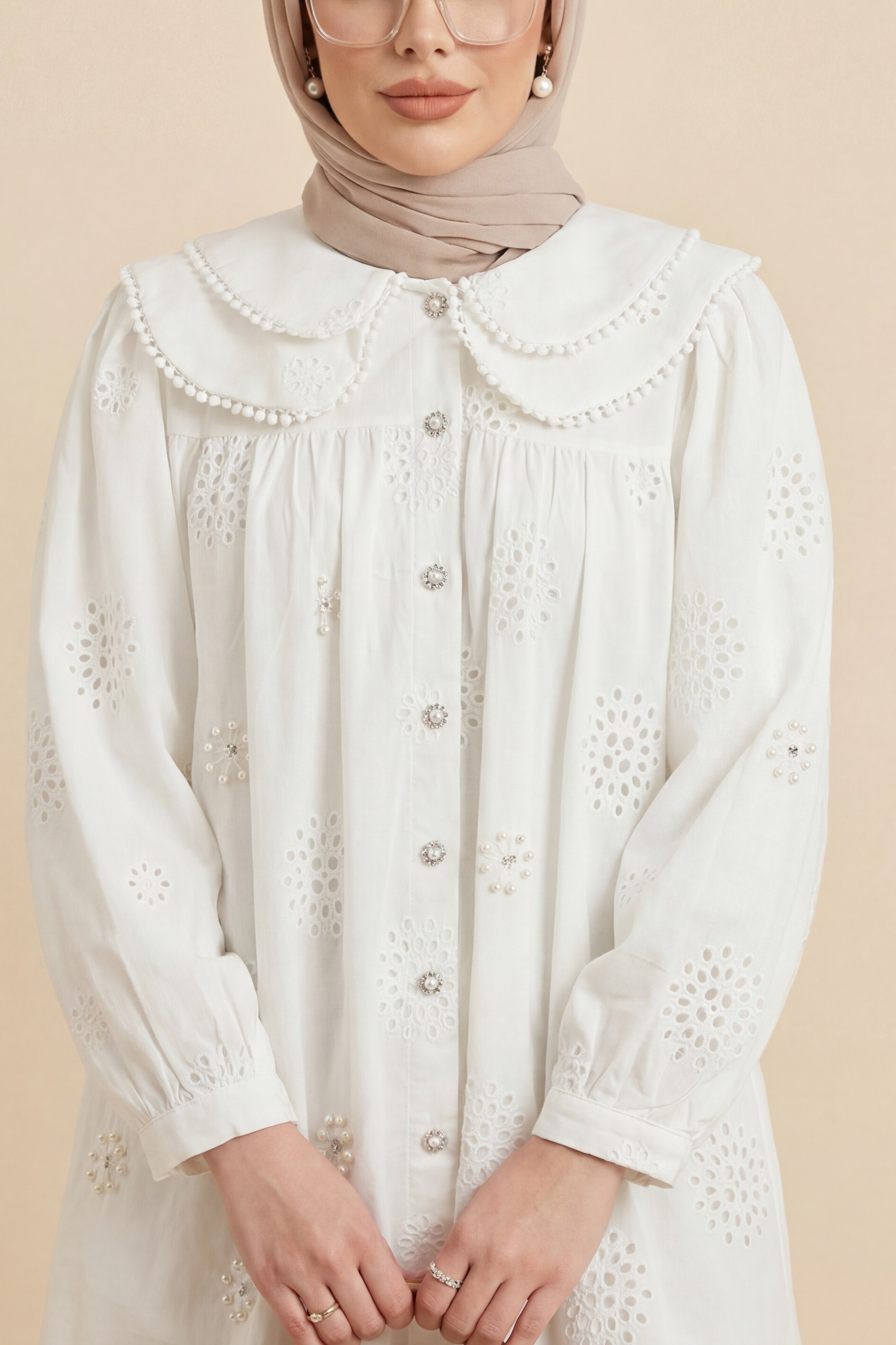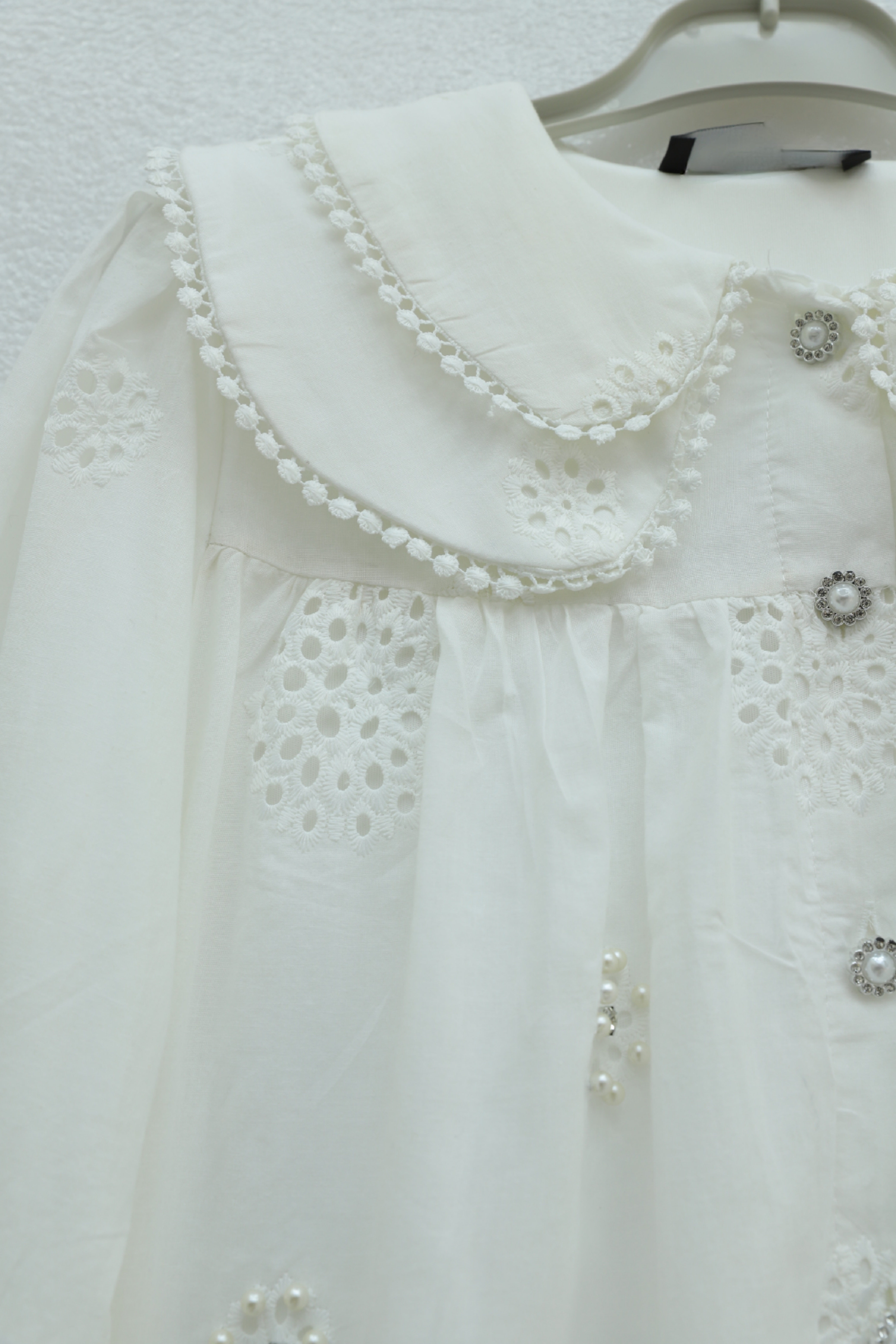 قميص كتان بياقة بيتر بان، مزين بالدانتيل، مع تفاصيل من اللؤلؤ والأحجار وبطانة داخلية. -أبيض