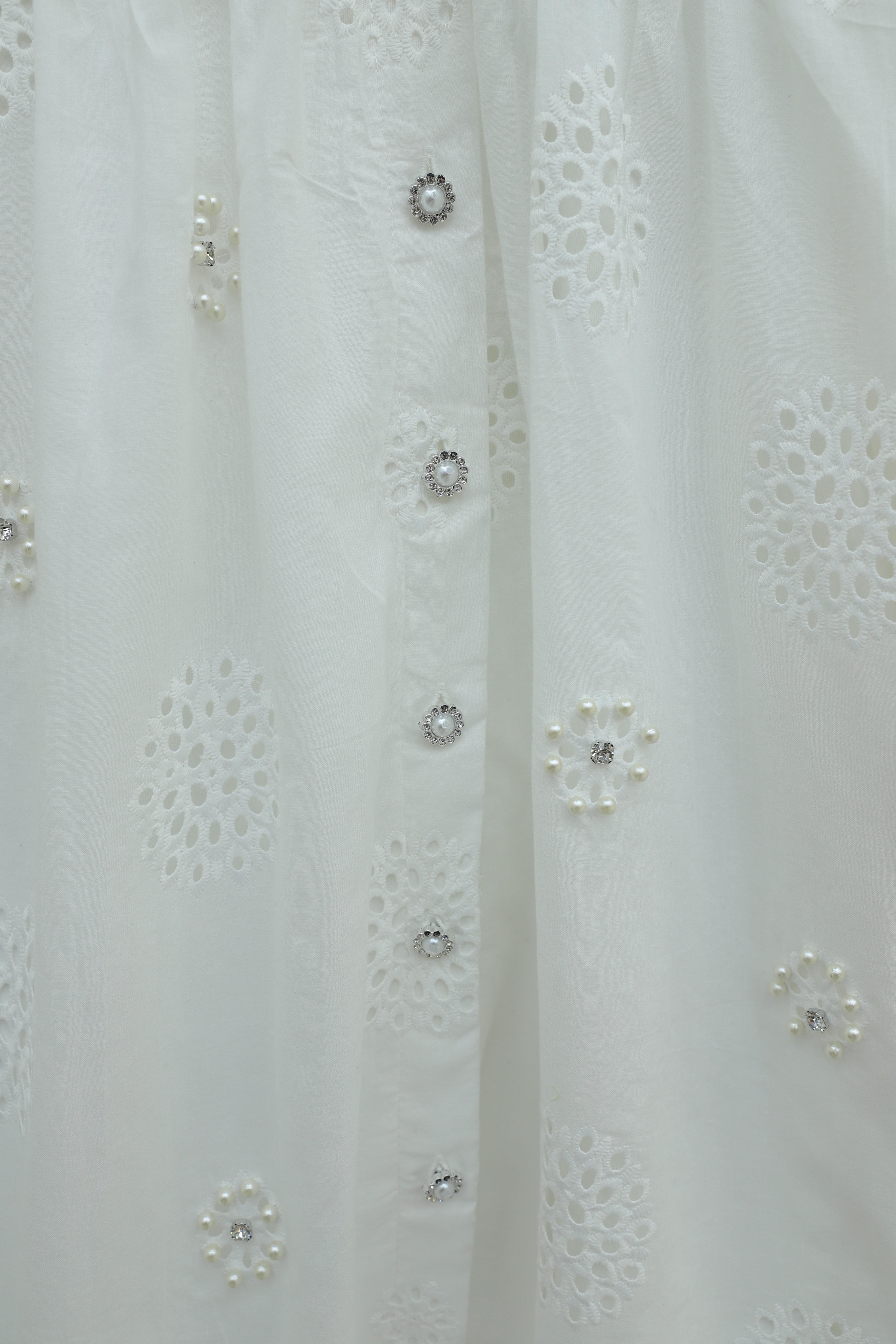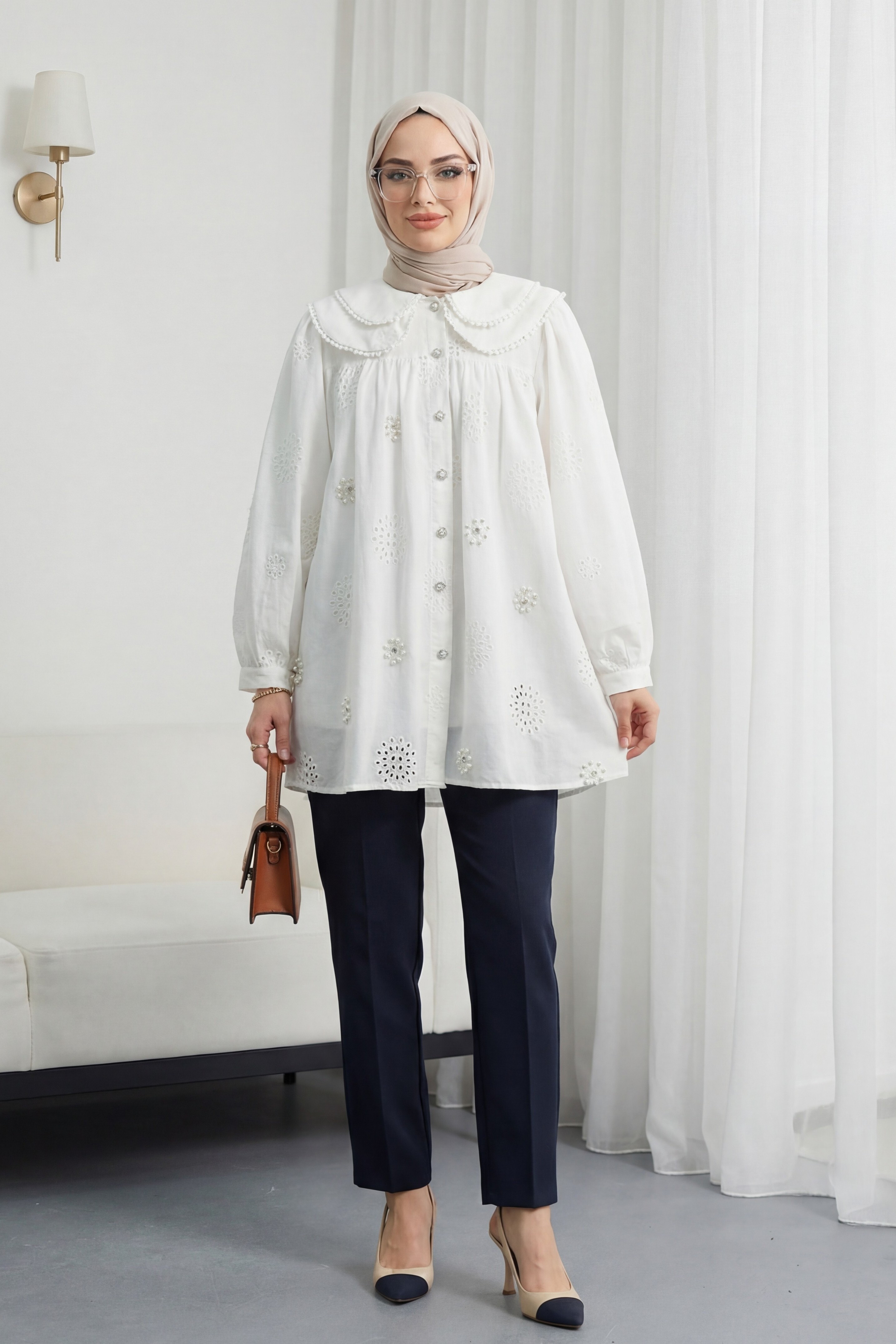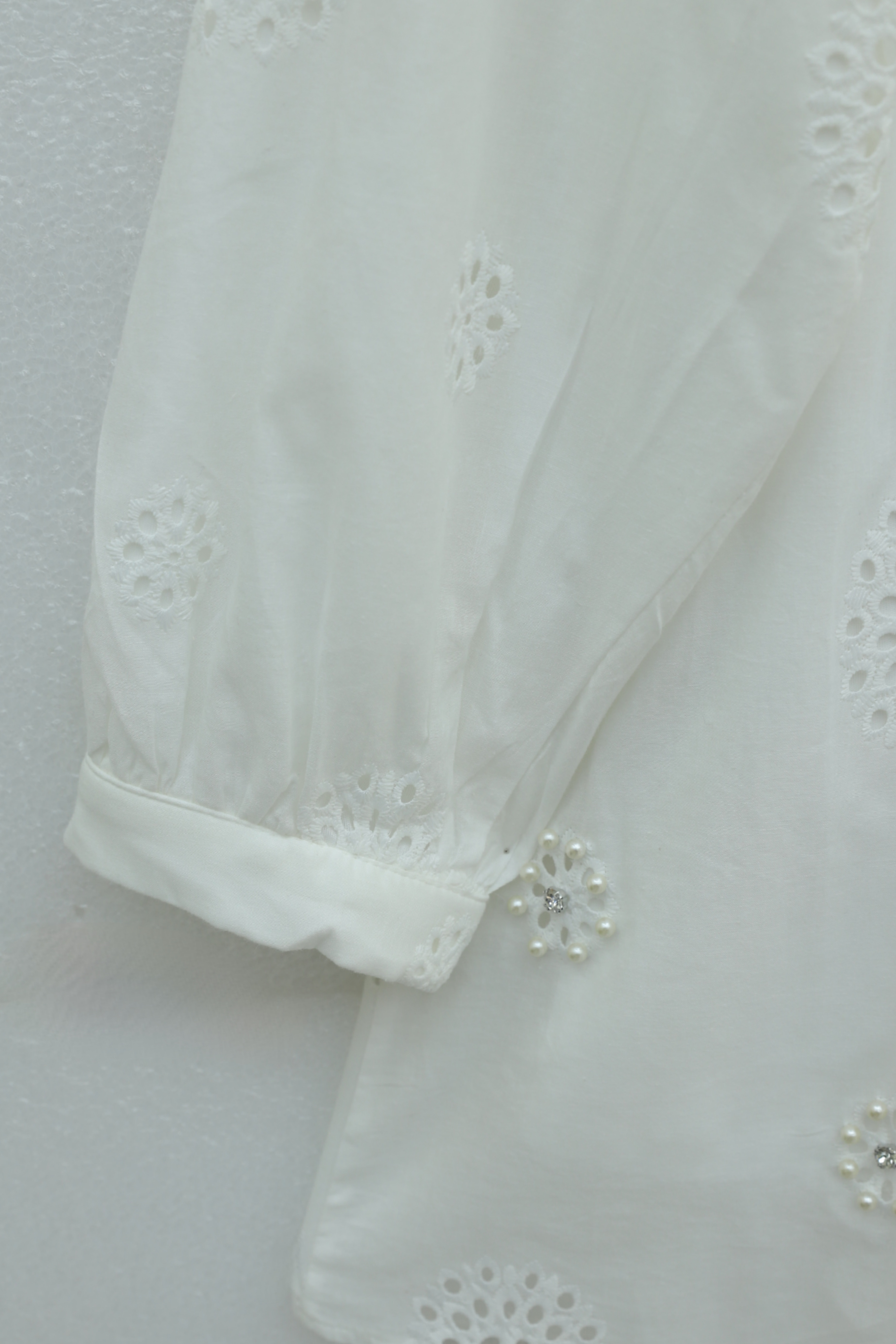 قميص كتان بياقة بيتر بان، مزين بالدانتيل، مع تفاصيل من اللؤلؤ والأحجار وبطانة داخلية. -أبيض