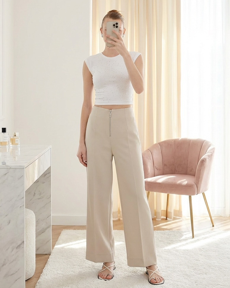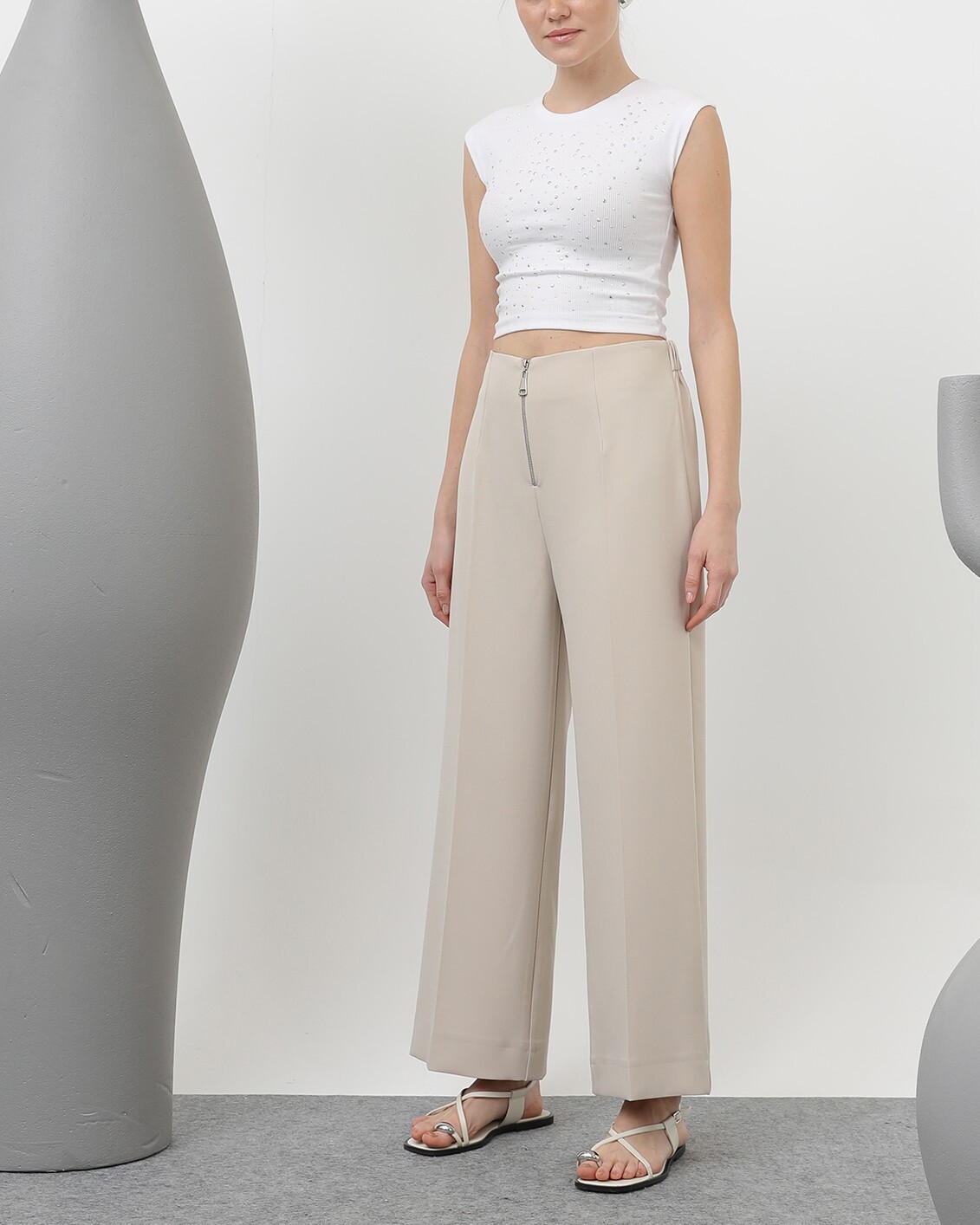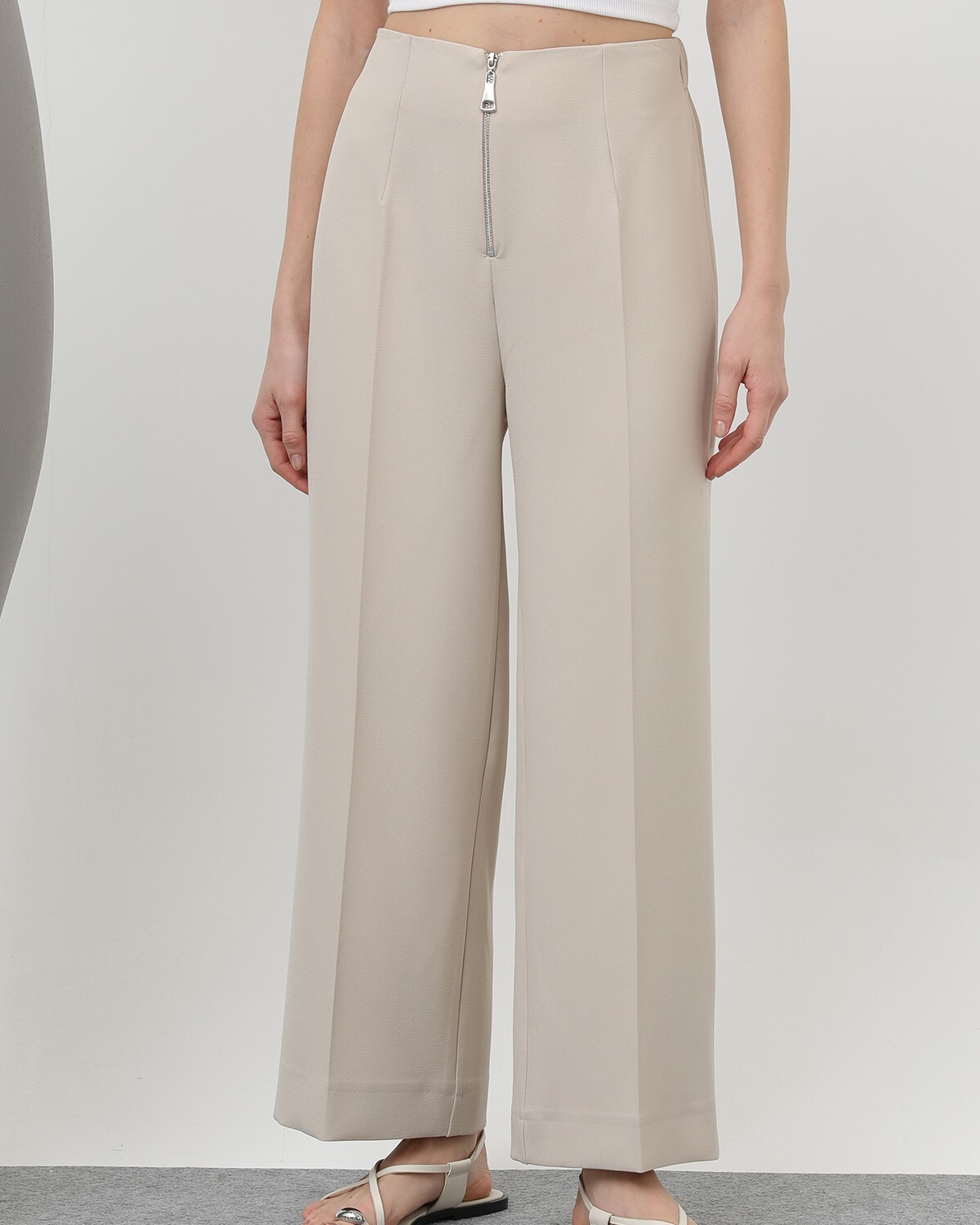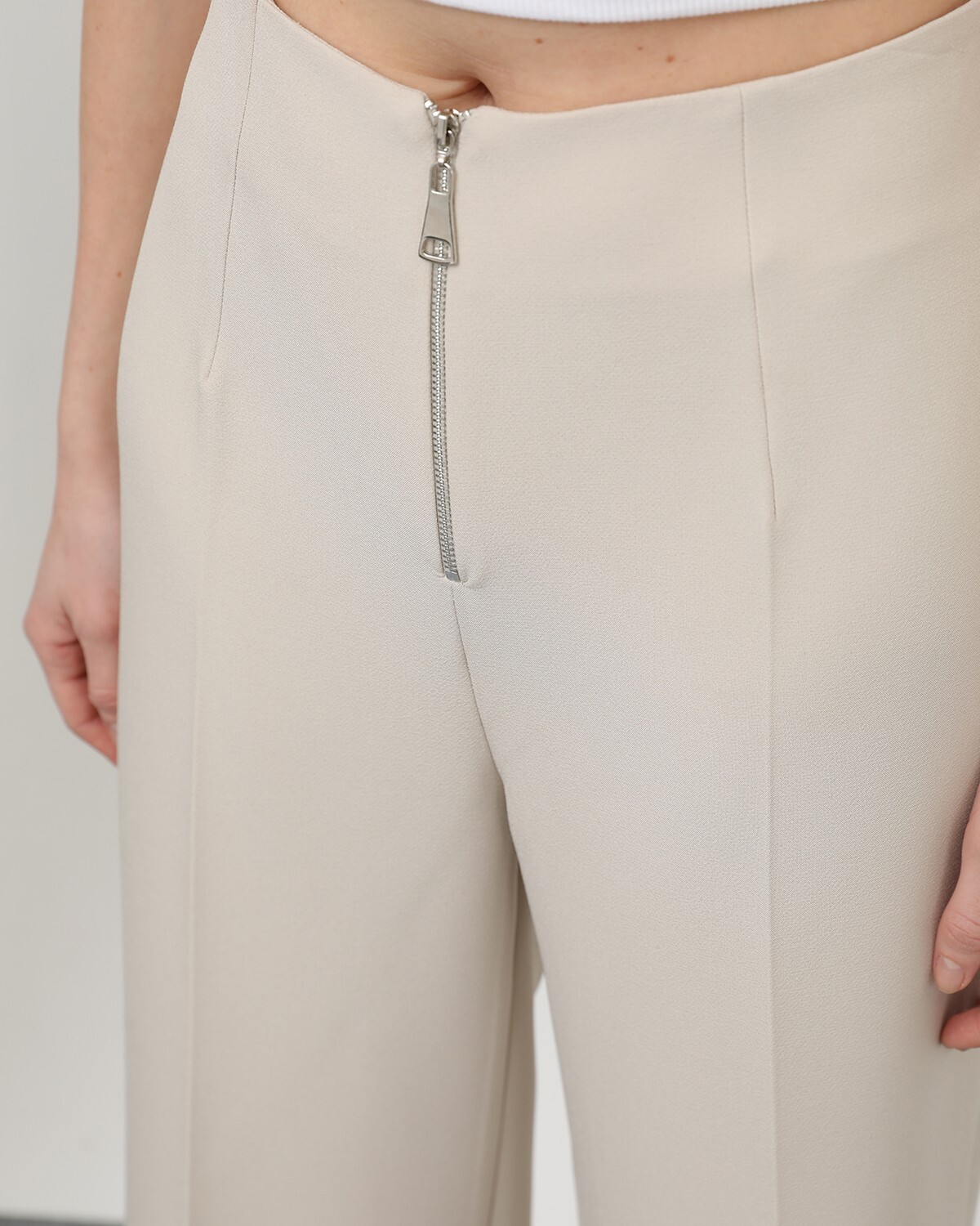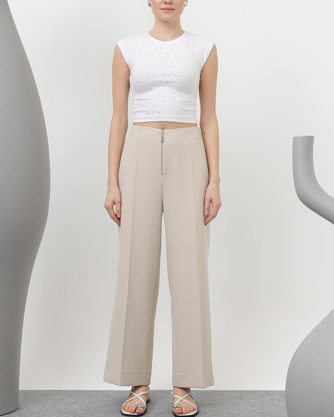 يتميز هذا البنطال بتصميم عصري مع تفاصيل سحاب، كما أن تصميمه ذو الثنيات يناسب الجسم تماماً. فهو مريح وأنيق في آن واحد، ما يجعله مناسباً لجميع المناسبات، من إطلالات العمل الرسمية إلى الإطلالات اليومية.
