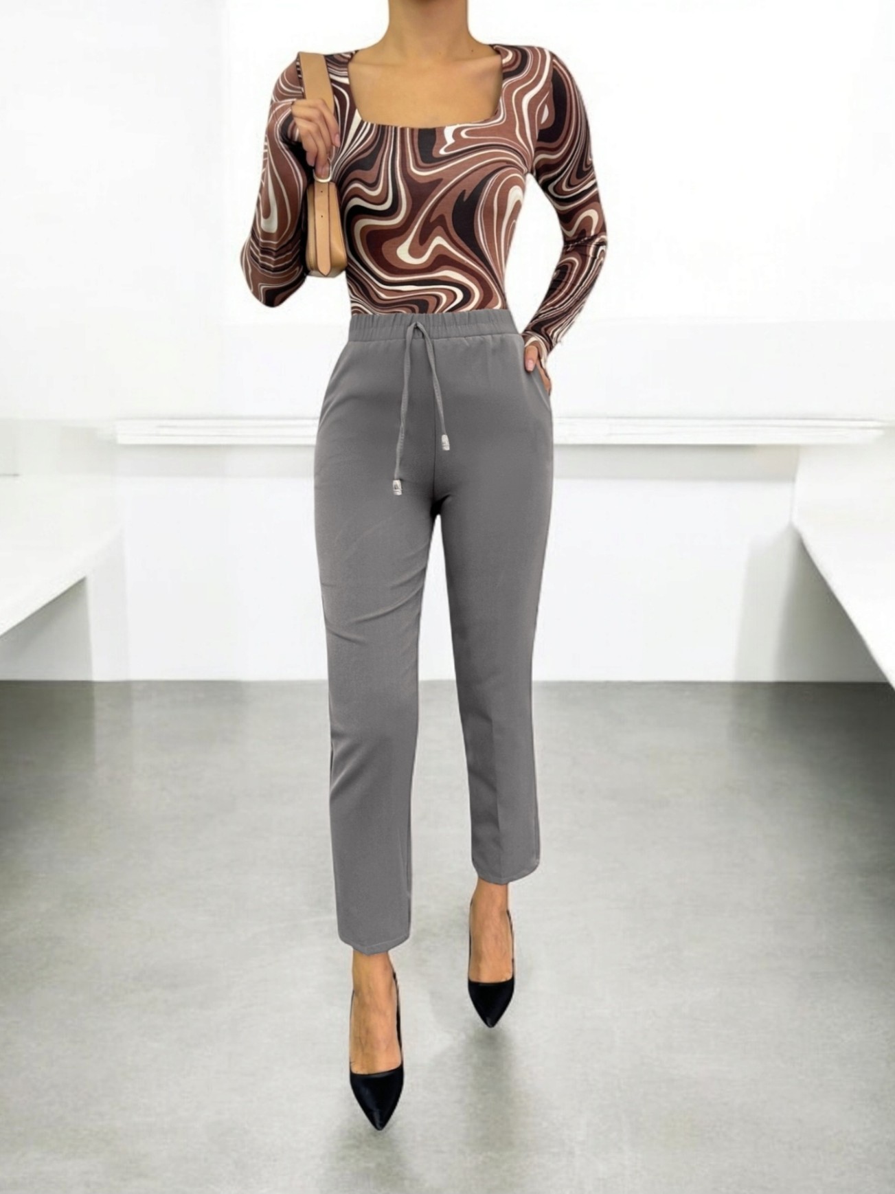 بنطال بخصر مطاطي مع تفاصيل رباط وجيوب مزدوجة يجمع بين الراحة والأناقة. يوفر تصميم الخصر المطاطي راحة إضافية ويتناسب مع الجسم بشكل مثالي، بينما تضيف تفاصيل الرباط لمسة عصرية. يضفي تصميم الجيوب المزدوجة لمسة من الأناقة العملية. مثالي للإطلالات اليومية والمناسبات الراقية، تم تصميم هذا البنطال ليناسب جميع الأساليب. بفضل قماشه عالي الجودة وقصته الأنيقة، سيكون من القطع الأساسية في خزانتك.