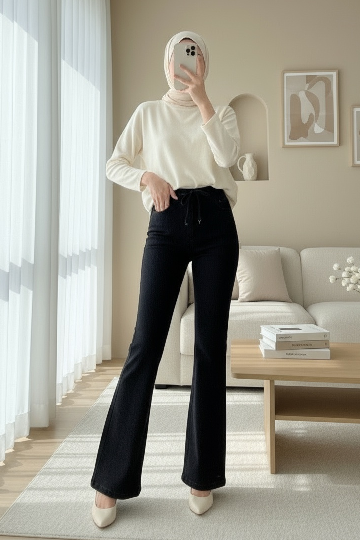 من بين أشهر موديلات الموسم الجديد ، طرازنا من البنطلونات ذات الخصر المطاطي والرباط وأساور الساق العريضة وبدون جيوب.