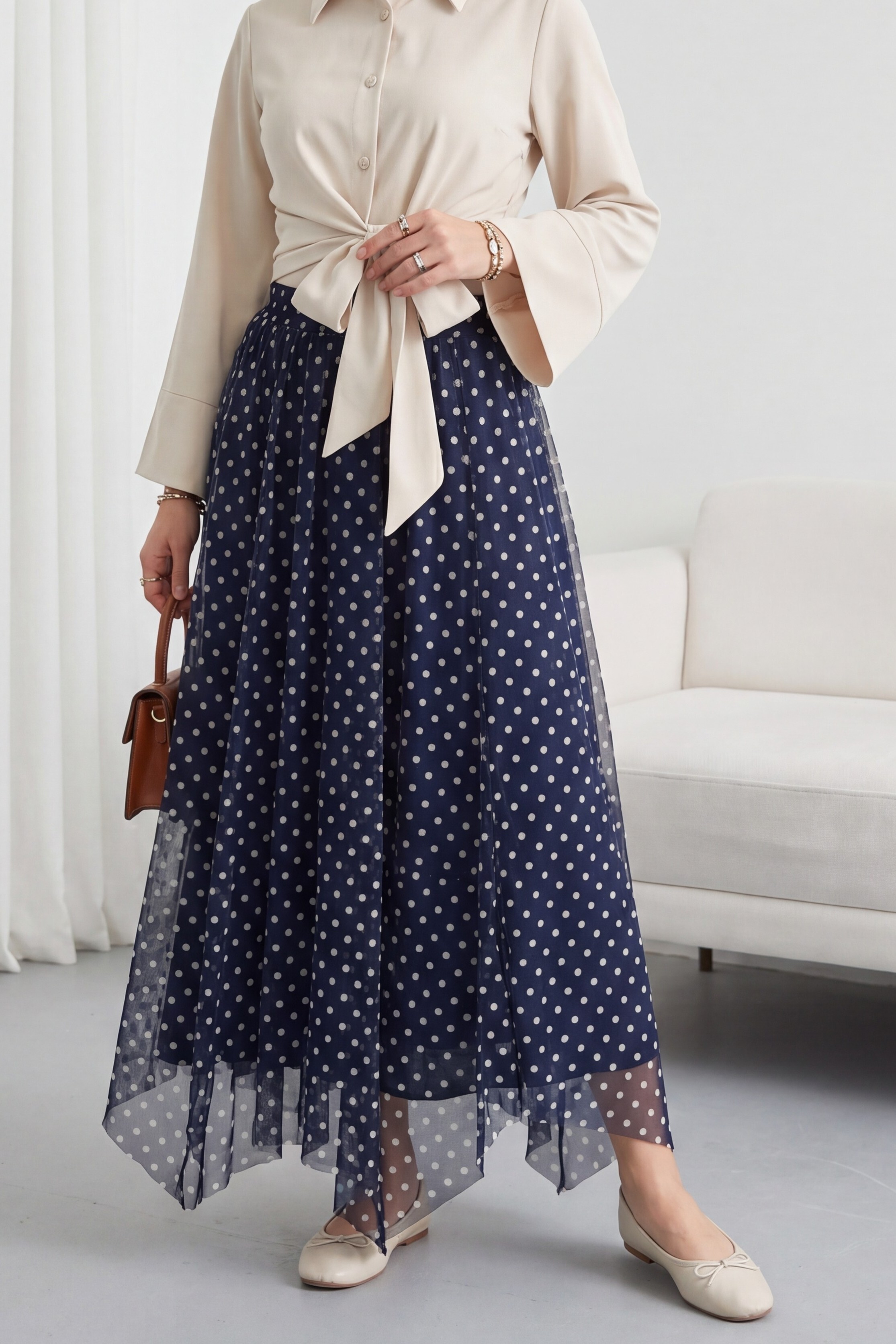 تنورة شيفون غير متماثلة، ذات ألواح، مبطنة، مع خصر مطاطي. -كحلي