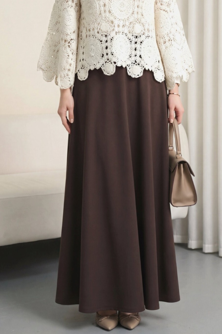 تنورة واسعة من قماش الكريب ليكرا مستورد بخصر مطاطي -بني محروق
