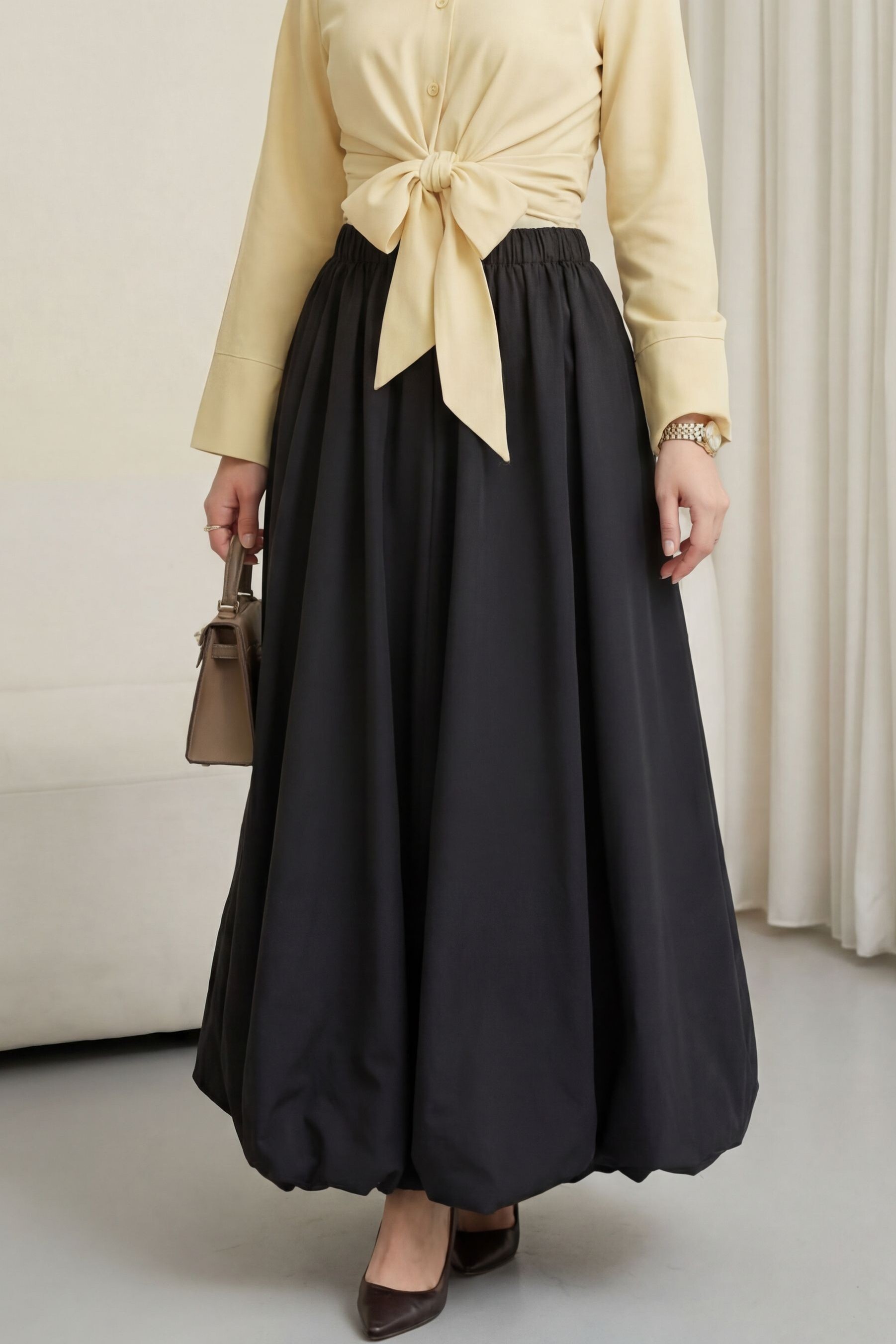 تنورة بالون من قماش البوبلين مبطنة بحزام خصر مطاطي -أسود