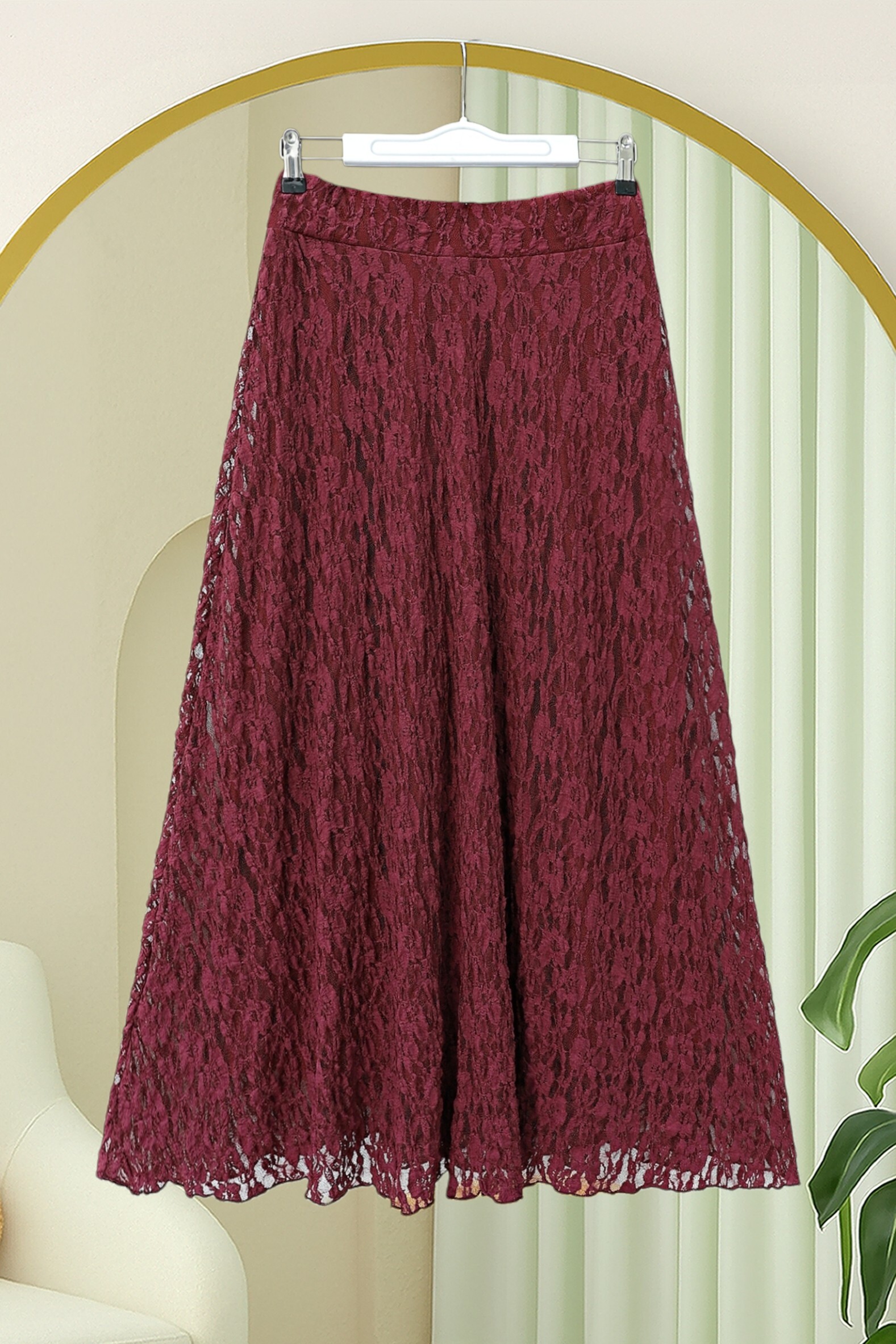 تنورة من الدانتيل الجيبور المبطن بنقوش -بوردو