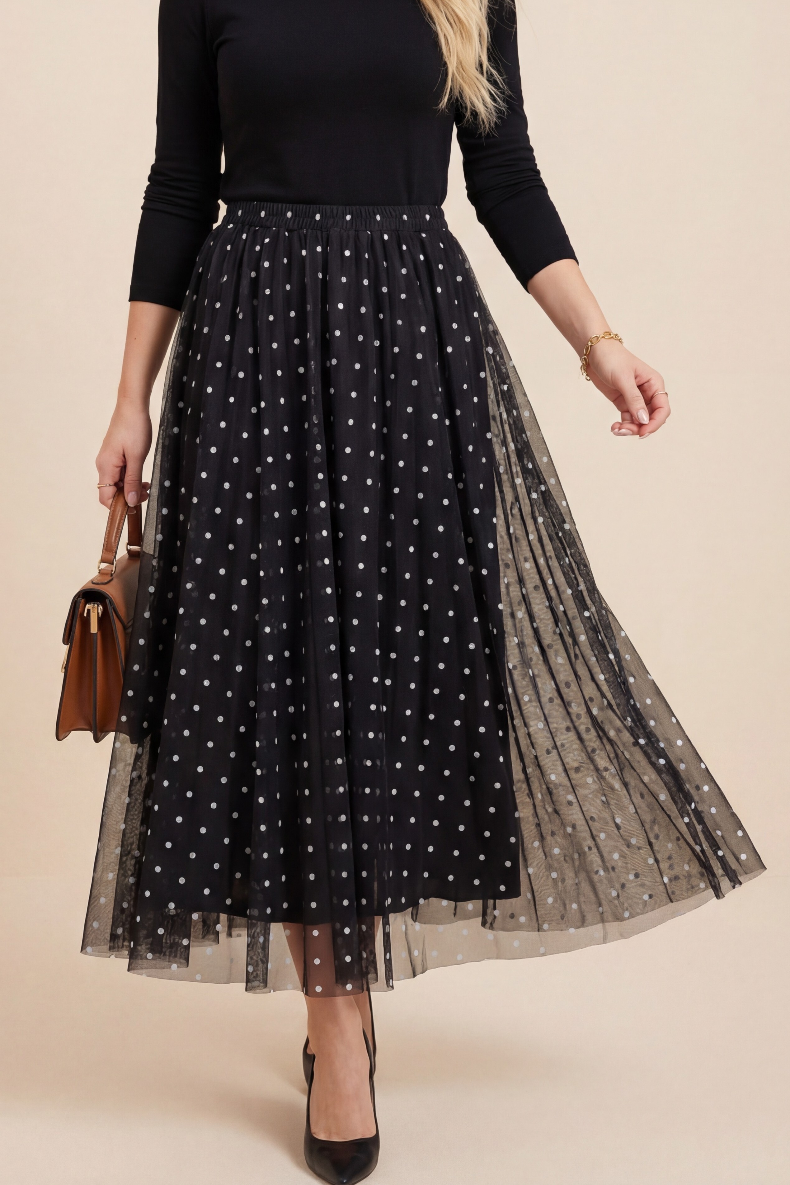 تنورة من التول مبطنة بنقاط البولكا مع خصر مطاطي -بني محروق
