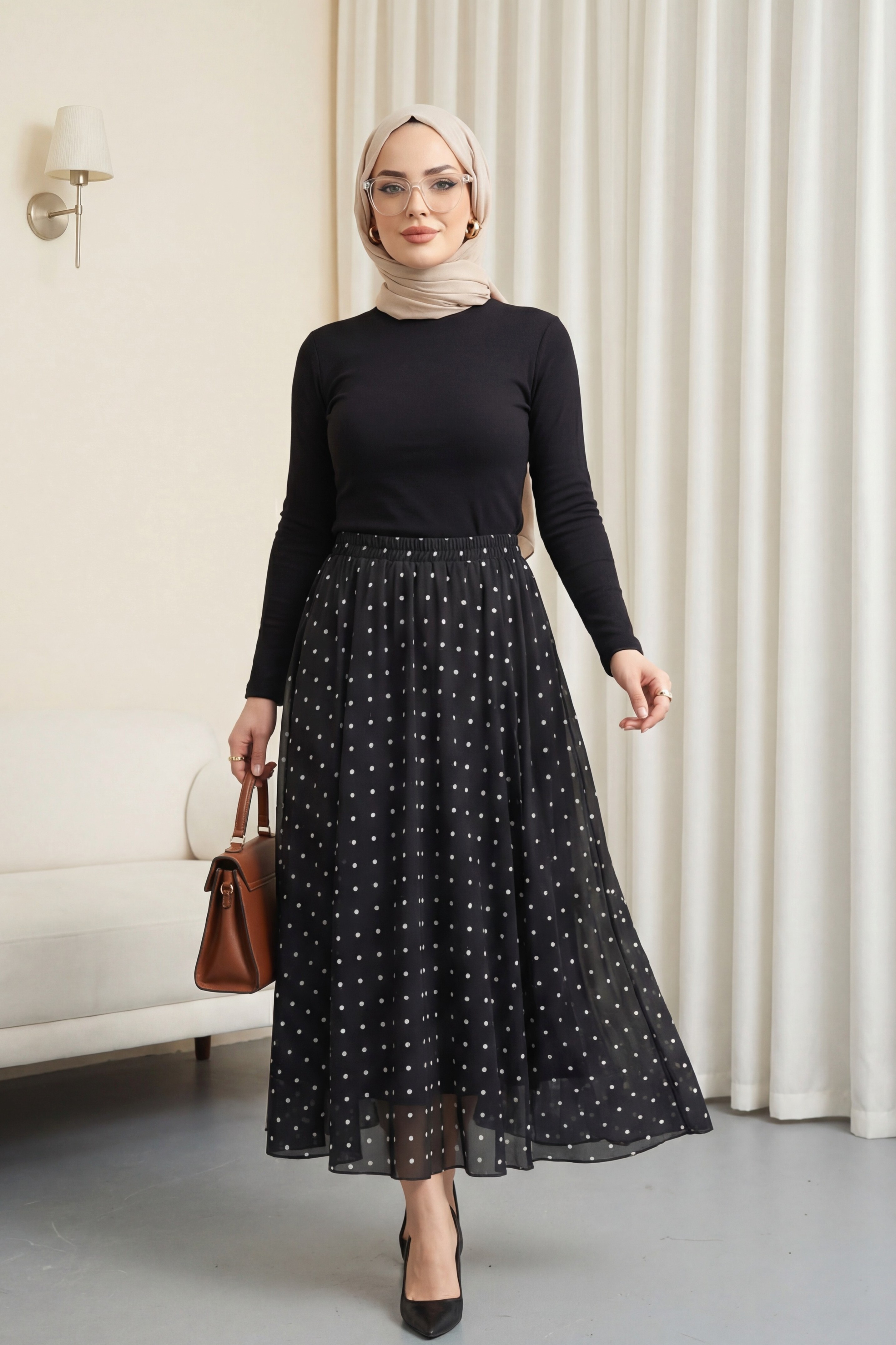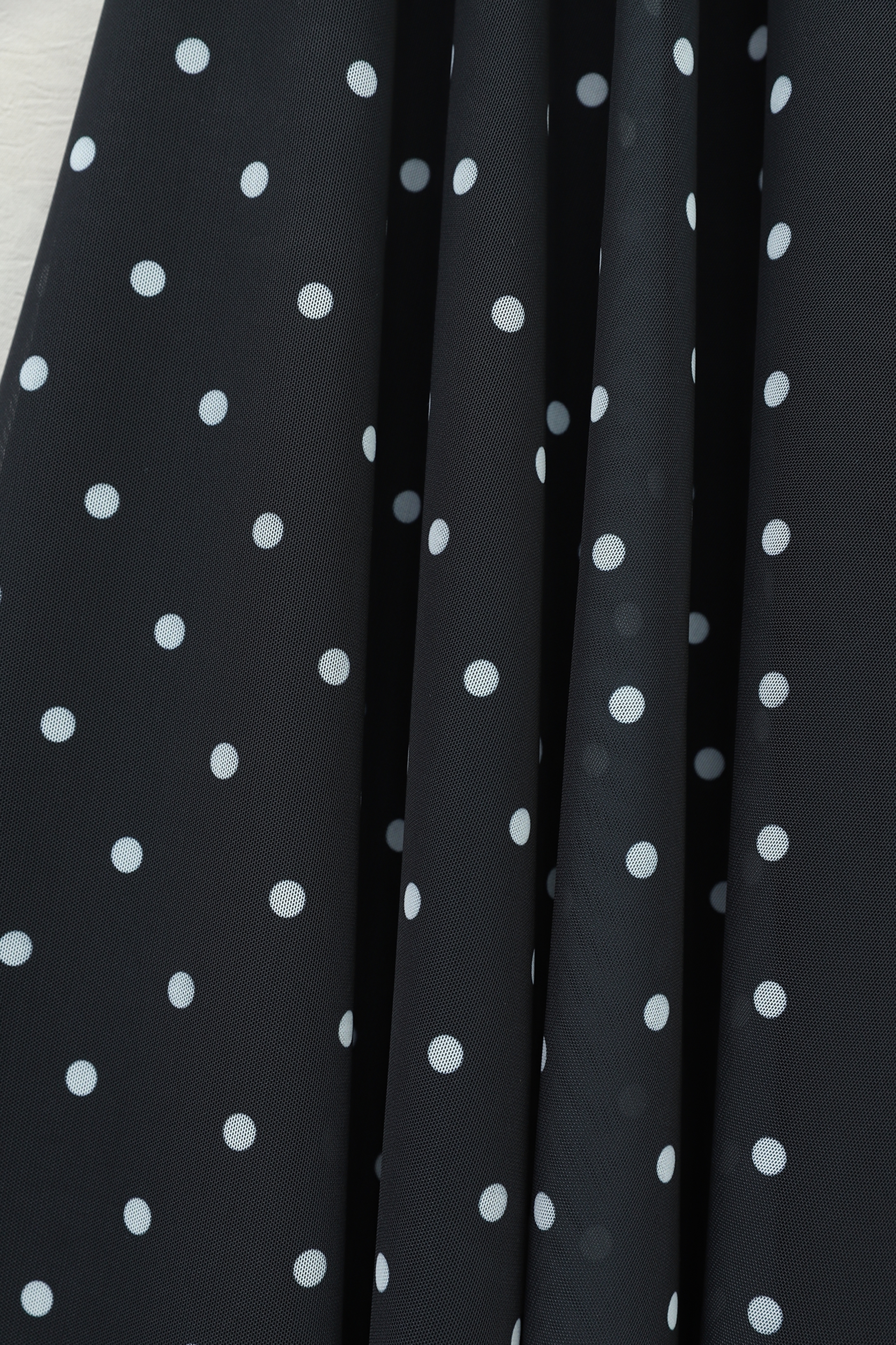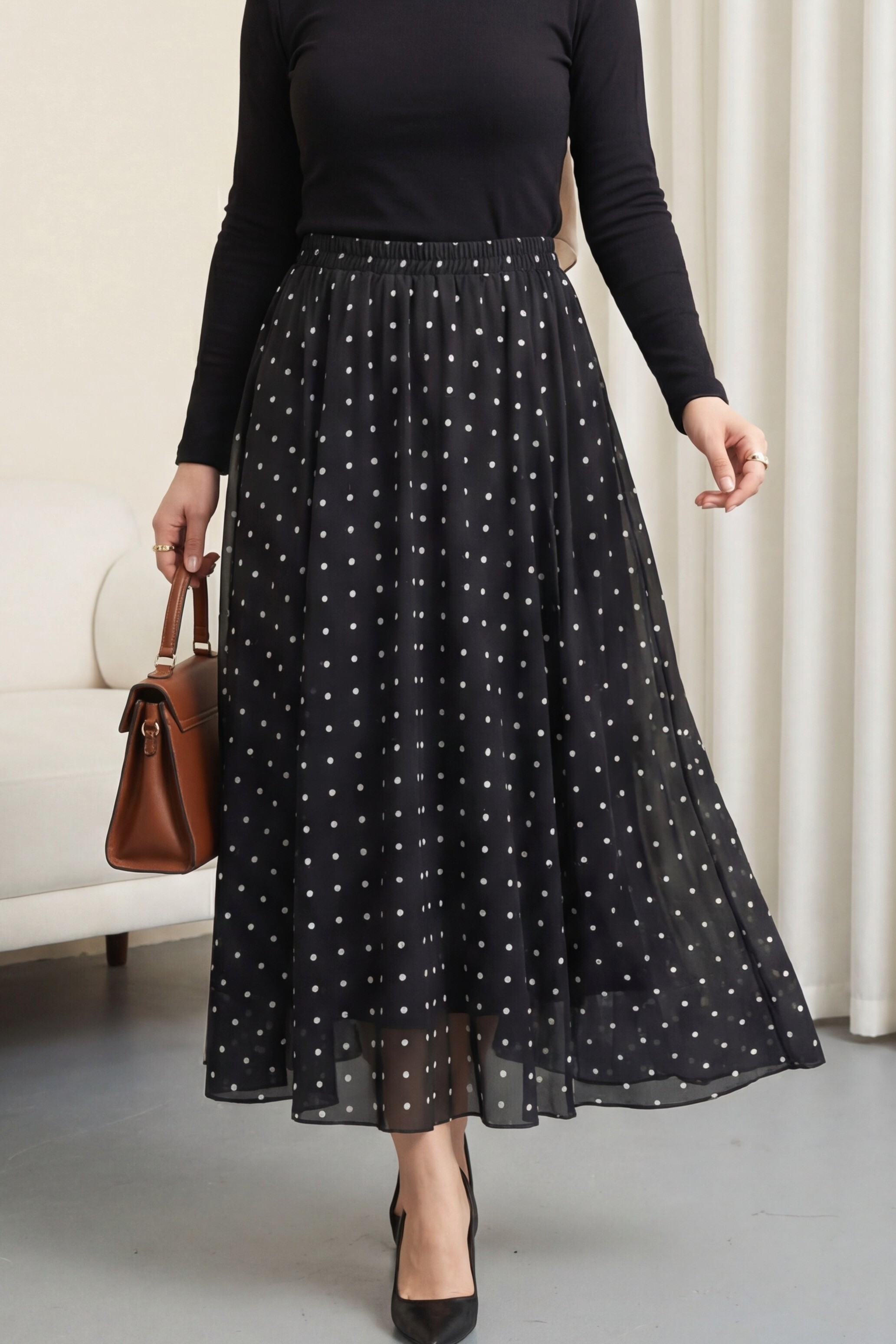 تنورة من التول مبطنة بنقاط البولكا مع خصر مطاطي -أسود