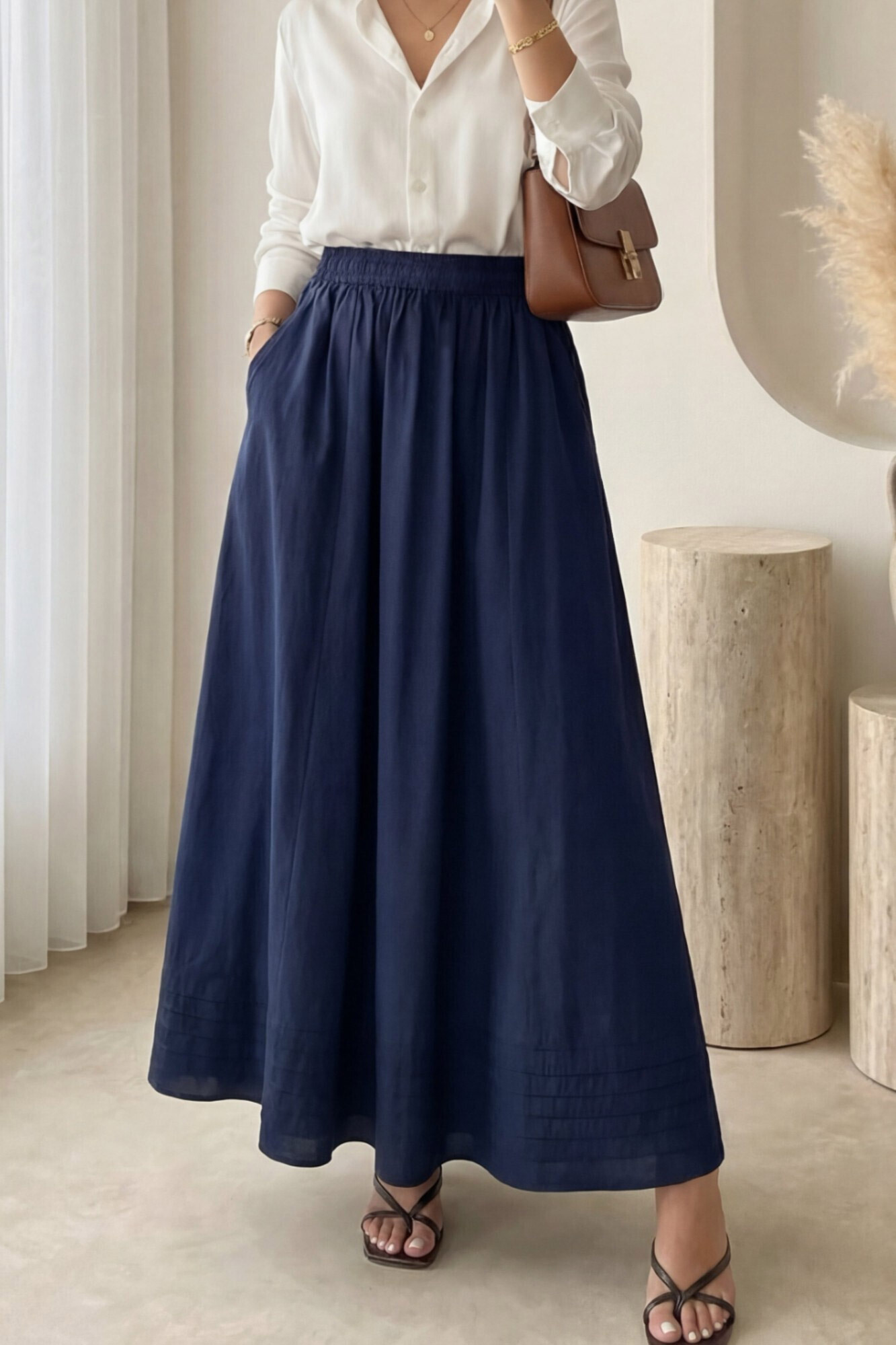 تنورة بخصر مطاطي وجيوب وتفاصيل خياطة -كحلي