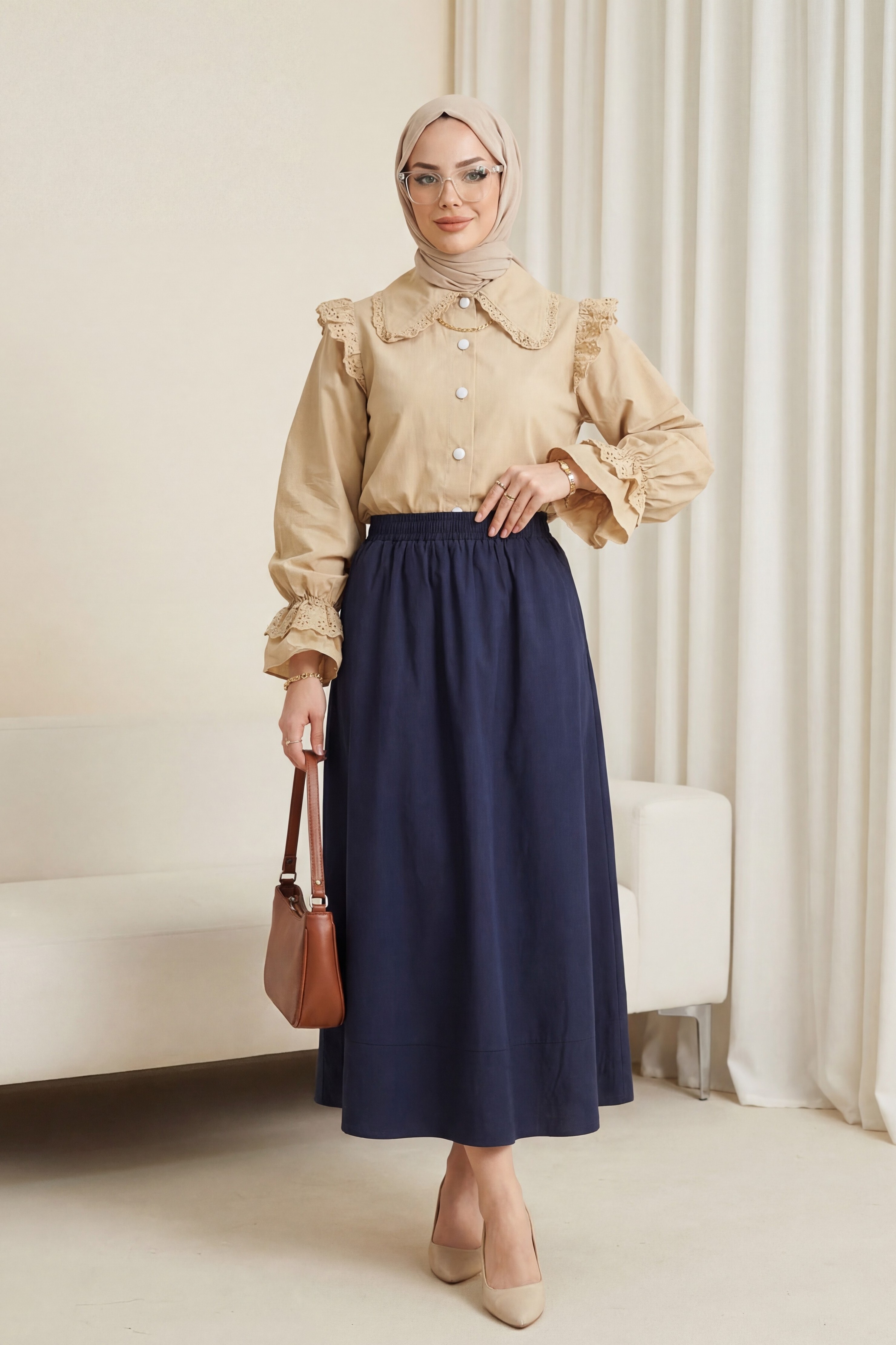 قميص بيضاوي الشكل ملفوف بأكمام الكفة -بيج كاشف