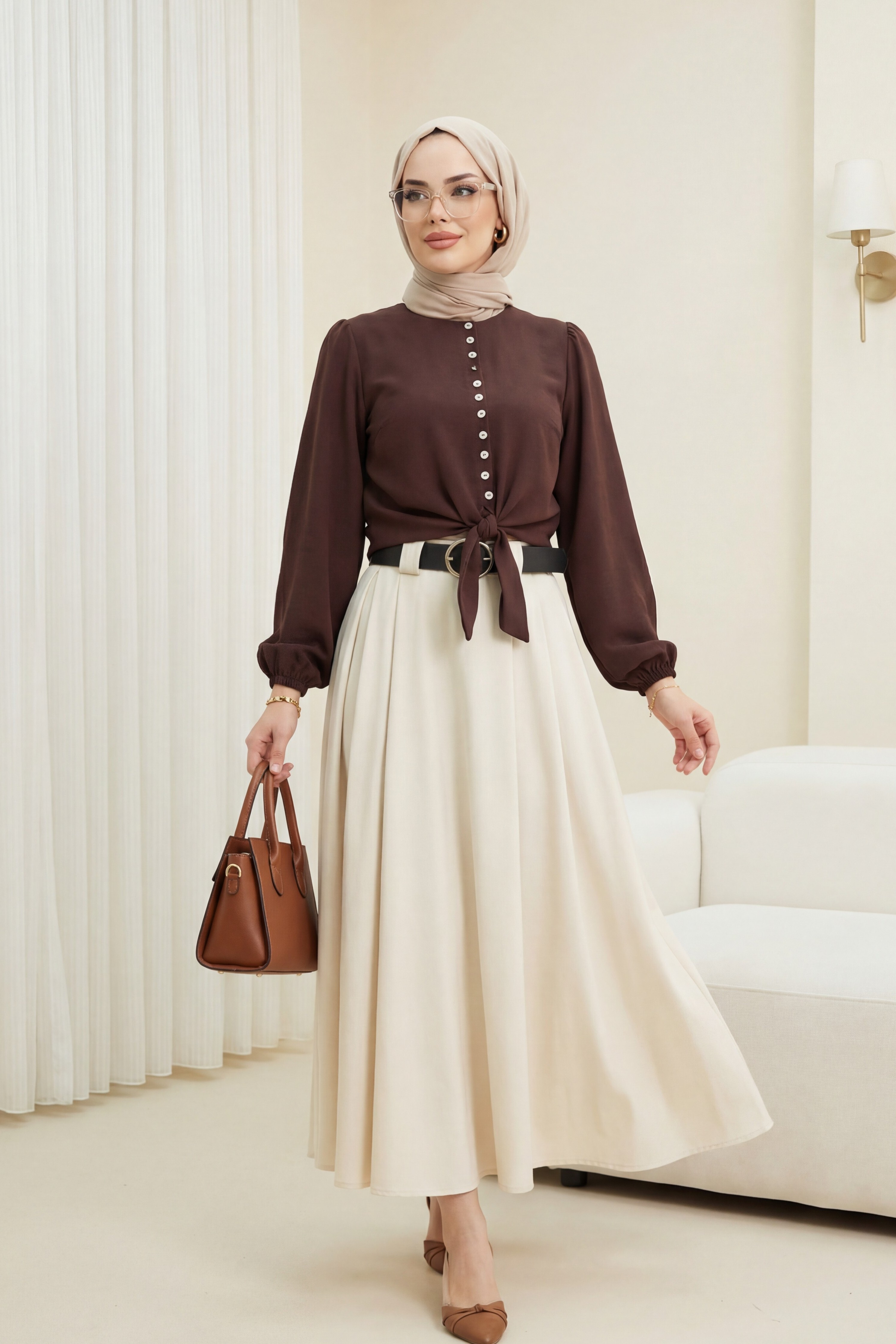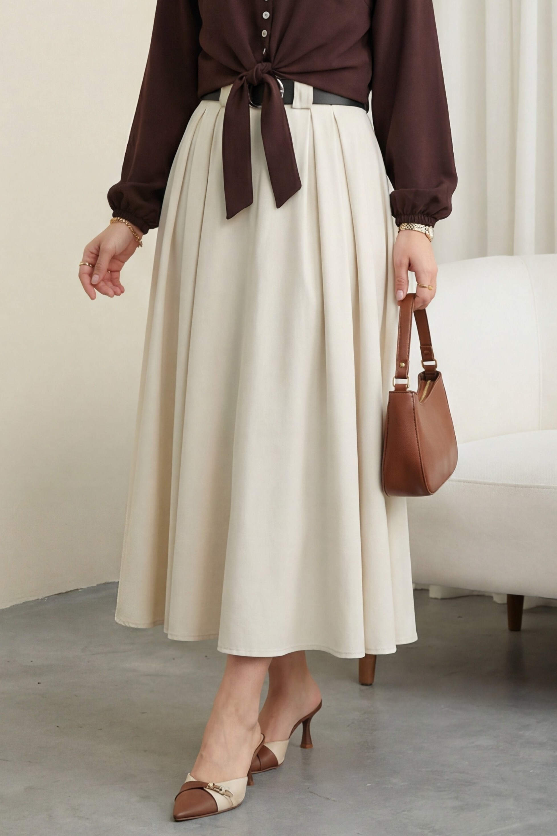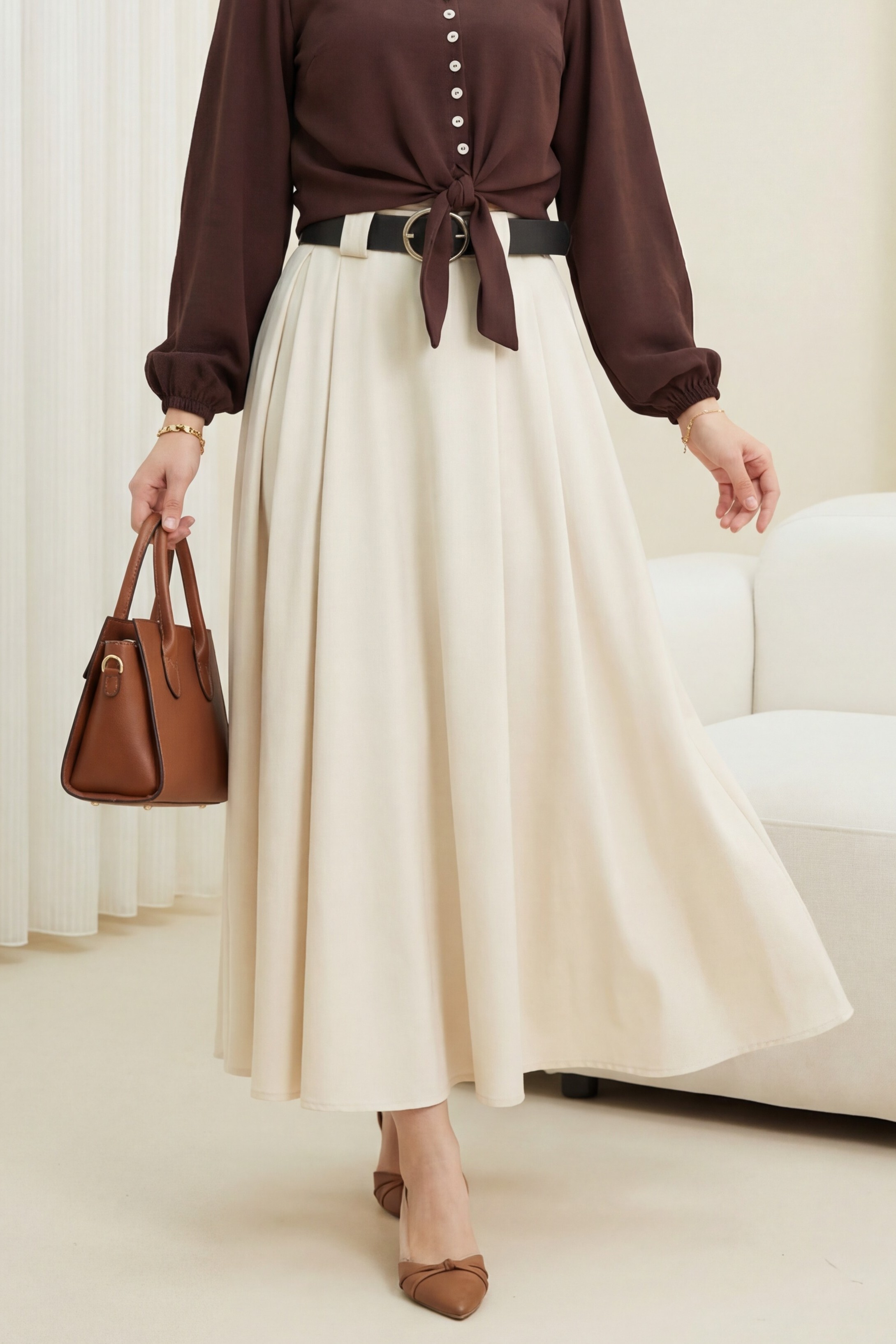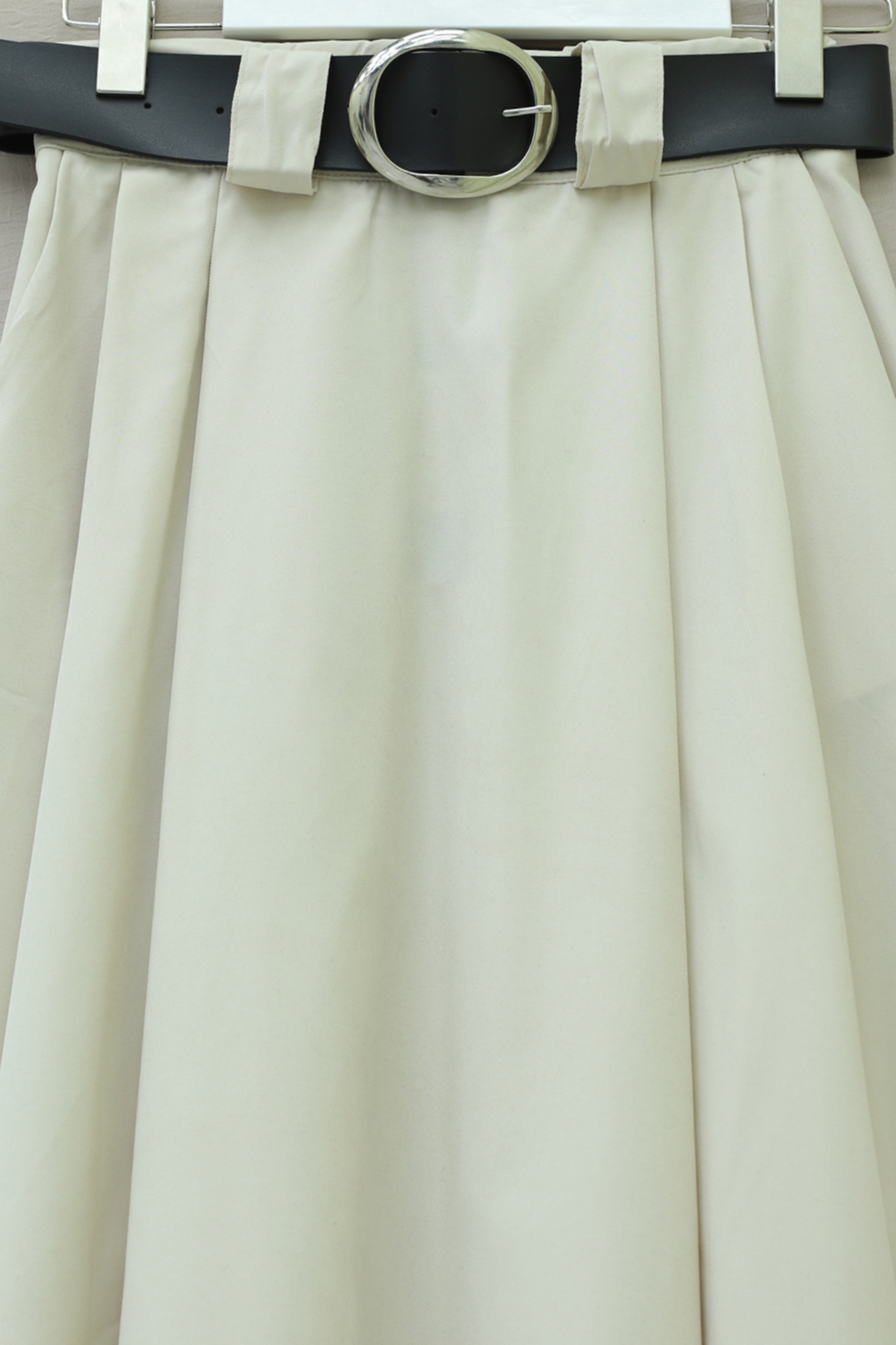 تنورة من قماش التويل مزودة بحزام سميك، وكسرات أمامية، وجيوب جانبية، وسحاب.-اللون البيج