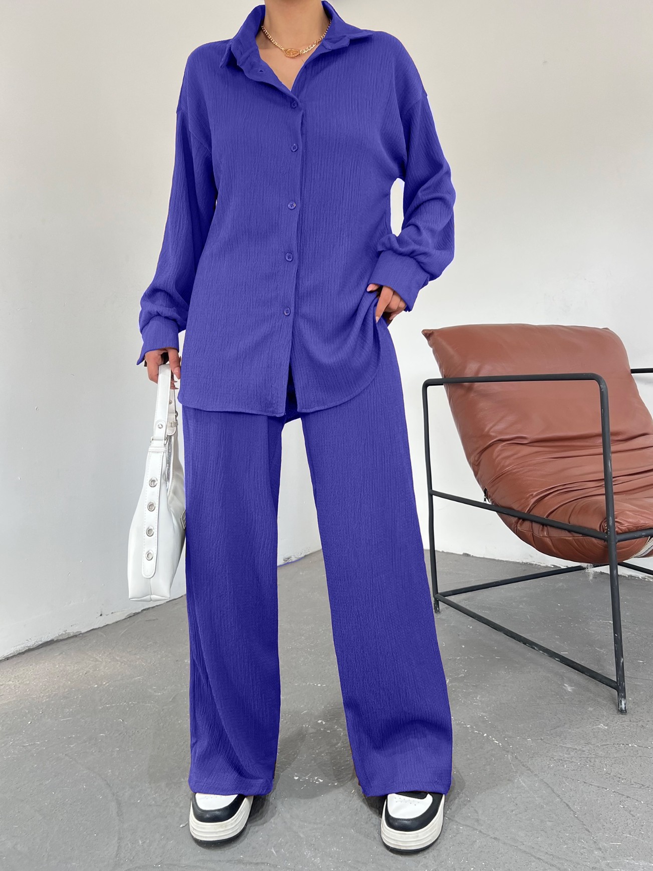 بأزرار من الأمام من قميصه ، وأكتاف منسدلة ، وأساور أكمام مطاطية ؛ يعد نموذج البدلة الخاص بنا مع حزام خصر مرن وأرجل عريضة وبنطلون بدون جيوب من بين أكثر الموديلات شعبية في الموسم الجديد.
