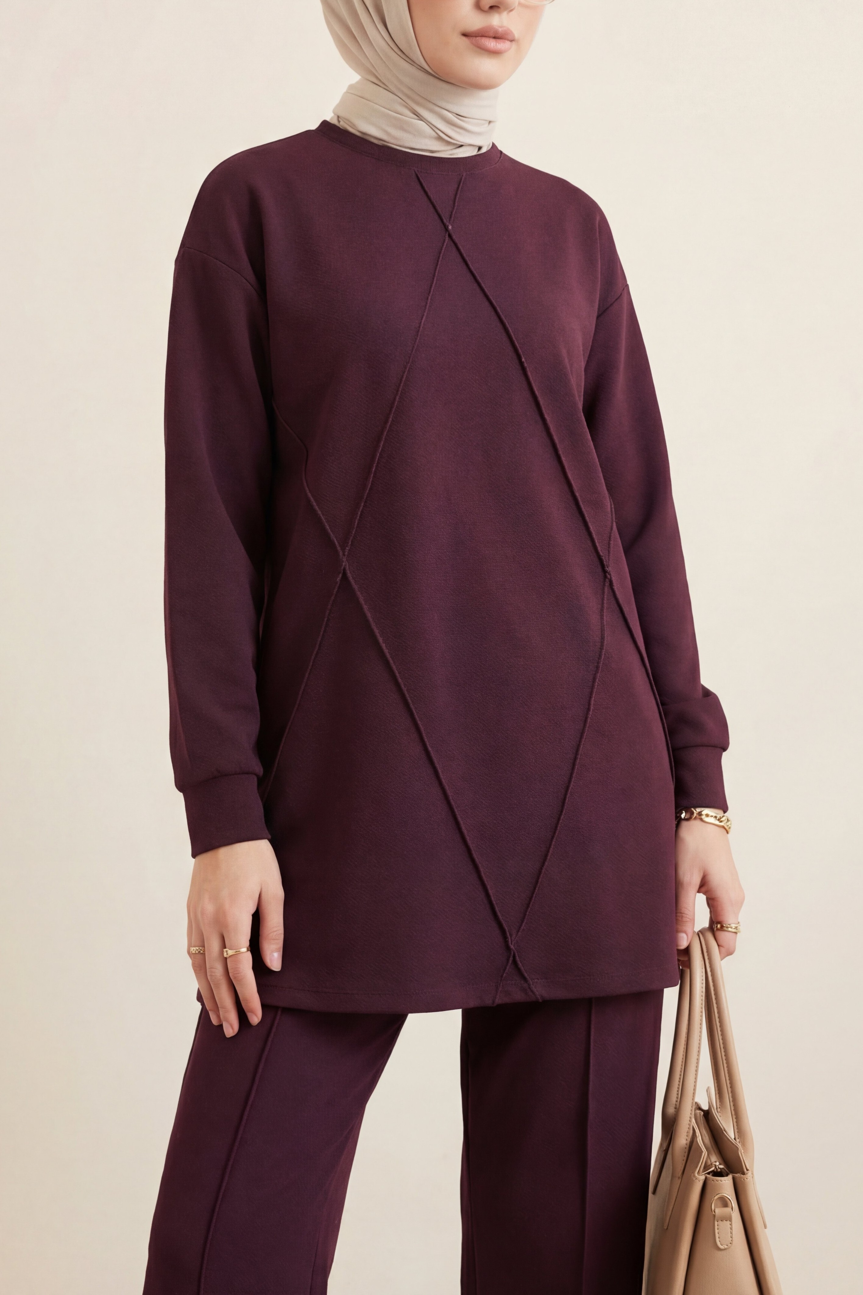 ملحوظة: محتوى المنتج يتكون من تونيك وبنطلون. (تستخدم الأحذية والحقائب والمجوهرات لأغراض الزينة.)