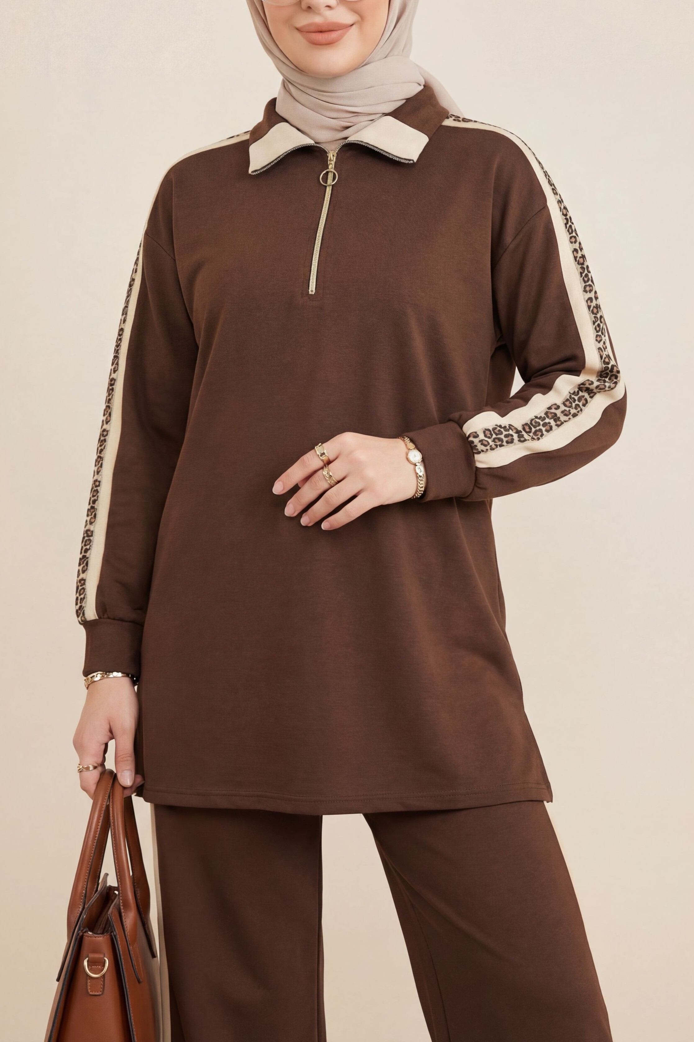 طقم كيمونو مع بنطال برباط أمامي مزدوج -قهوة مفتوحة