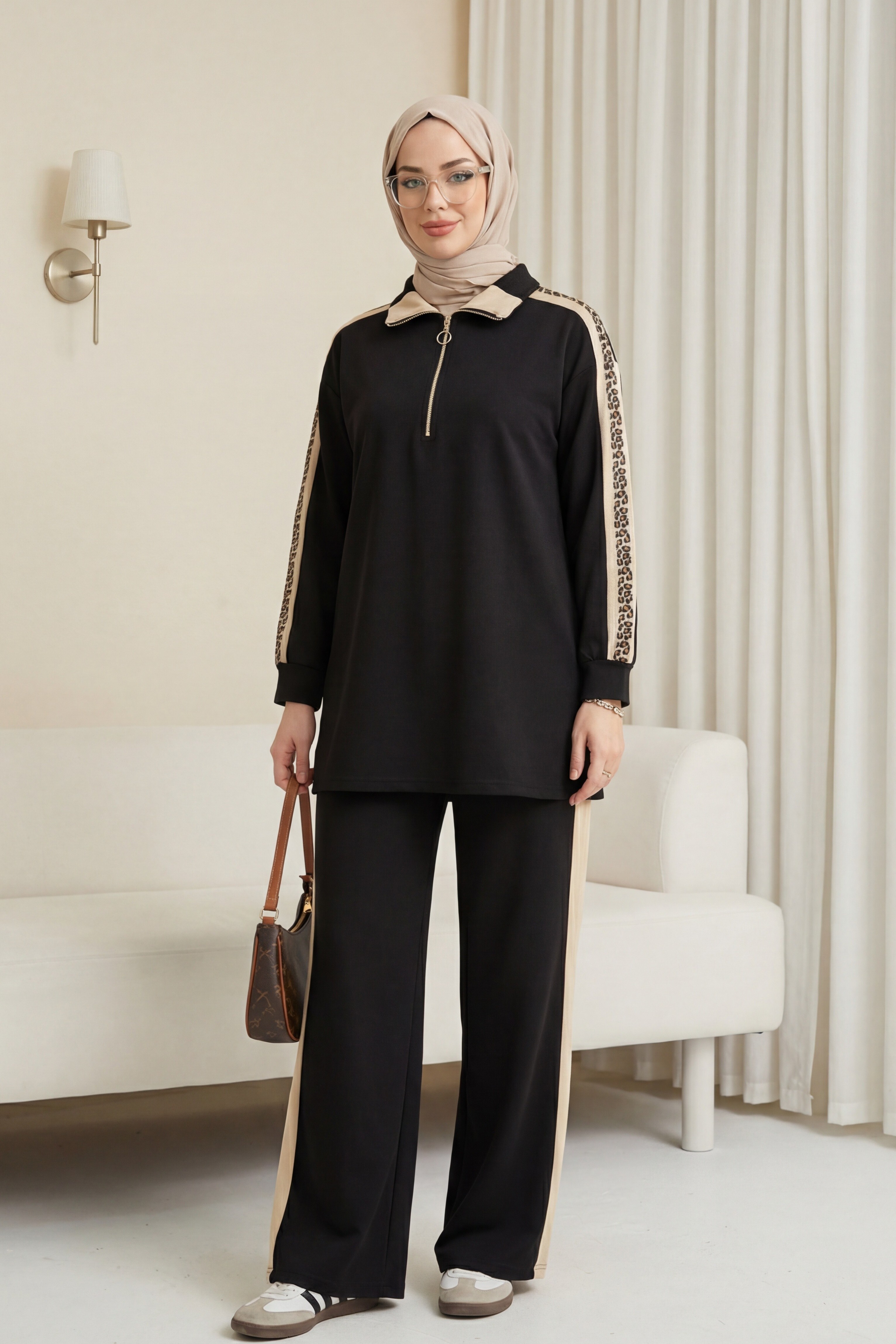 طقم كيمونو مع بنطال برباط أمامي مزدوج -قهوة مفتوحة