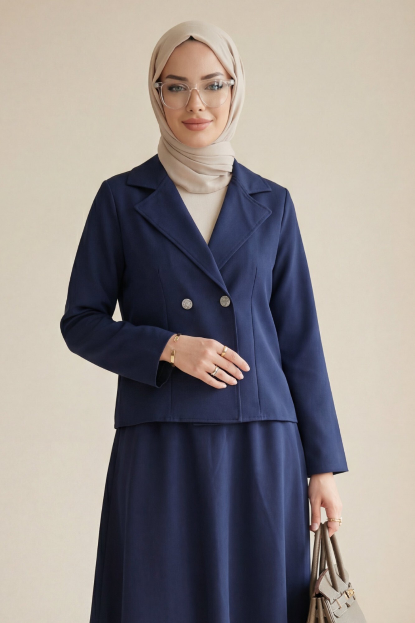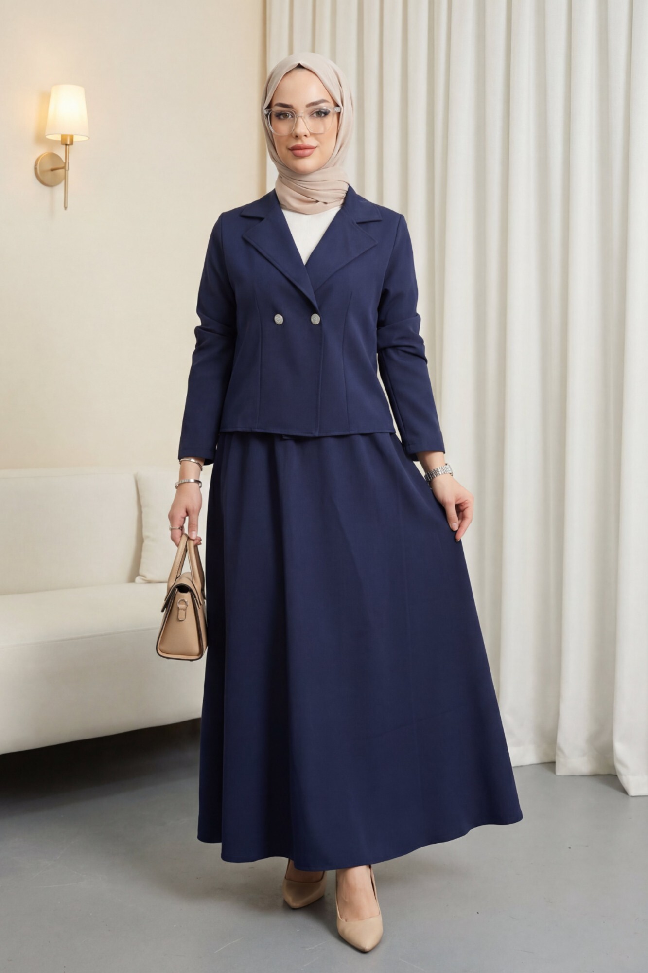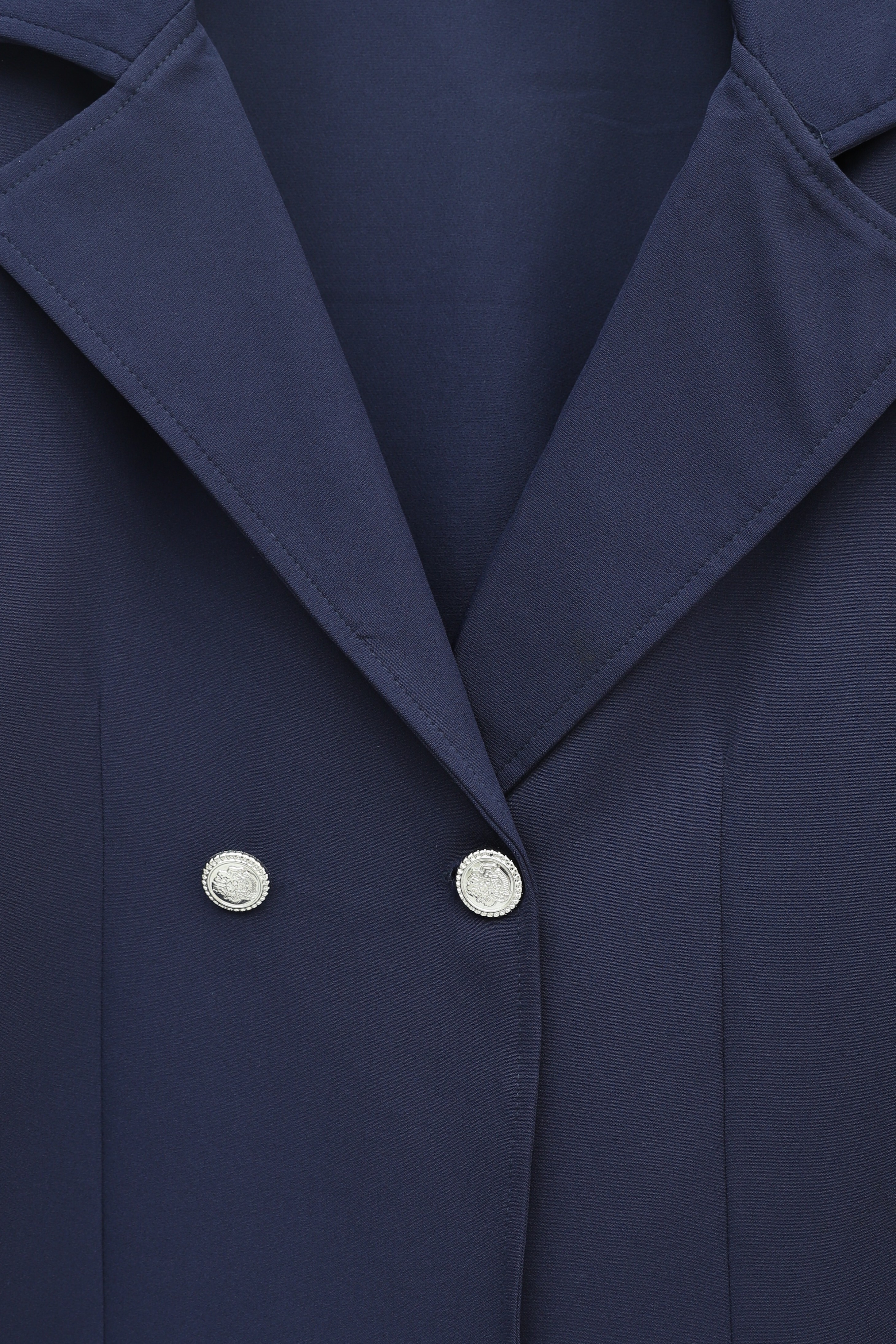 طقم جاكيت وبنطلون مزدوج الصدر مع حزام وردي -اللون النيلي
