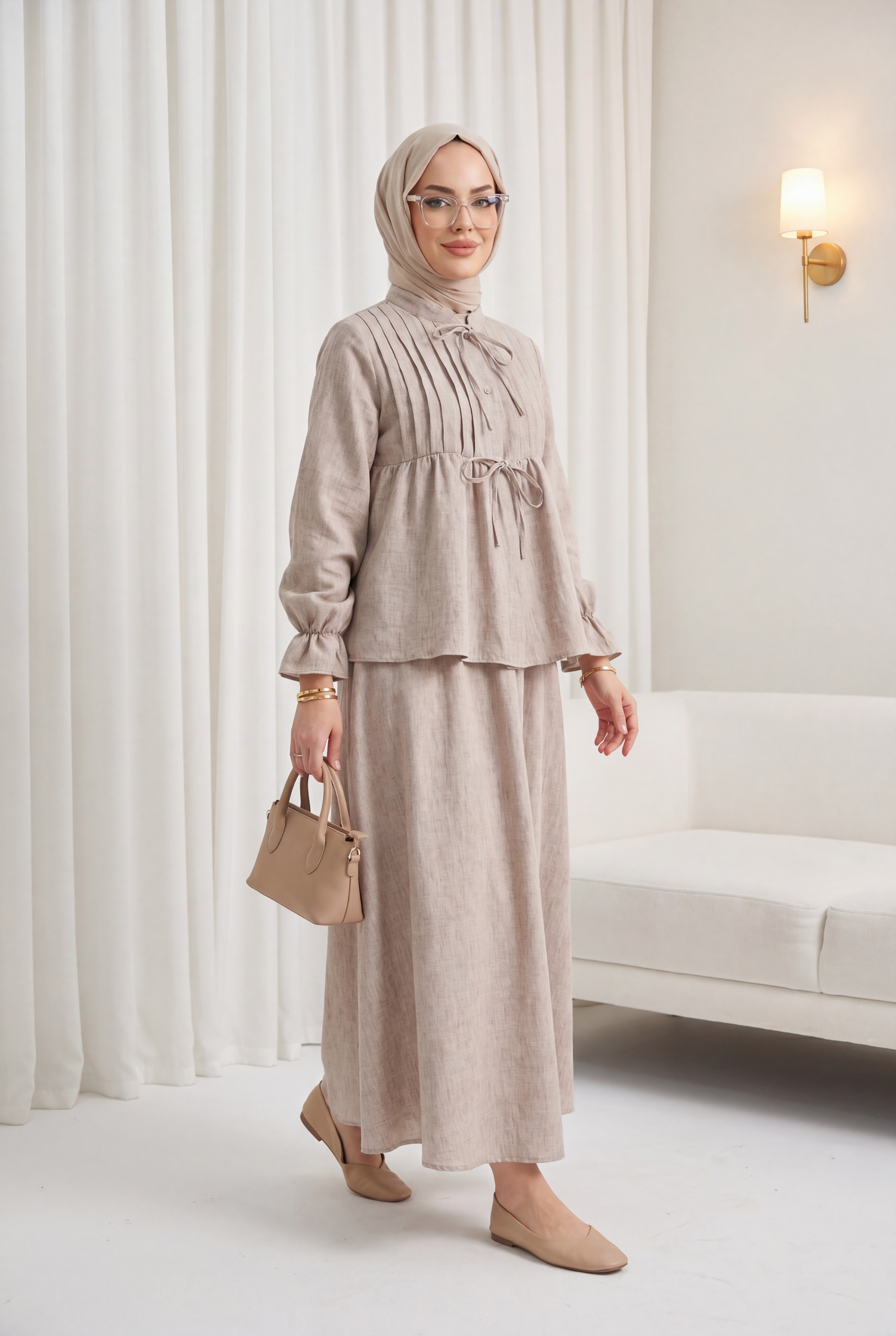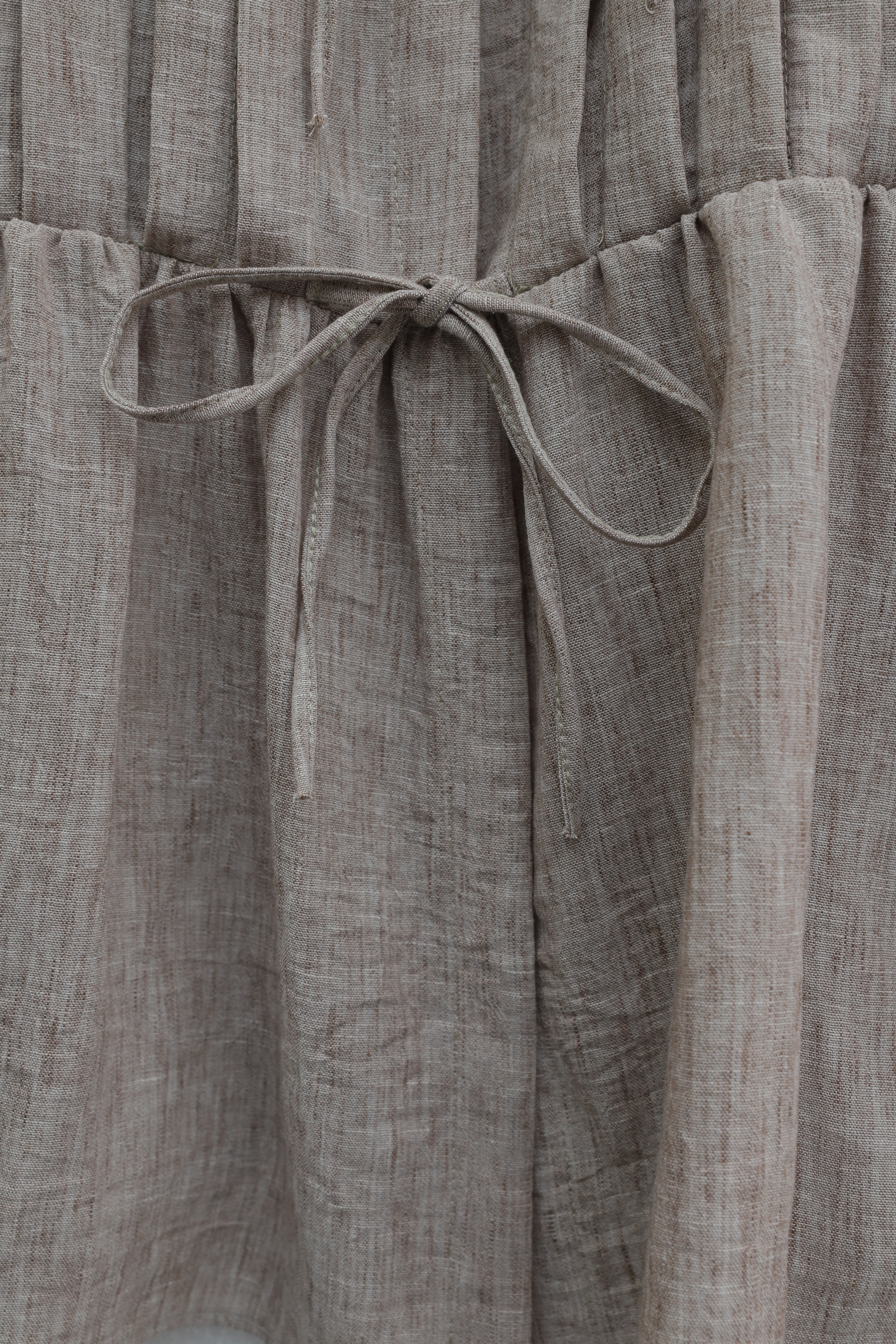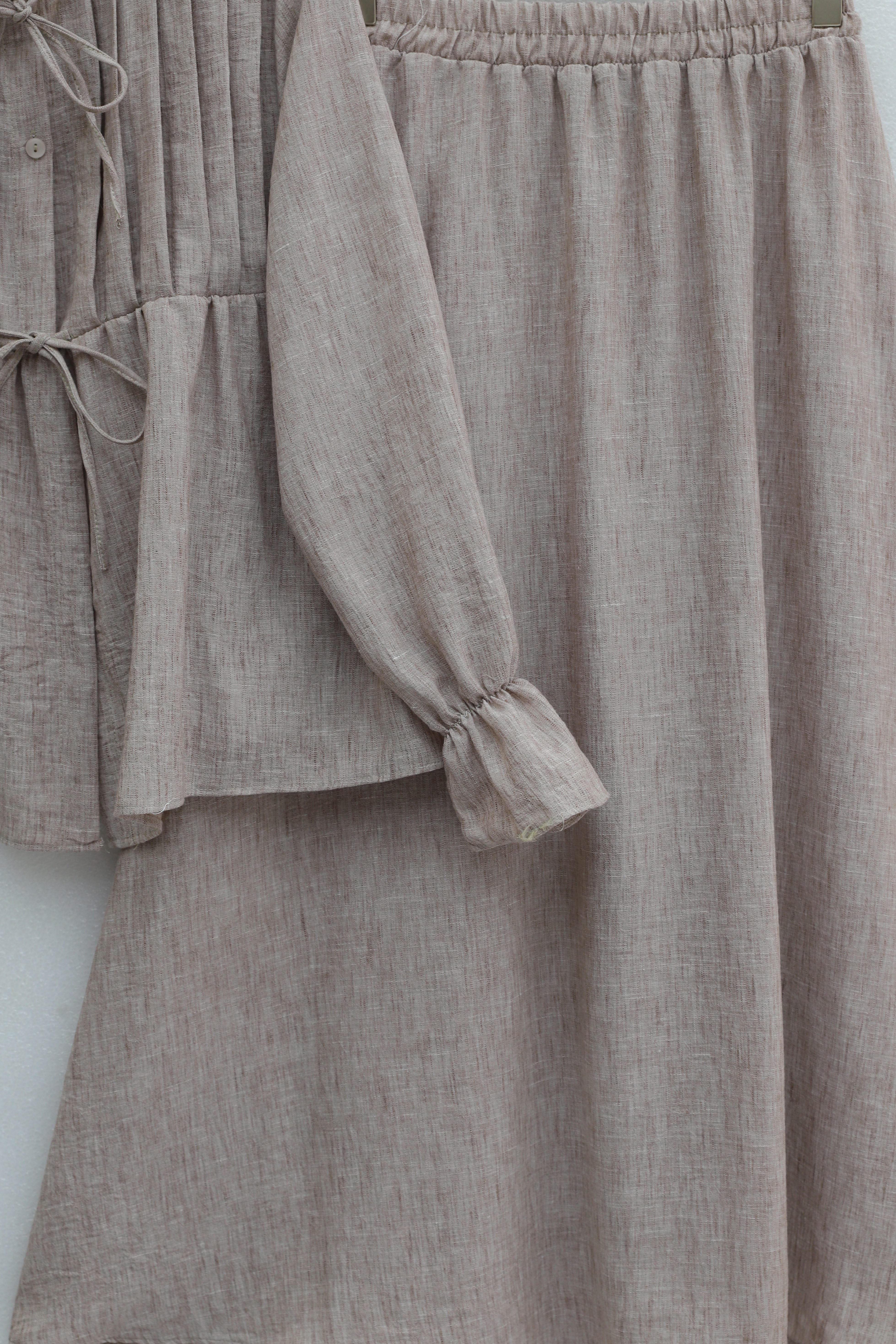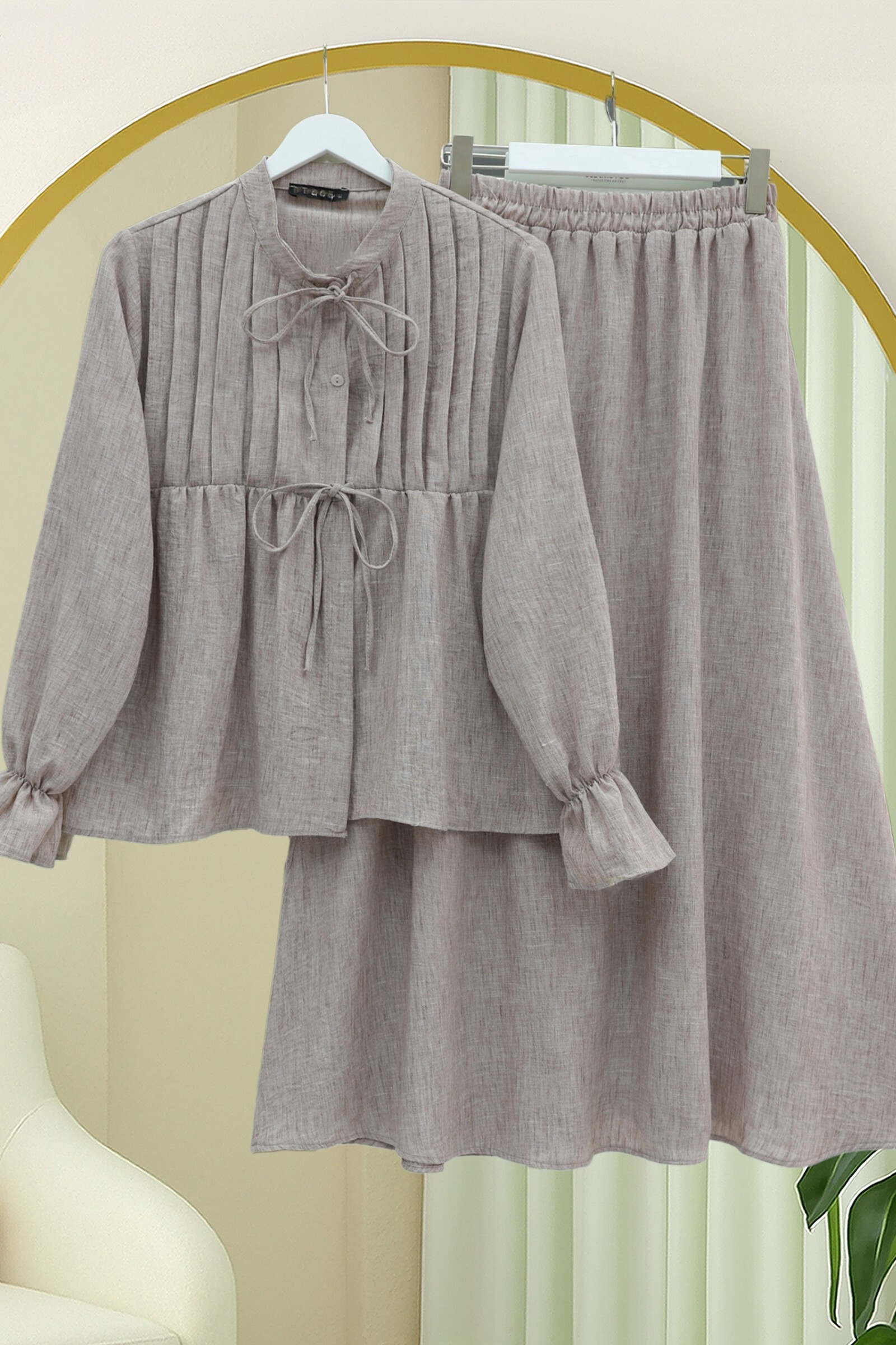 طقم تنورة من الكتان بنصف أزرار وأكمام مطاطية ورباط أمامي -قهوة مفتوحة