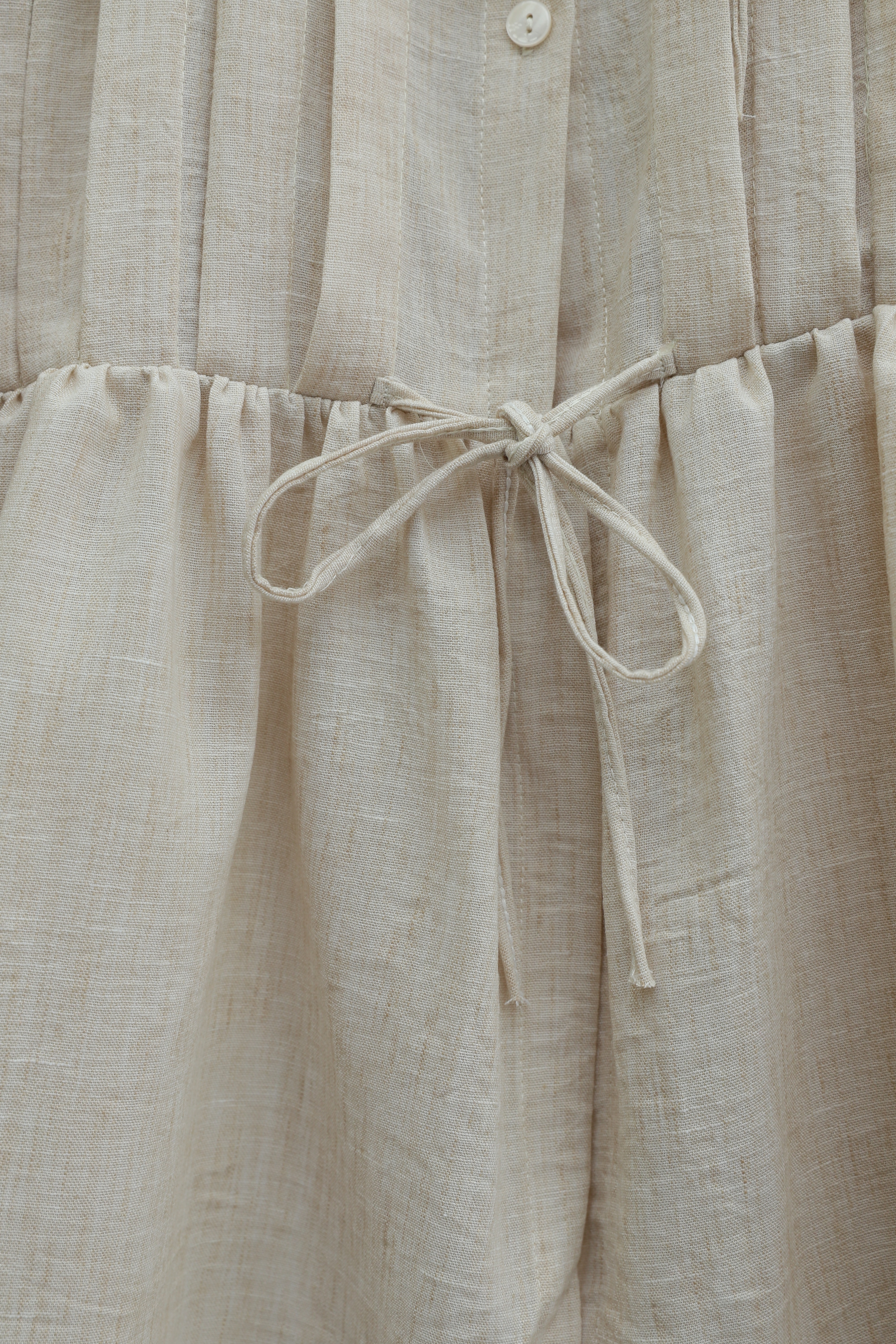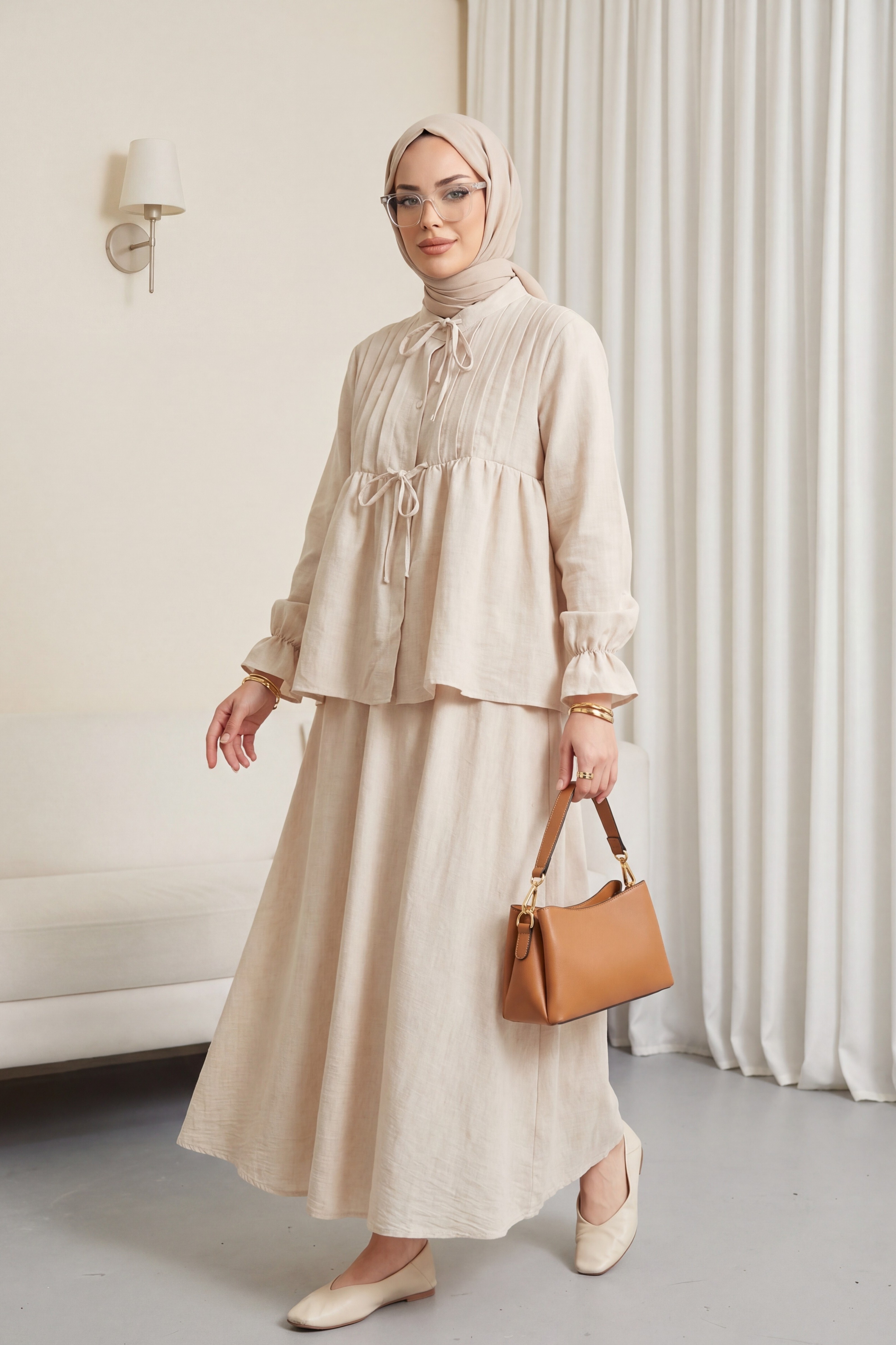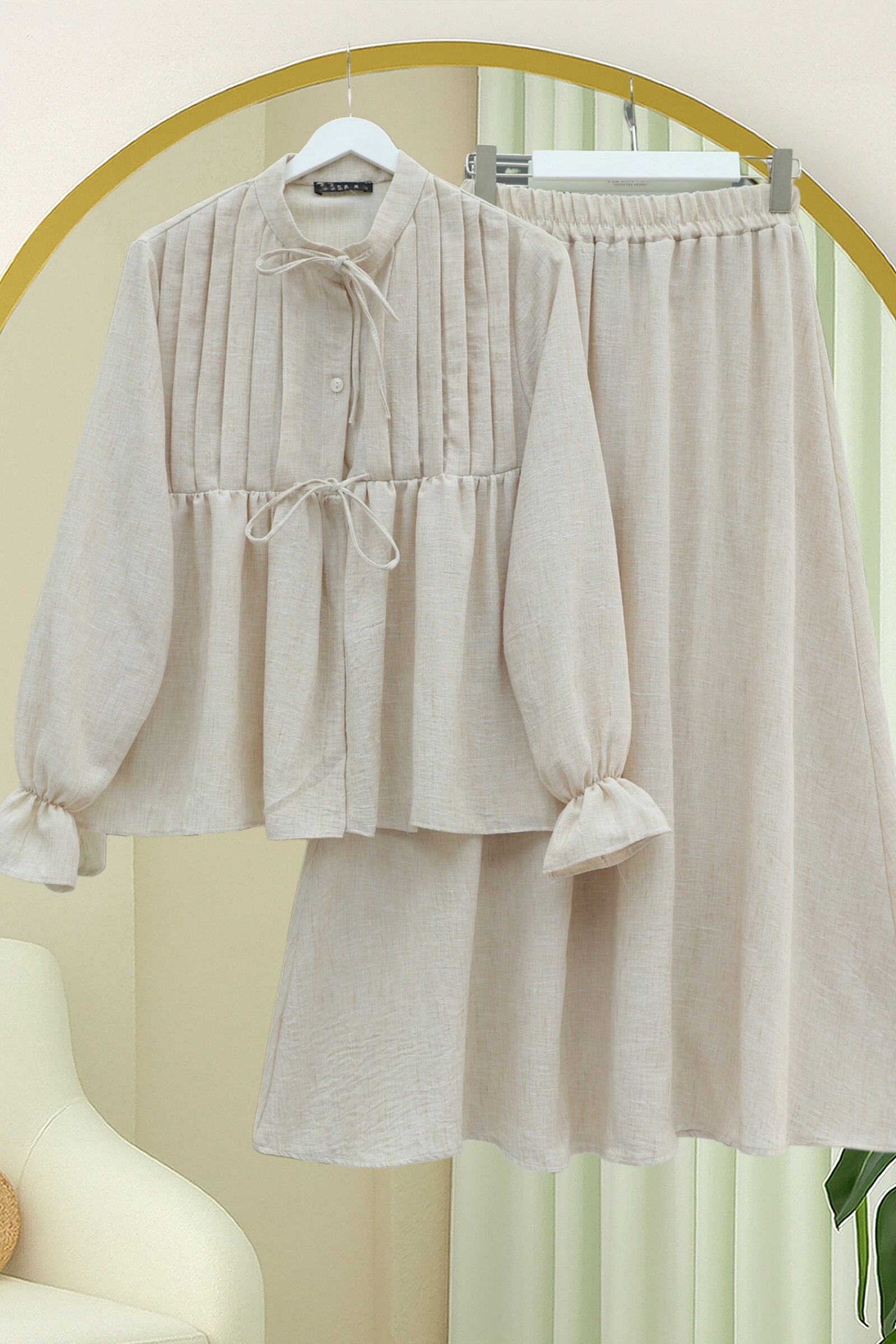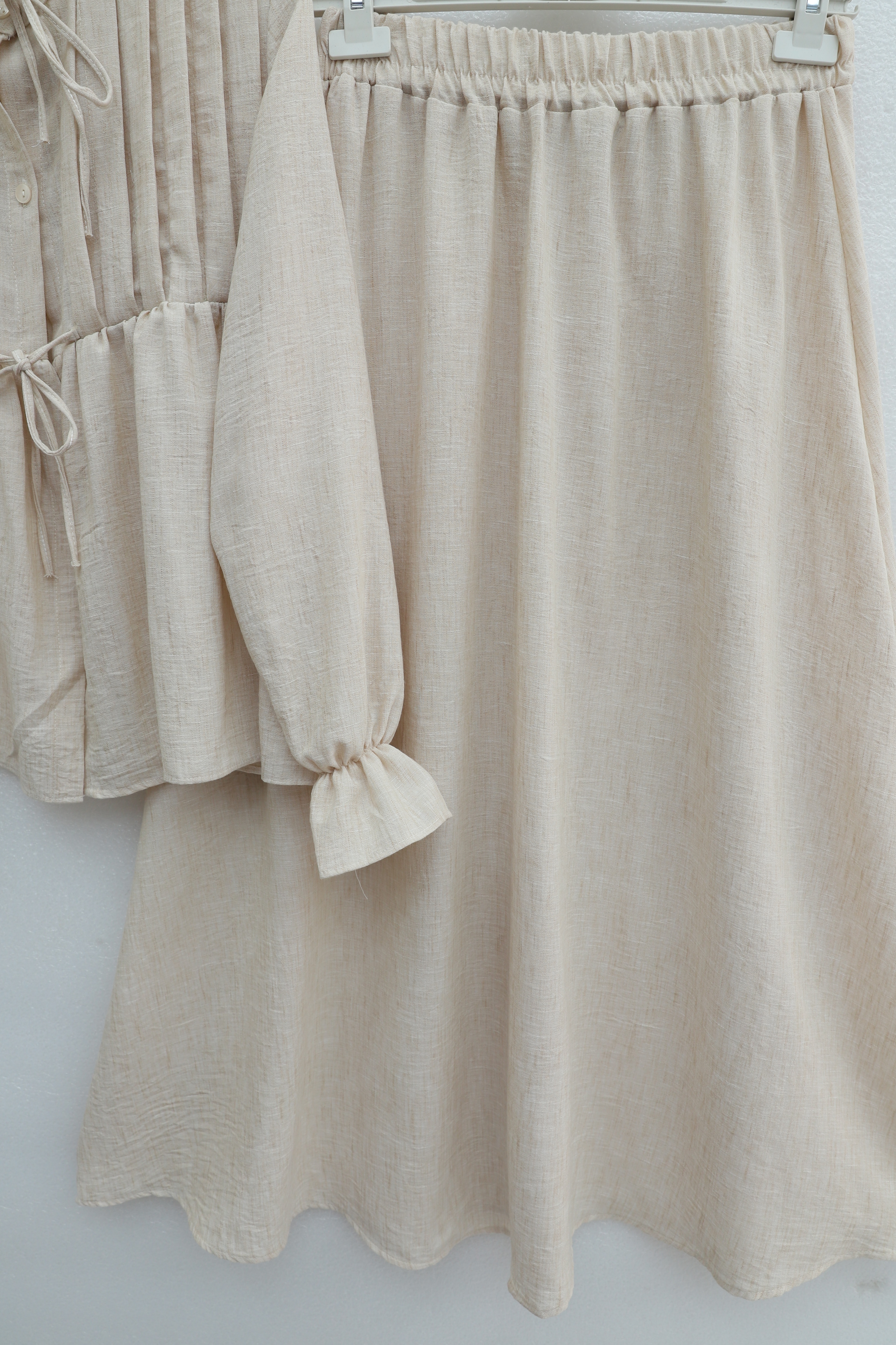 طقم تنورة من الكتان بنصف أزرار وأكمام مطاطية ورباط أمامي -اللون البيج