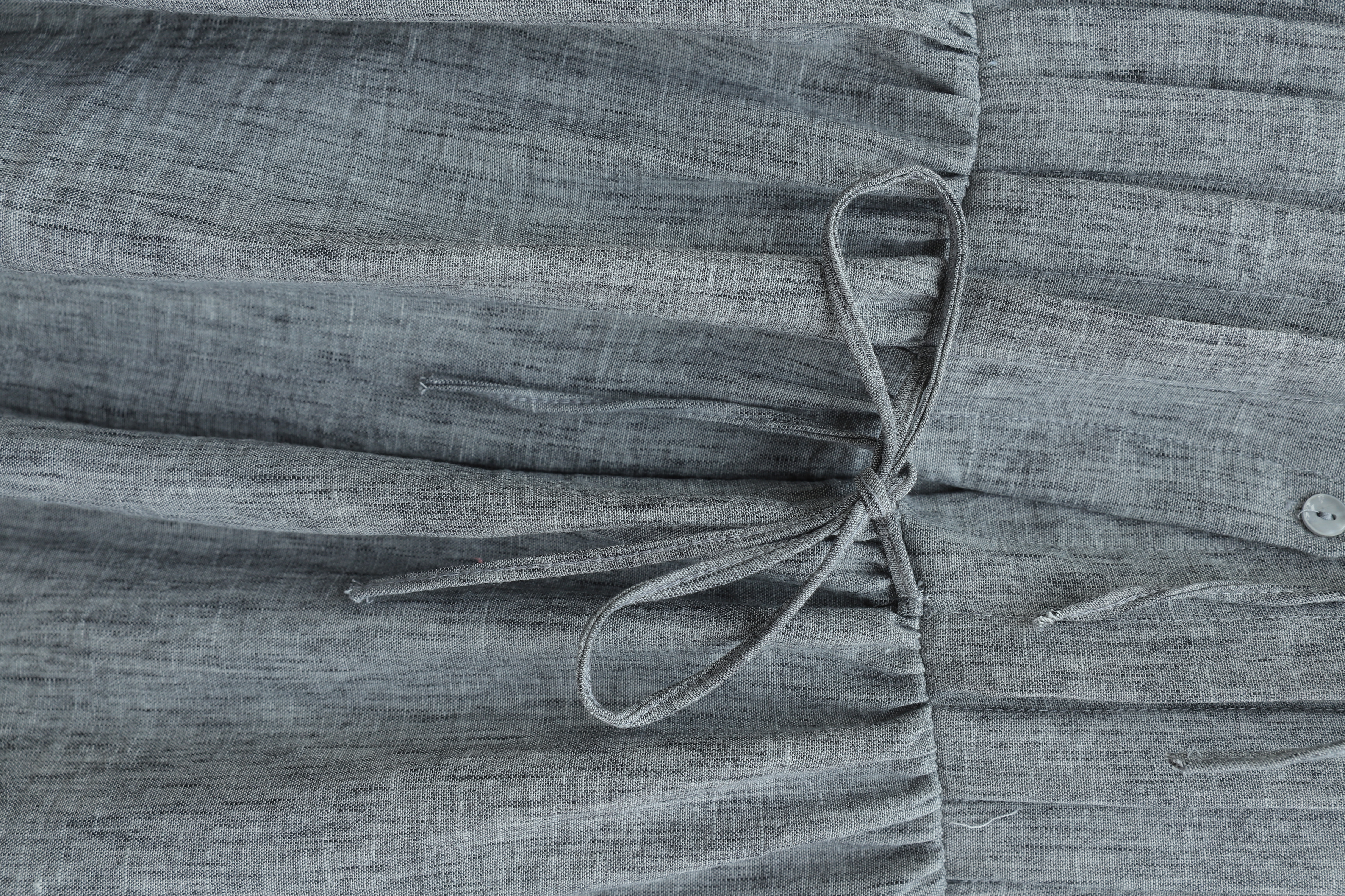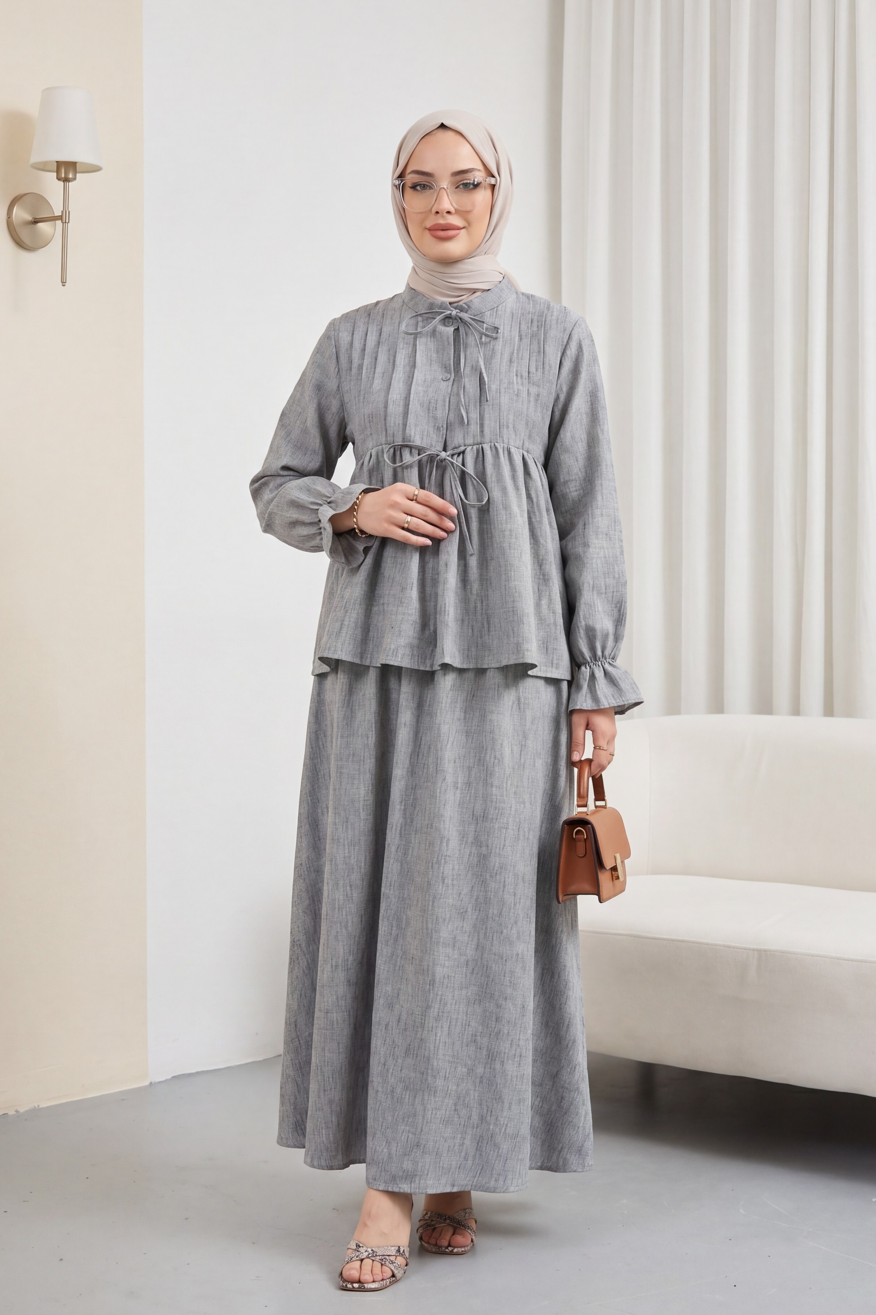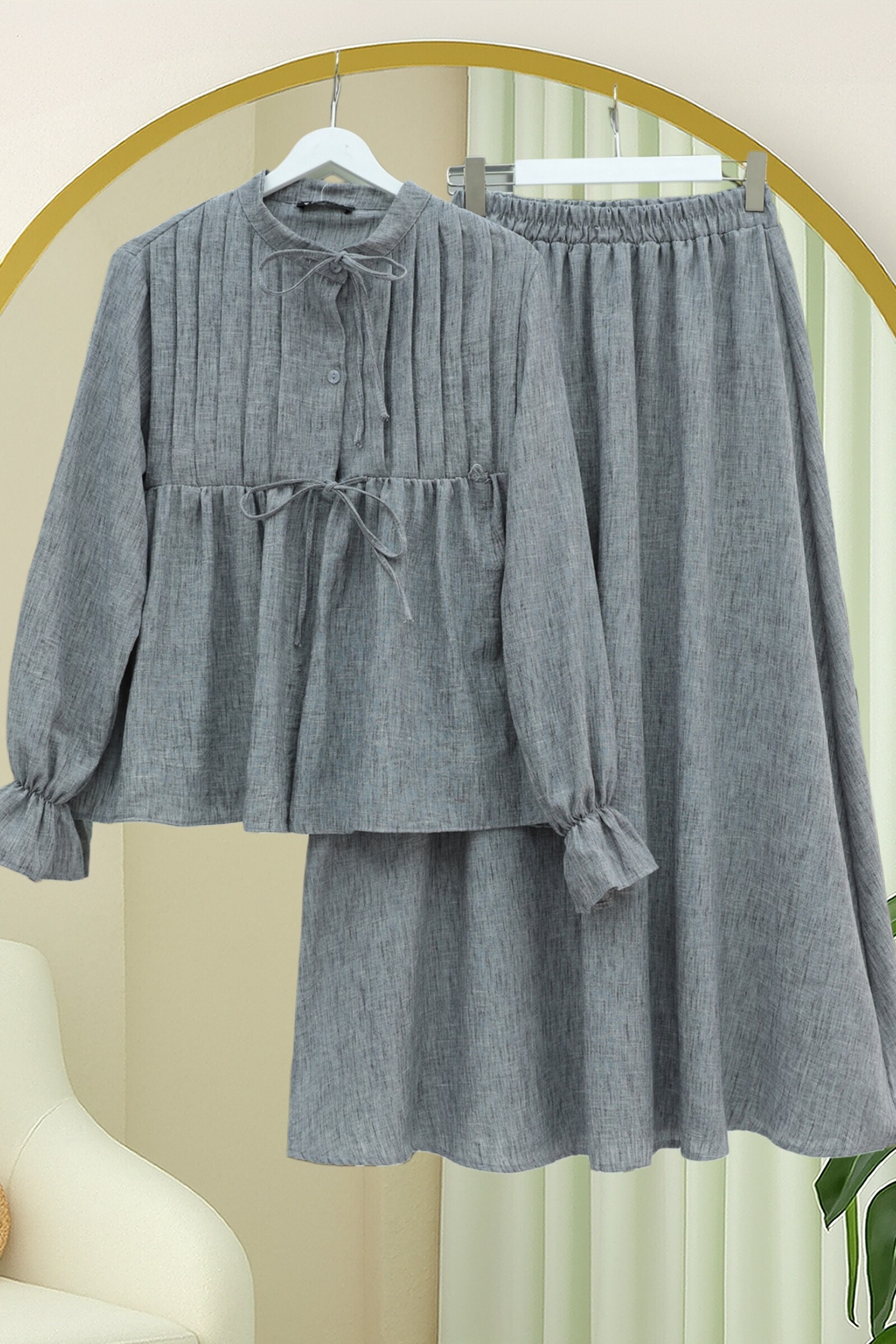 طقم تنورة من الكتان بنصف أزرار وأكمام مطاطية ورباط أمامي -لون مدخن
