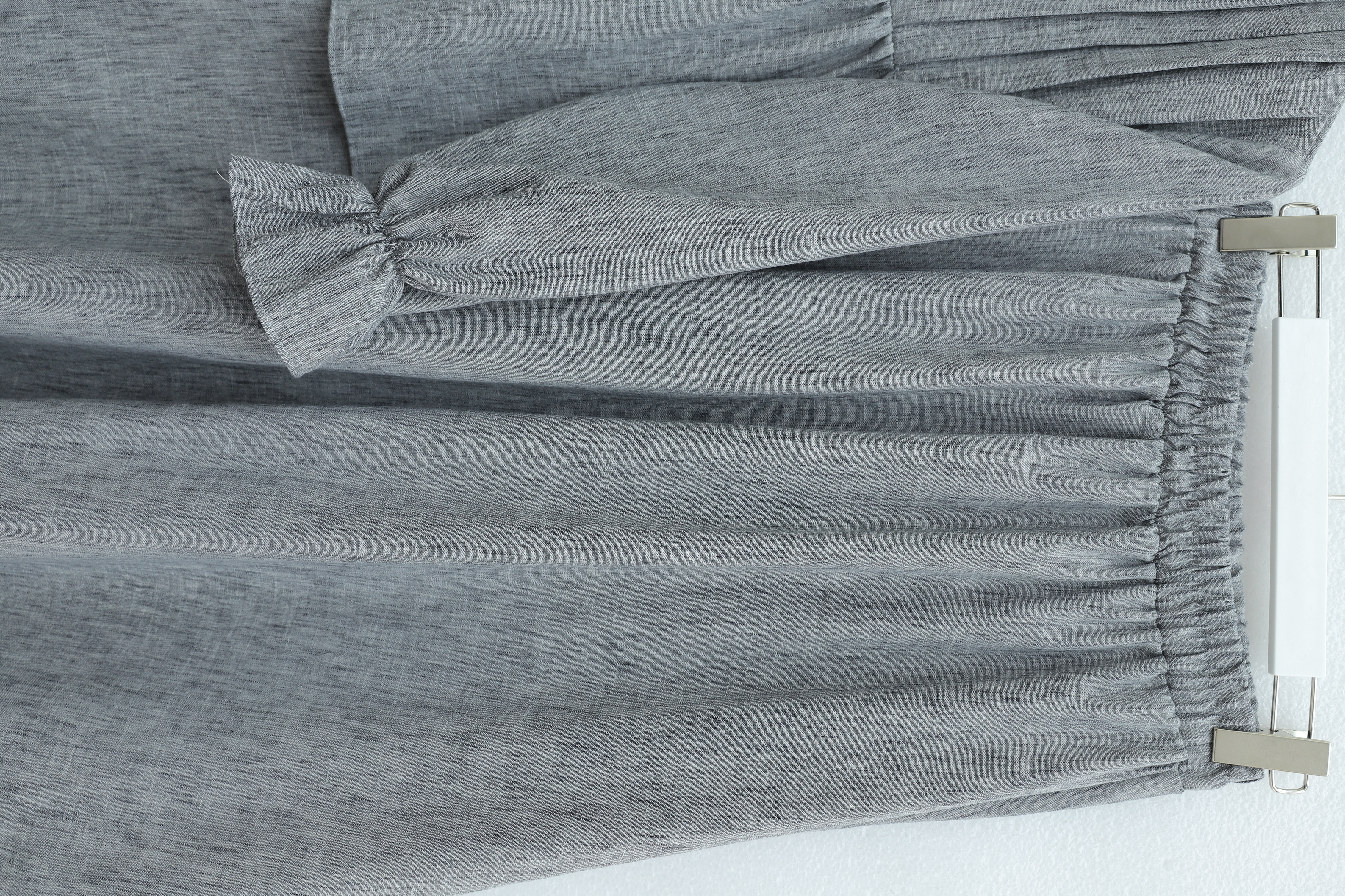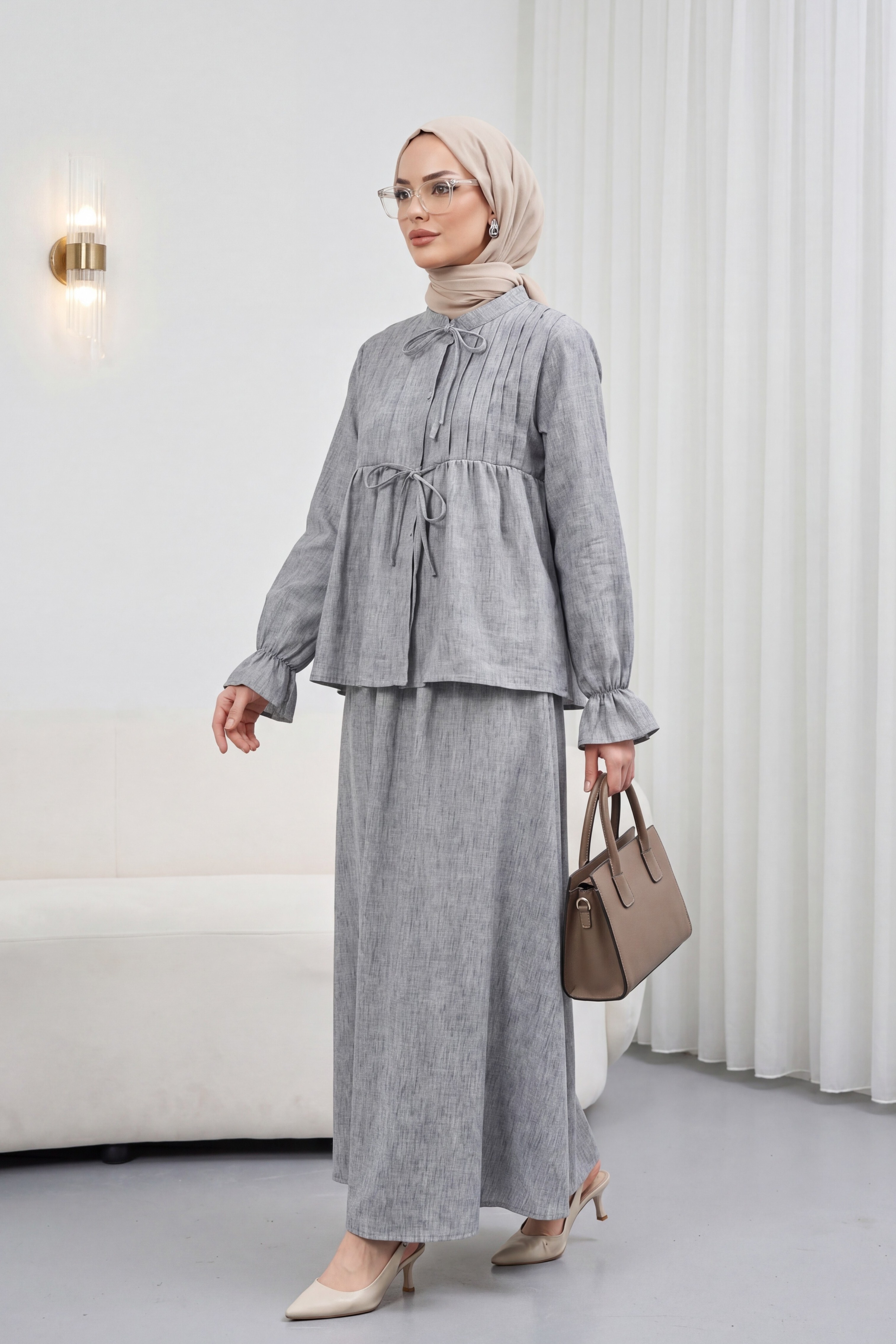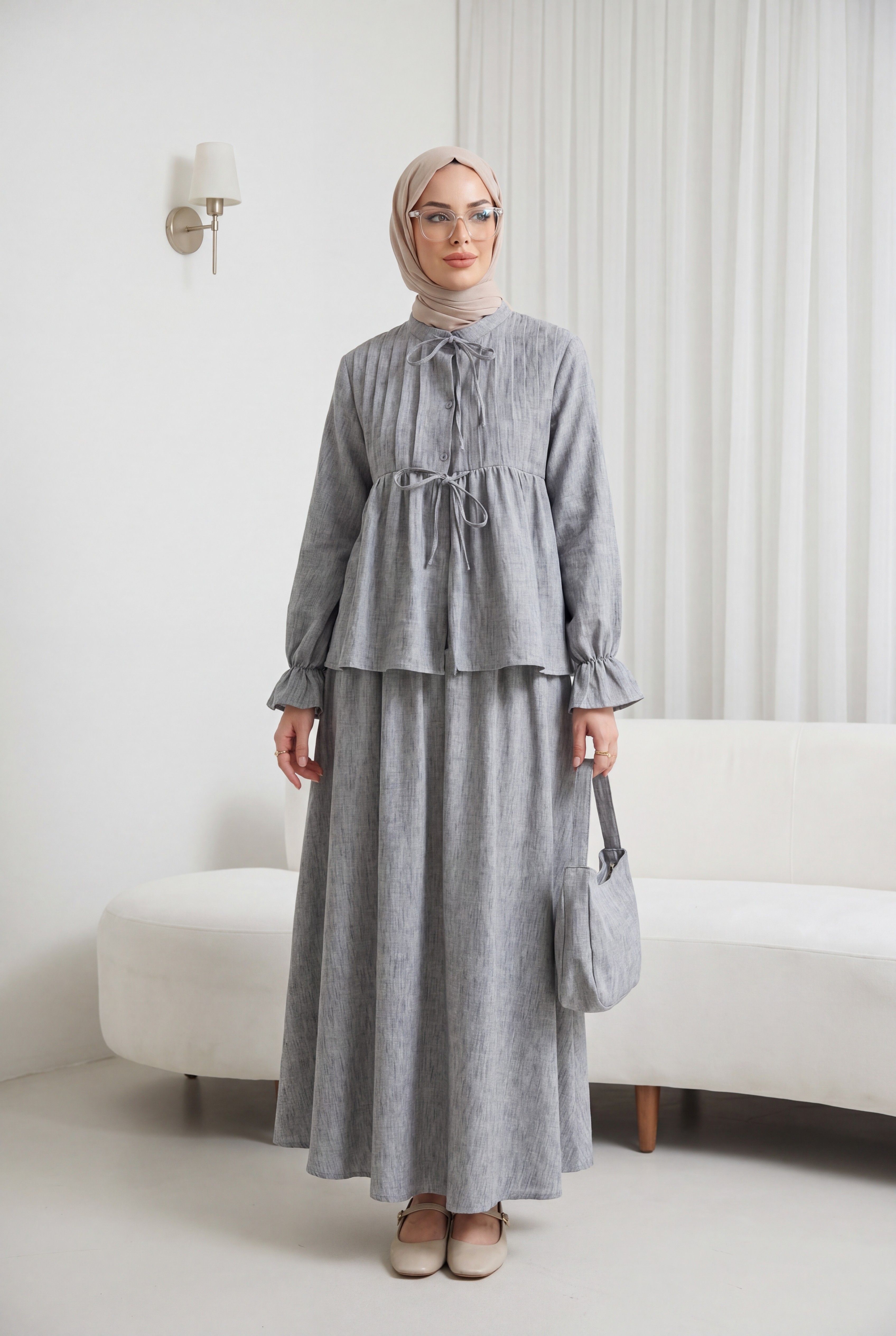 طقم تنورة من الكتان بنصف أزرار وأكمام مطاطية ورباط أمامي -لون مدخن