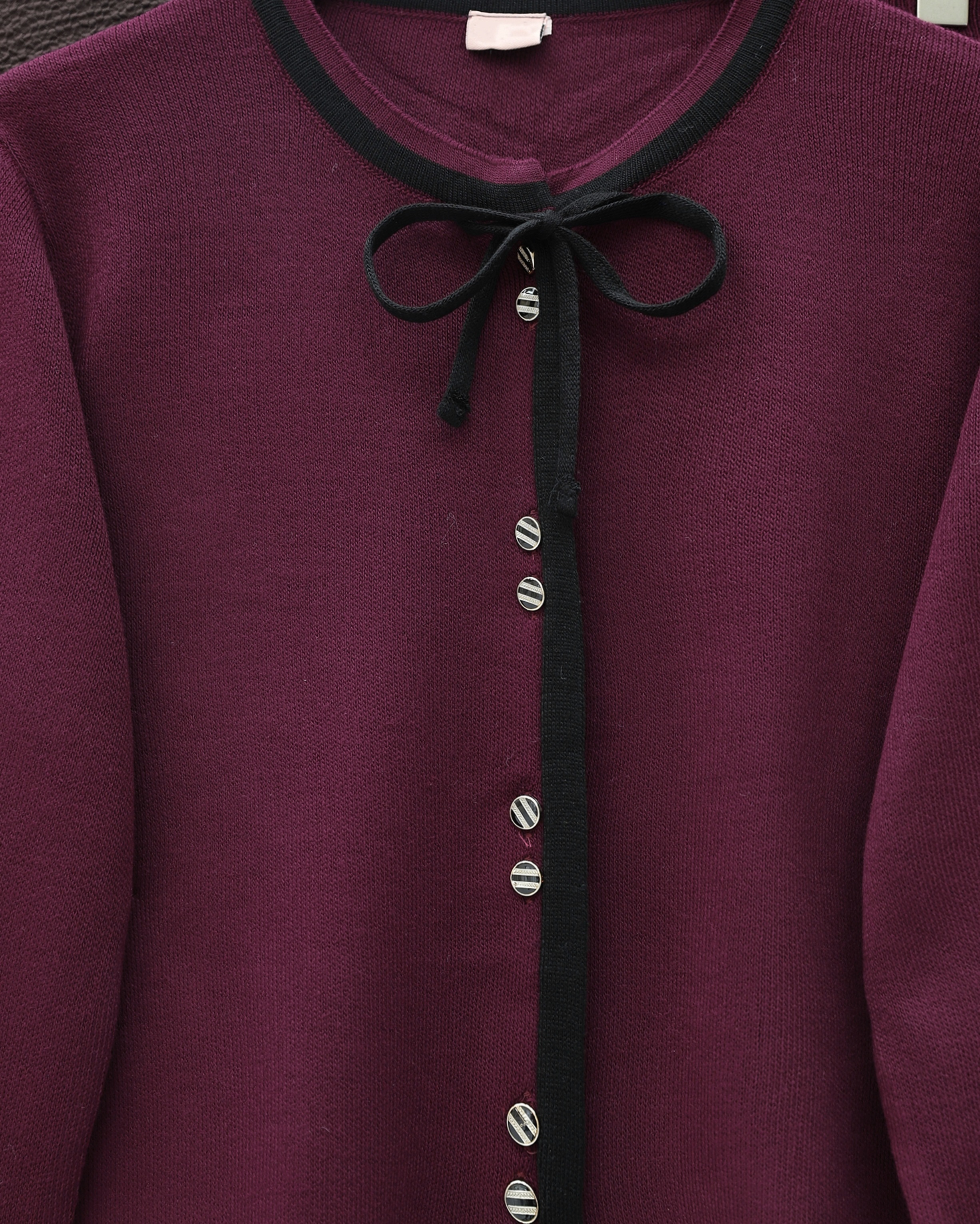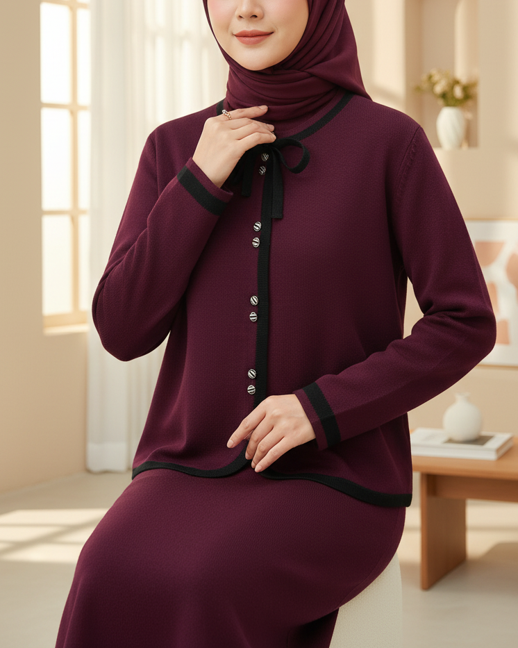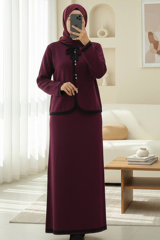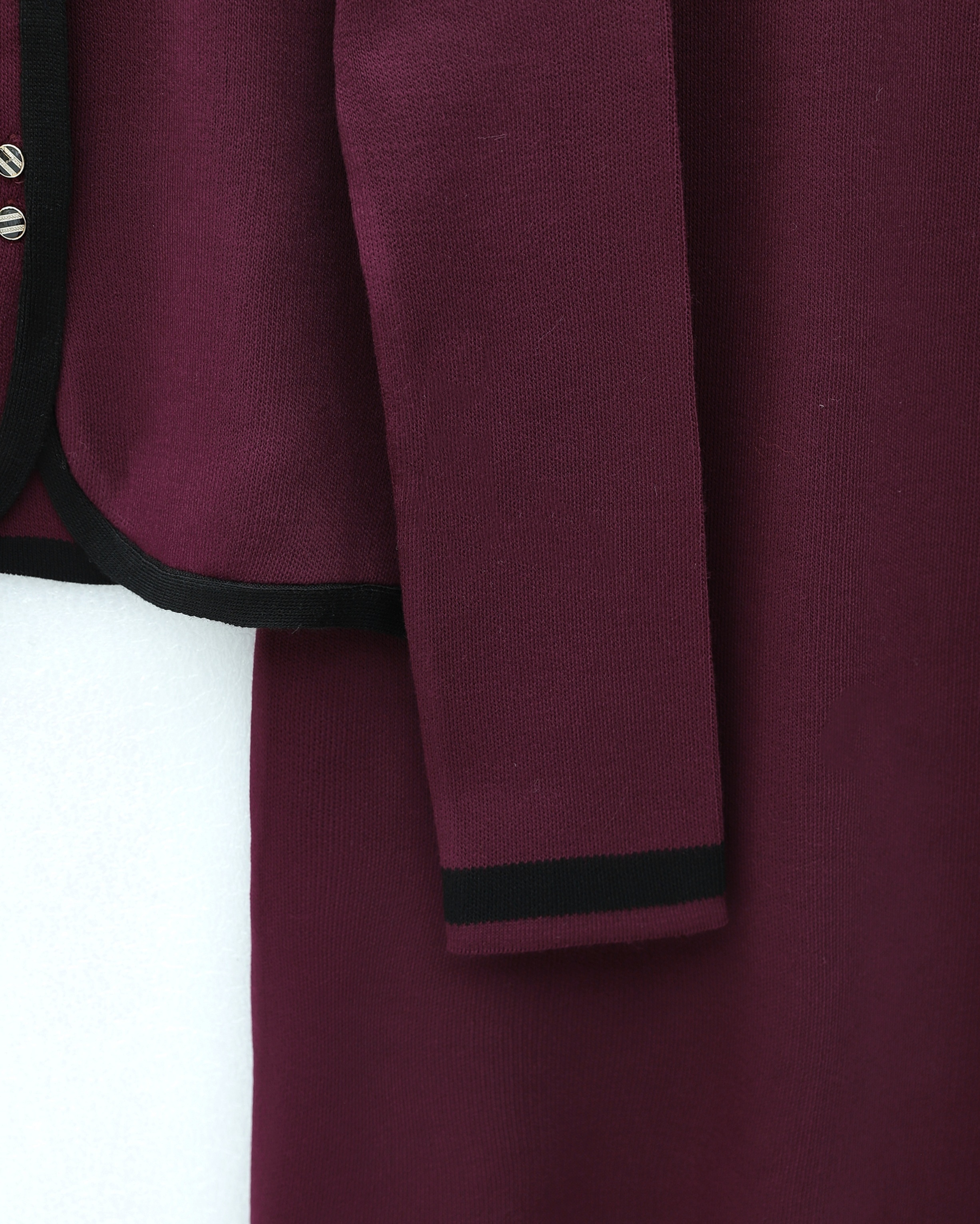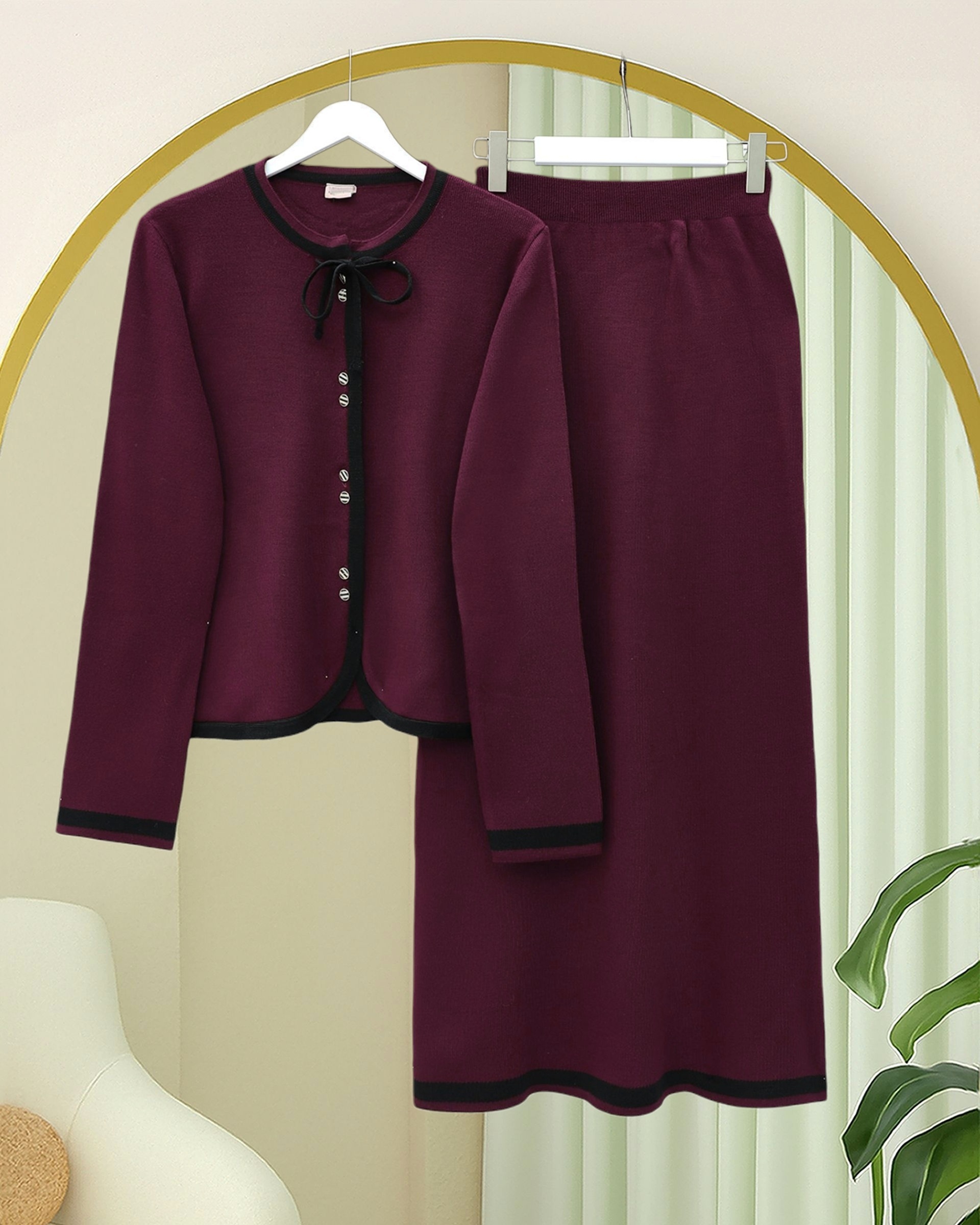 بدلة محبوكة بتفاصيل دانتيل وتنورة مخططة بأزرار -بوردو